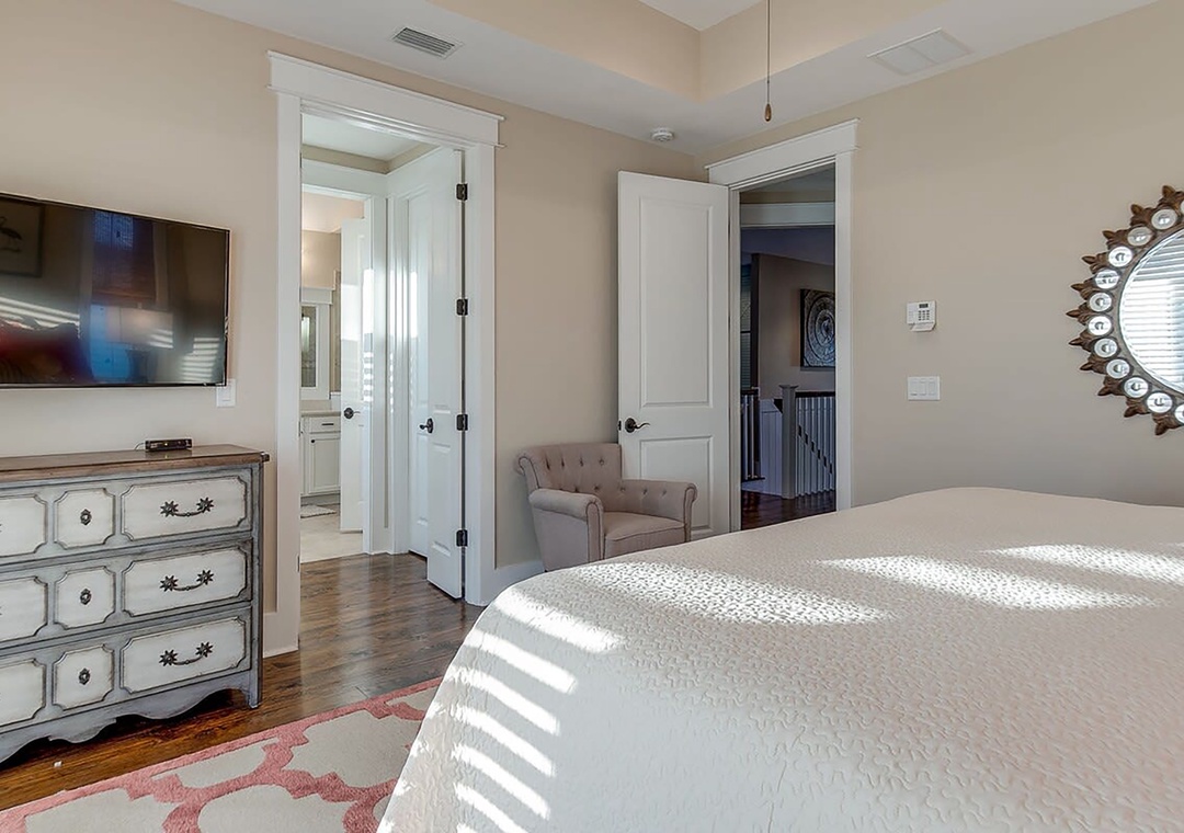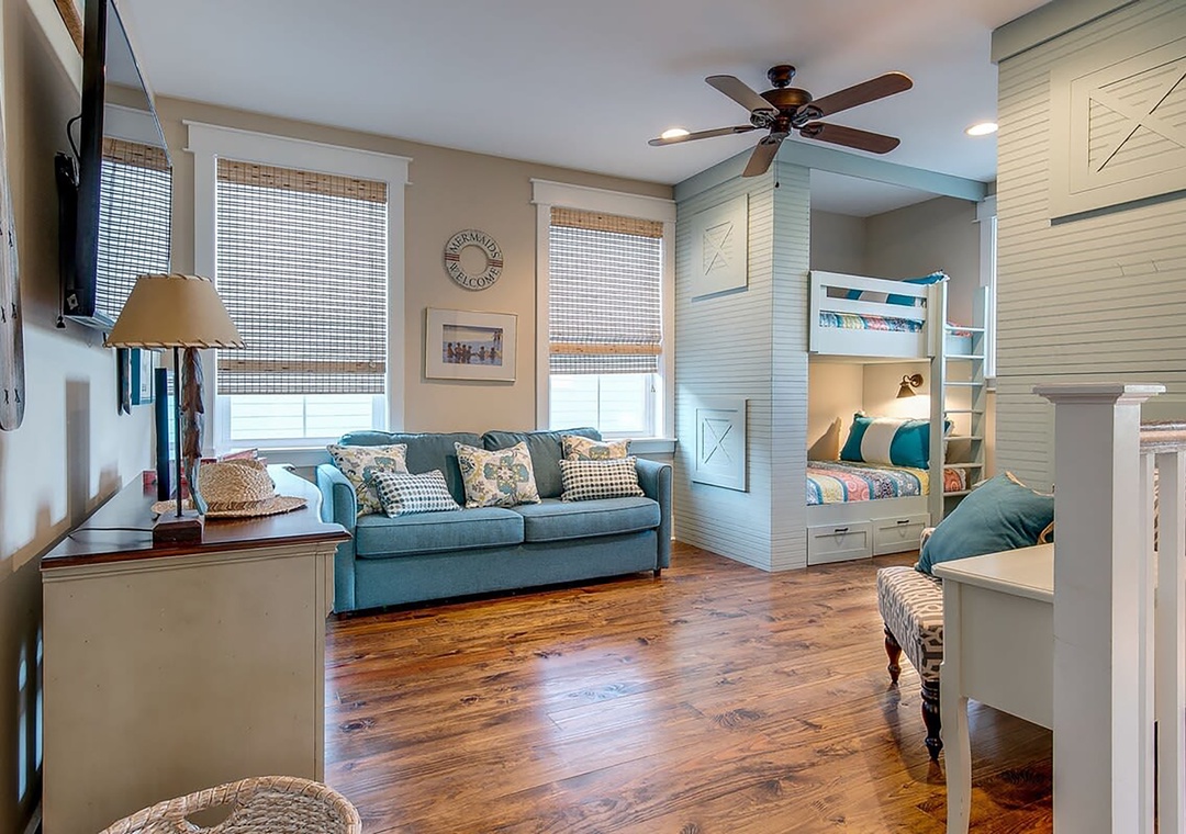 Tucked away in the serene NatureWalk 30A Resort Community, Gram's Beach Spot is the perfect retreat for your next vacation. This charming home features 3 bedrooms, 3 bathrooms, and comfortably accommodates up to 12 guests. On the first floor, you’ll find an open-concept living space with a cozy sitting area and flat-screen TV, a dining table with seating for four, and a stylish kitchen equipped with stainless steel appliances, marble countertops, and a breakfast bar that seats three. A guest bedroom with a queen bed and private ensuite bathroom is also located on this level, offering a quiet and convenient space for relaxation. Upstairs, the spacious master suite boasts a king bed, a luxurious ensuite with a soaking tub and walk-in shower, and plenty of room to unwind. Another guest bedroom with a queen bed and a versatile loft area — featuring two twin-over-twin bunk beds and a queen sleeper sofa — makes it perfect for families or groups traveling together.