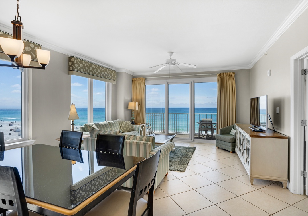 Welcome to Grandview East 301 — your luxurious beachfront retreat on the Emerald Coast! This spacious 3-bedroom, 3-bath condo offers 1,900 square feet of comfort and style, complete with 10-foot ceilings and breathtaking Gulf views from its oversized balcony. Sip your morning coffee while watching the sunrise over the water, or unwind in the evening with your favorite drink as the sun sets.