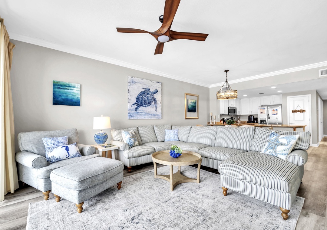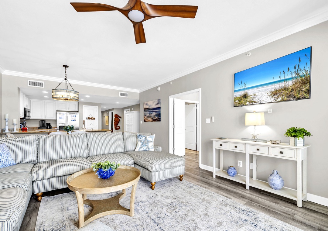Brandi, we appreciate you letting us know that you enjoyed a great stay in this well-appointed, beautifully decorated three-bed, two-bath beachfront unit in Panama City Beach, which you found to be clean. We will forward your suggestion regarding the living room television to property managers. Thank you for choosing Real Joy.Real Joy staff