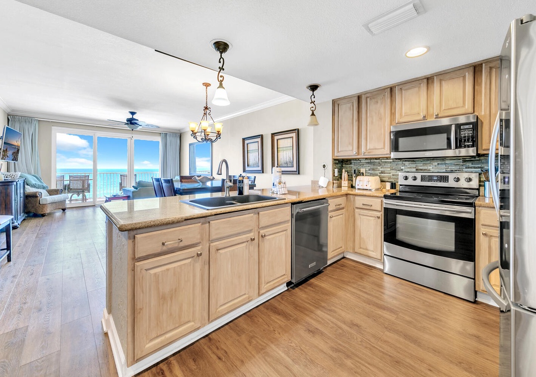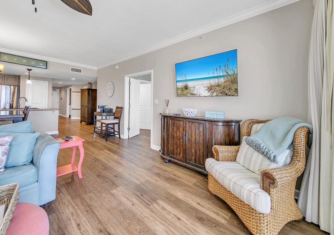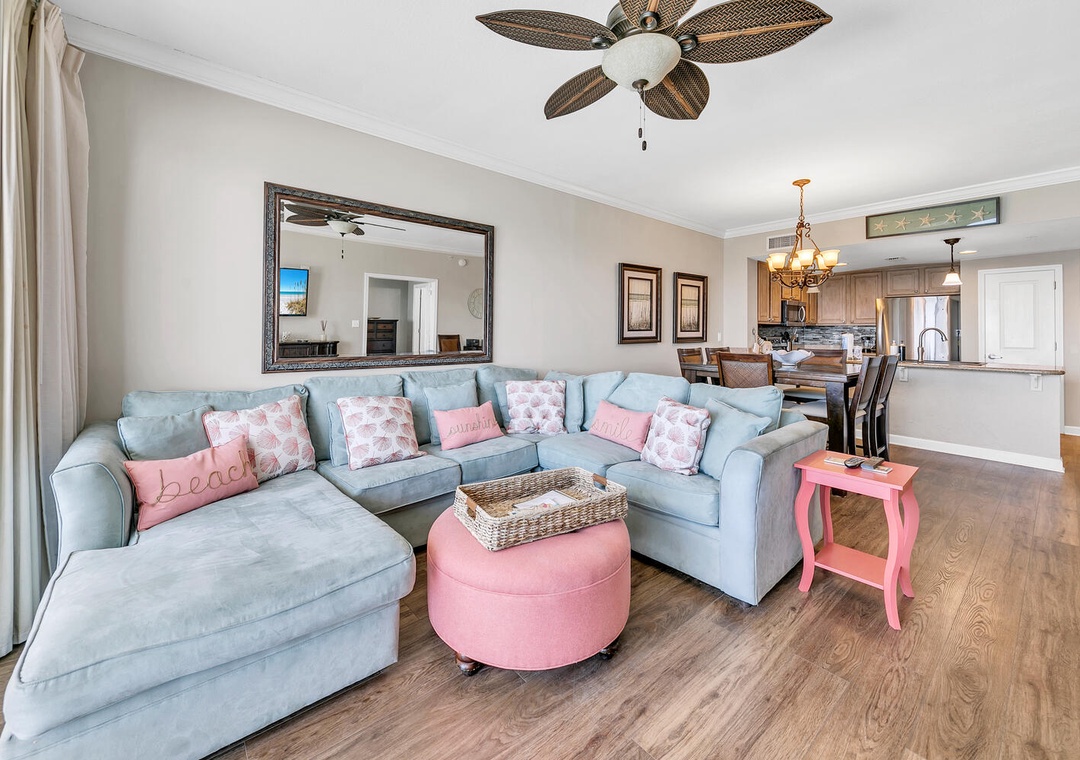 Welcome to Grandview East 702, your ultimate beachfront retreat on the enchanting Emerald Coast! This beautifully adorned 3BR/2BA condo, nestled on the 7th floor, offers breathtaking views right from your cozy living space. Immerse yourself in the coastal charm with contemporary furnishings carefully chosen to captivate you from the very start. The fusion of a beachy vibe and refined decor creates a delightful ambiance that exudes Southern charm. Unwind and savor your favorite drink on your private balcony, soaking in the mesmerizing sight of the powdery white sand beach and the rhythmic dance of waves against the shore. The master bedroom boasts a luxurious king bed, while the second bedroom features another king bed, and the third bedroom is equipped with a comfy full bed—providing ample space for up to 6 guests to relax and rejuvenate. Come join us in crafting everlasting beach memories at Grandview East 702—where the sun, sand, and sea converge to create the perfect backdrop for a lifetime of cherished moments!