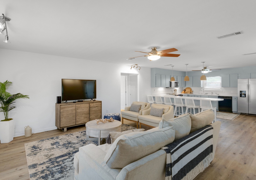 House is beautifully decorated with Joanna Gaines farmhouse/beach decor, very clean, kitchen was well stocked with everything we needed. Back porch got sun in the morning and the front porch was wonderful for afternoon sun and relaxing. Beach is about a 4 minute walk, very close and the walk through to the Red Bar is on the other side of the first house towards the beach, about a 6 minute walk. The 4 Bikes were a plus and the additional beach chairs in the garage were appreciated. And there was more than enough parking for the amount of people and vehicles we had. Nothing bad to comment on. Definitely recommend staying here!!- Reviewed On: 10/13/2021
