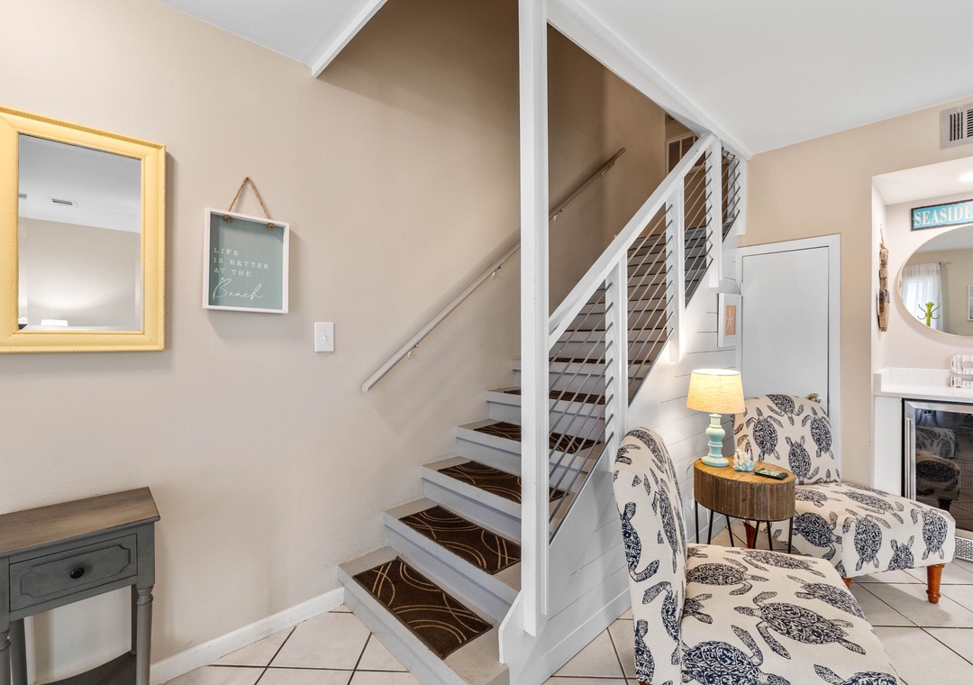 Located only 200 yards from the sugar-white sands of Miramar Beach, Gulf Winds East #35 is your next beach vacation paradise! Ideal for couples or small families, this beautifully decorated townhome sleeps 6 comfortably with a king bed in the master, and a queen bed, and a twin over twin bunk in the guest room. Both bedrooms are upstairs with en suite bathrooms and each has its own private balcony. On the first floor, you will find a comfortable living room with a large flatscreen TV, wet bar, plenty of seating, a dining area, one half bath, tons of natural light and two separate, private patios (front and back). There is also a stackable washer and dryer conveniently located on the first floor. The fully equipped kitchen is also on this floor and has been recently updated with stainless steel appliances and new countertops. With private (gated) beach access, a community pool, and two private balconies, you can relax in this family-oriented townhome with everything you need for the ultimate beach vacation!