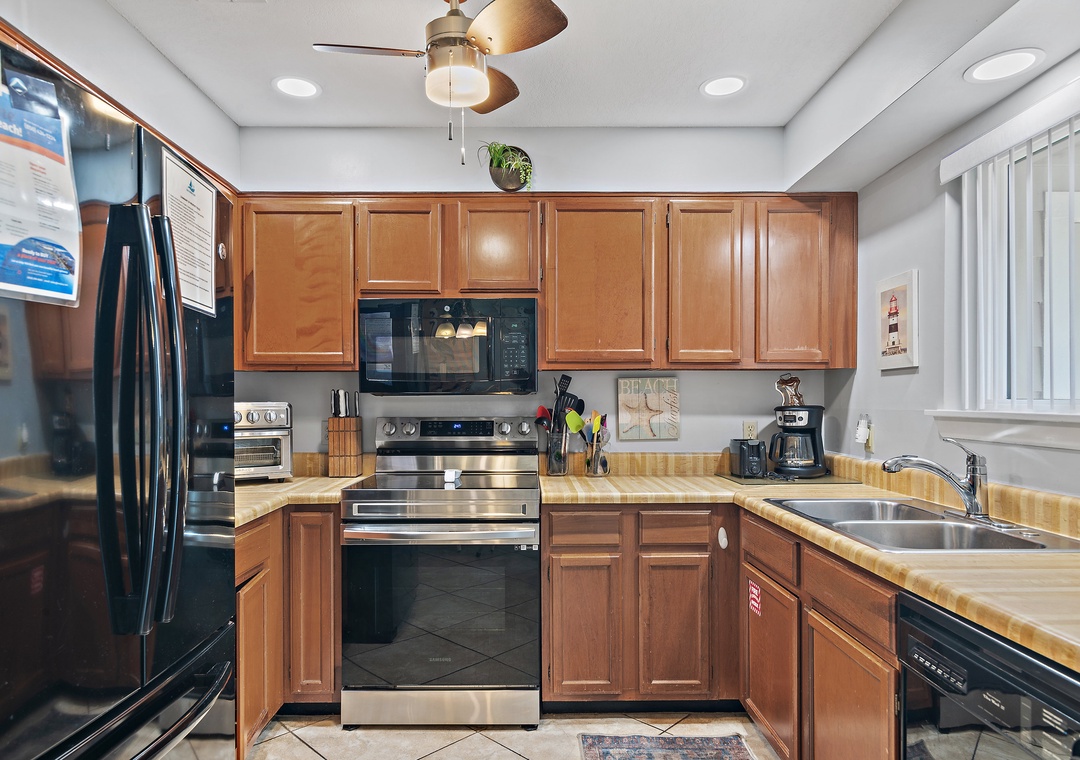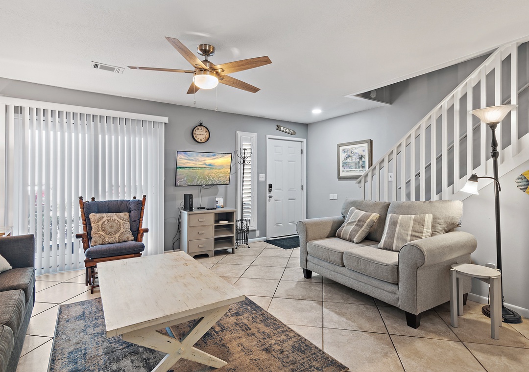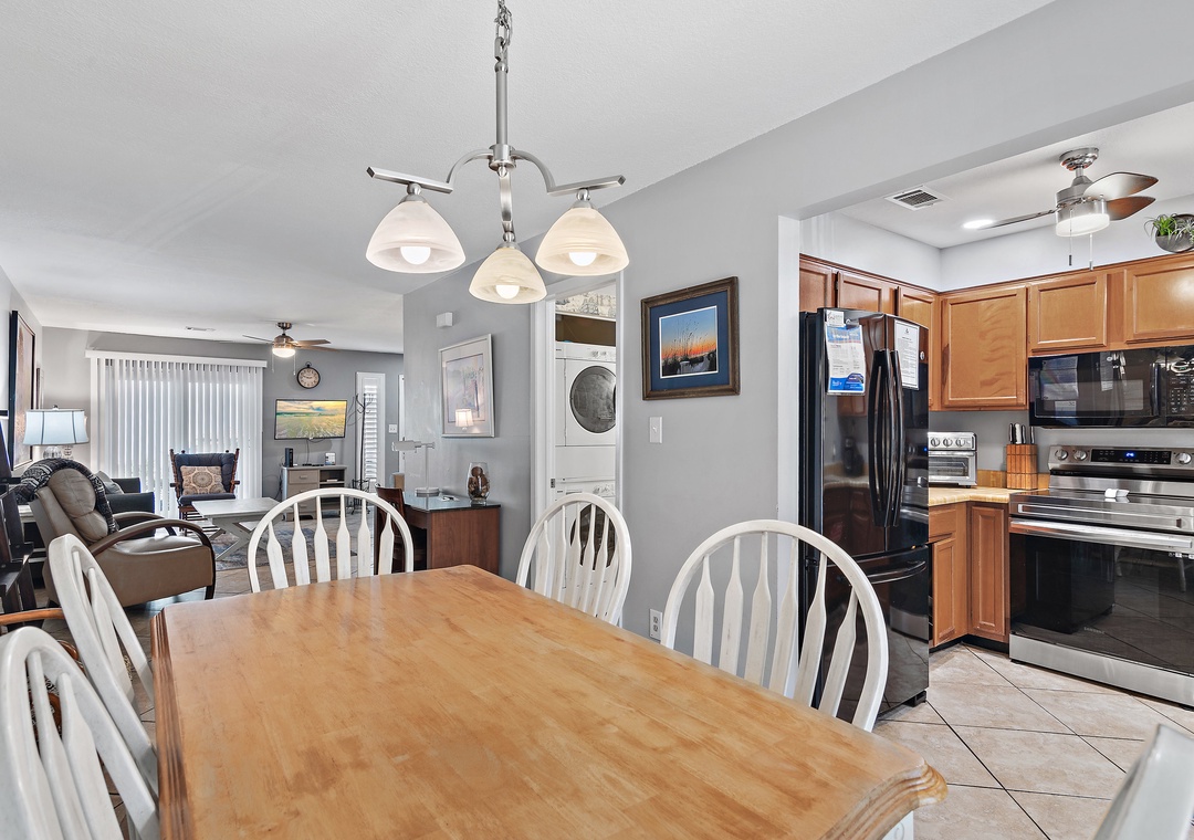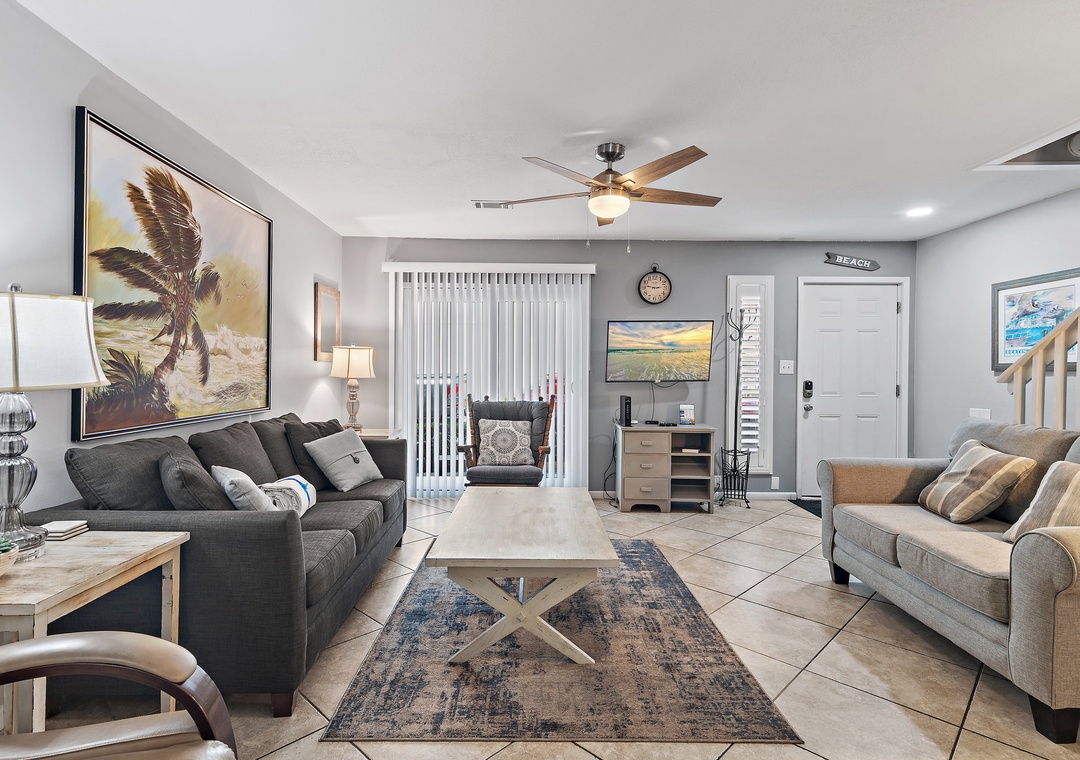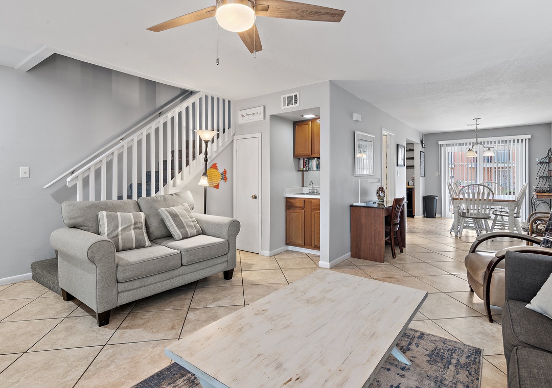 Welcome to Gulf Winds East #51, a comfortable and spacious 2BR/2.5BA townhome located just a short stroll from the sugar-white sands of Miramar Beach. This coastal retreat sleeps up to 6 guests with a king bed, queen bed, and a sleeper sofa, making it ideal for small families or couples traveling together. On the first floor, you’ll find an inviting living area perfect for relaxing after a day at the beach. The open-concept layout includes a fully stocked kitchen with everything you need to prepare meals, a dining area, a convenient wet bar, and a half bathroom that also houses a washer and dryer for your convenience. Upstairs, the two bedrooms provide a quiet and restful retreat. The primary suite features a king bed and a newly renovated en-suite bathroom, while the second bedroom includes a queen bed and access to its own renovated full bathroom as well. Each bedroom also offers access to a private balcony where you can enjoy the warm breeze.