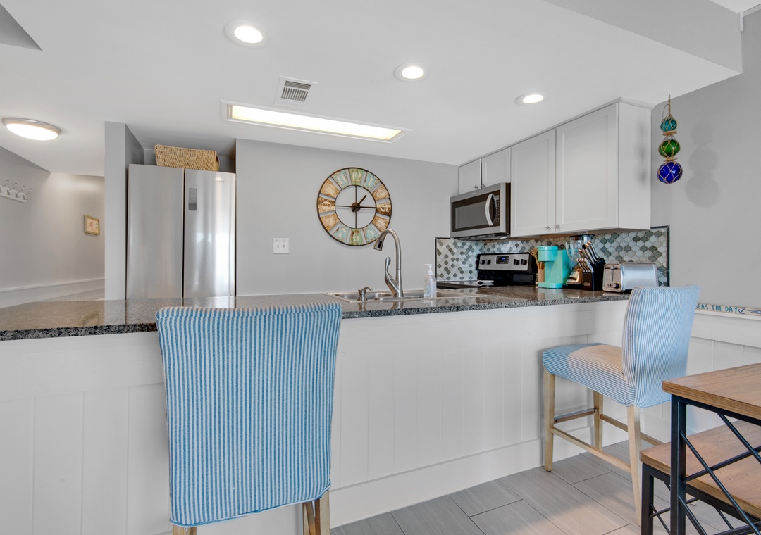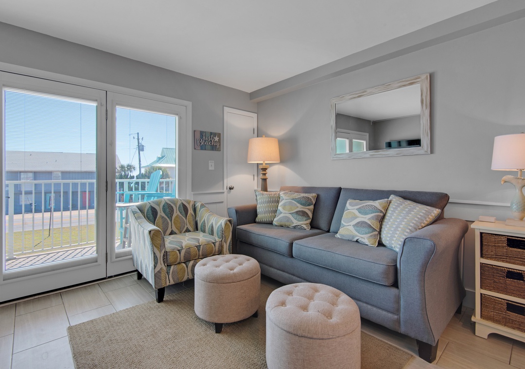Gulfview I 216- Just Beachy is located only 150ft from the sugar white sands of Miramar Beach! Just across the street, gated access to 200ft of private beach awaits you. This 1BR/1BA, 2nd floor condo has a spacious living; dining area with a balcony to sit and enjoy the salty air. The open kitchen has been updated to feature granite countertops and stainless steel appliances and includes an eat-in bar with seating for 3. The unit is located in close proximity to the complex's pool. Ideal for couples or families, Gulfview I 216- Just Beachy sleeps 4, with a king bed in the bedroom, and a sleeper sofa in the living room. Come relax in this quiet, family-oriented complex and have everything you need for the ultimate Emerald Coast vacation!