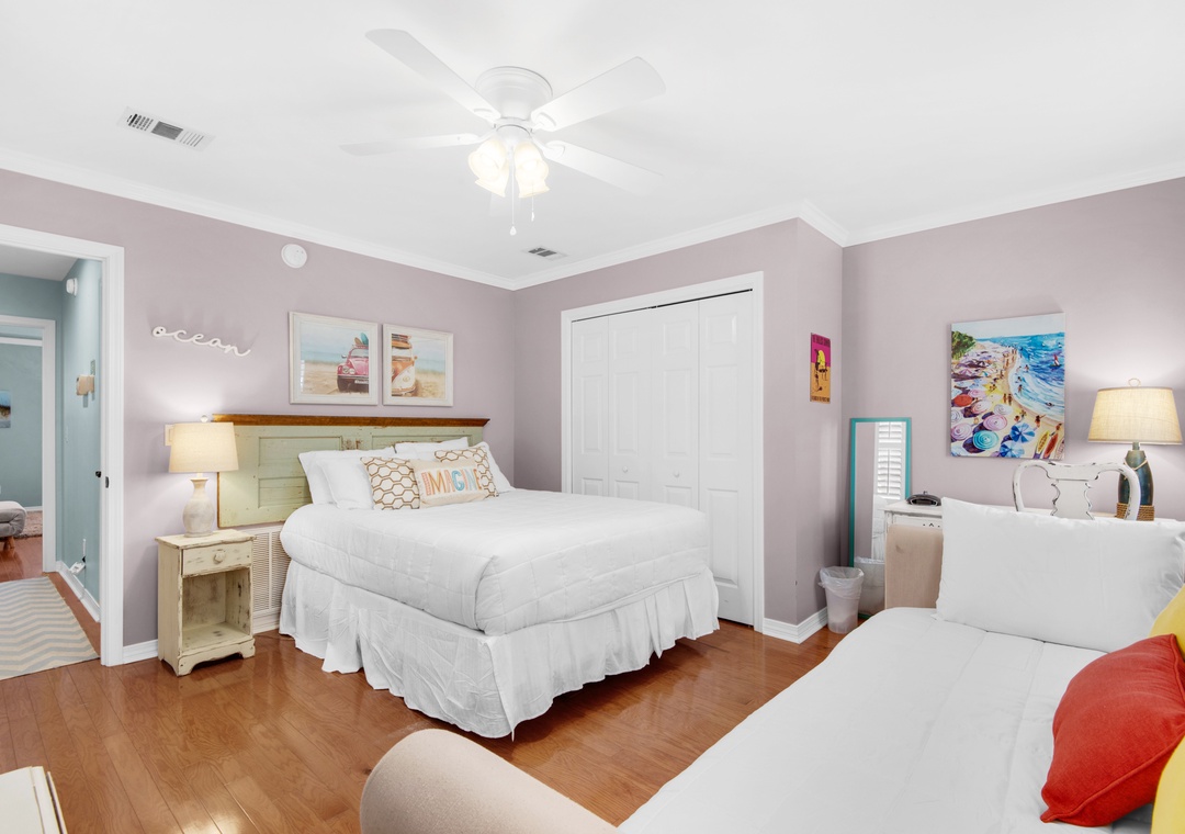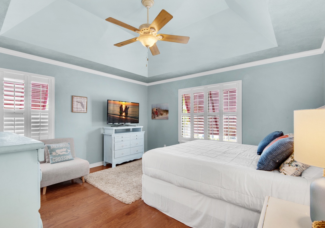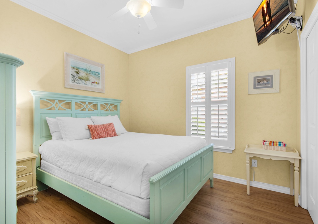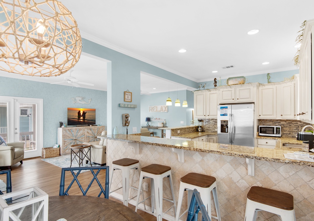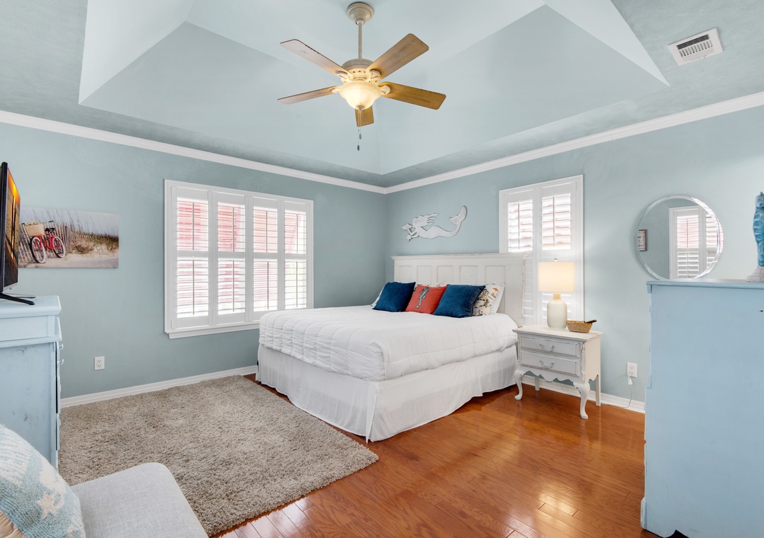 Step into Heart and Sol, a charming beach residence complete with a pristine white picket fence in Crystal Beach. This 4-bedroom, 2-bathroom abode comfortably accommodates up to 12 guests. The first floor boasts a guest bedroom with a queen bed and another with 2 twin beds. Ascend to the second floor to discover the master bedroom, featuring a spacious suite with a vaulted ceiling, double vanities, a jetted tub, and a walk-in shower. Additionally, there's a guest bedroom with a full bed and twin trundle.
