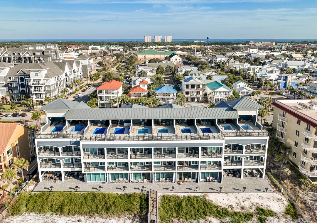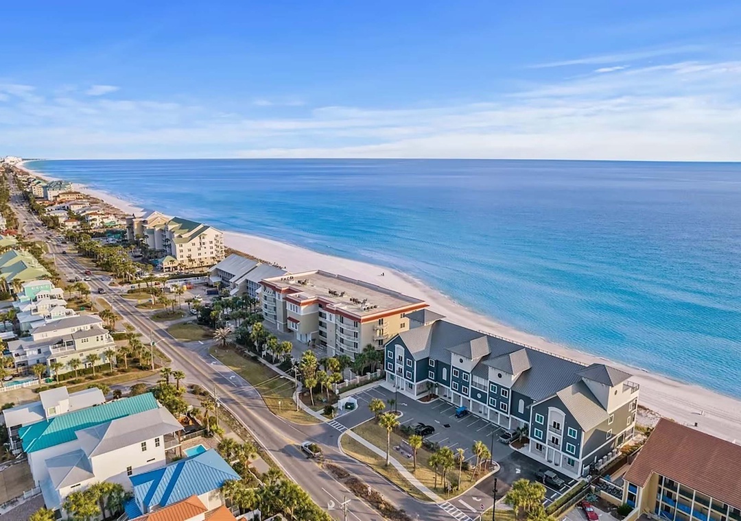 First of all - location, location, location! This row of 3 story townhouses is right on the beach. The views are amazing! We saw dolphins frolicking every morning! There is a shared walkway from the front of the complex to the beach, with a shower/foot washer to remove sand.. The complex is less than a 5 minute walk to the Henderson Beach Resort. The beach itself is beautiful - clean, soft, white sand and emerald water.