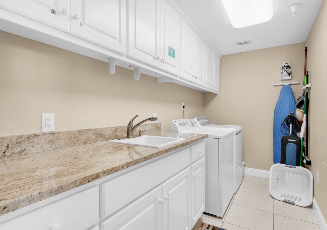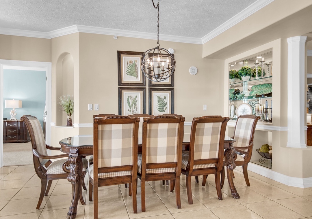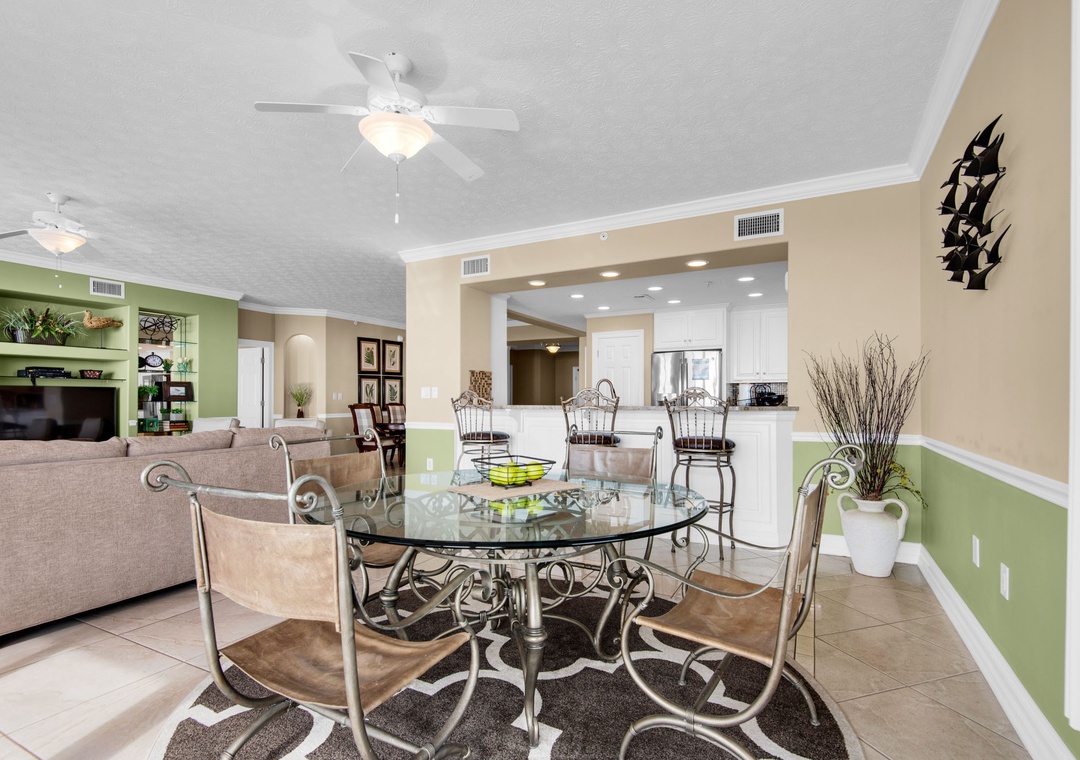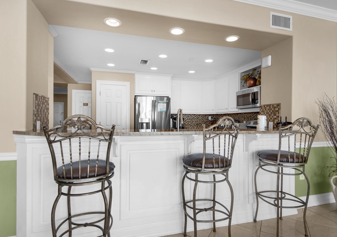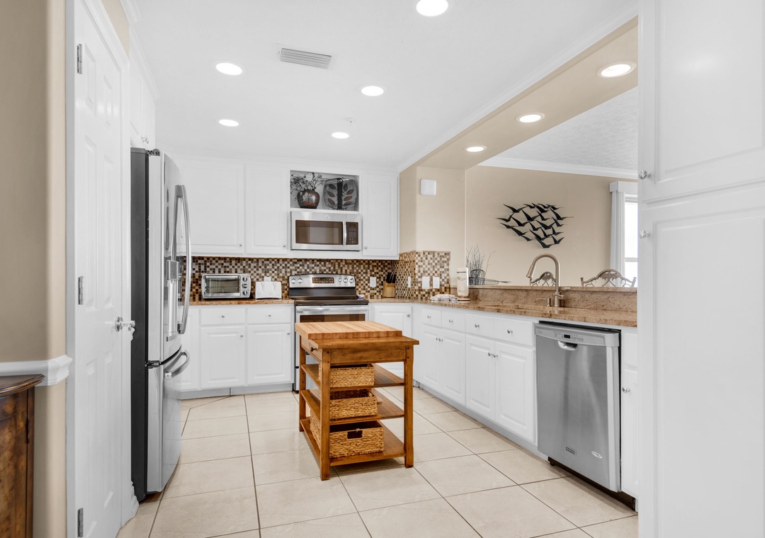 The unit is beautifully appointed with granite countertops, stainless steel appliances, and an oversized laundry room. Entertainment options abound with DVD/Blu-Ray players in every TV, perfect for a cozy movie night. The fully stocked kitchen is ideal for culinary enthusiasts, complemented by a formal dining room seating 8 and additional space at the eat-in bar for 4.