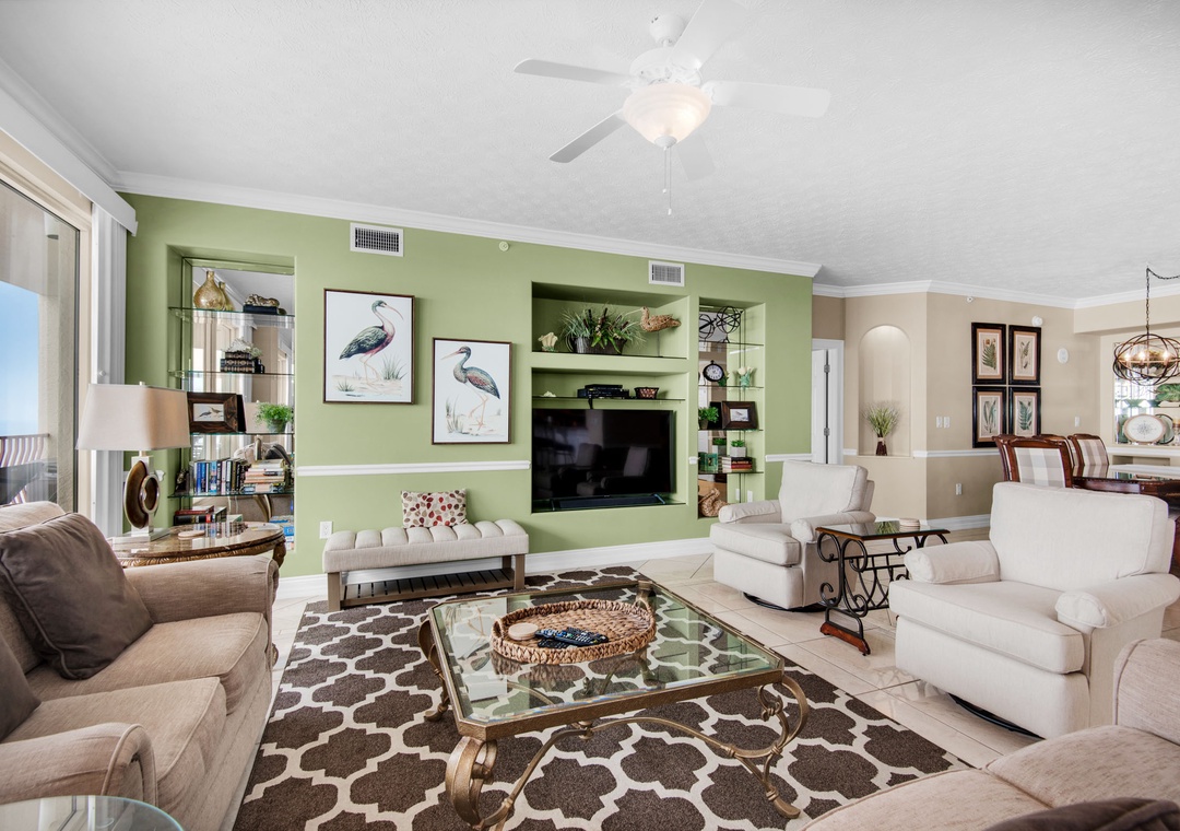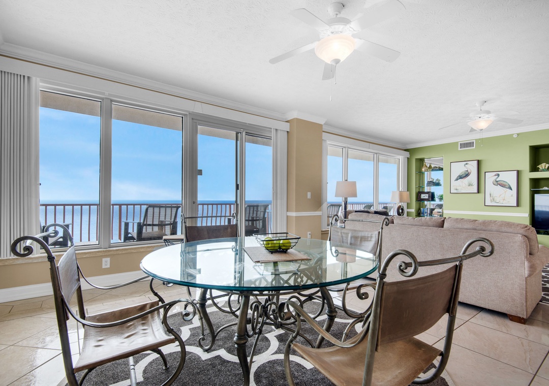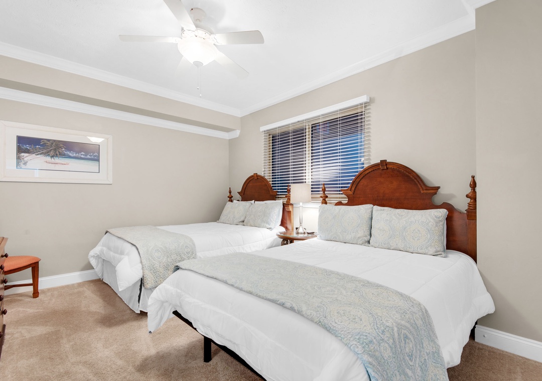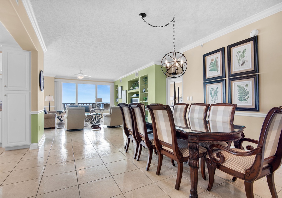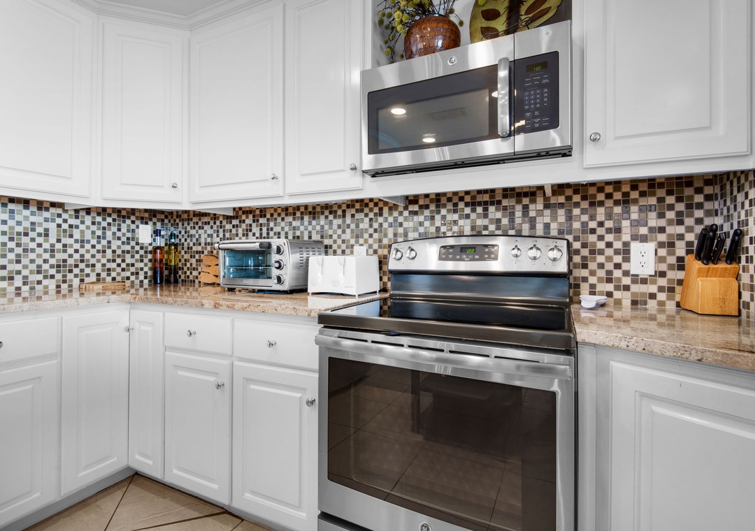 The unit is beautifully appointed with granite countertops, stainless steel appliances, and an oversized laundry room. Entertainment options abound with DVD/Blu-Ray players in every TV, perfect for a cozy movie night. The fully stocked kitchen is ideal for culinary enthusiasts, complemented by a formal dining room seating 8 and additional space at the eat-in bar for 4.