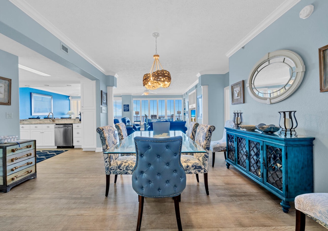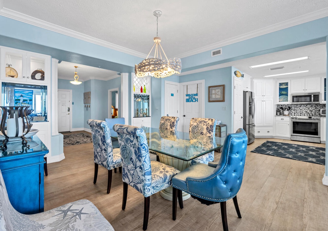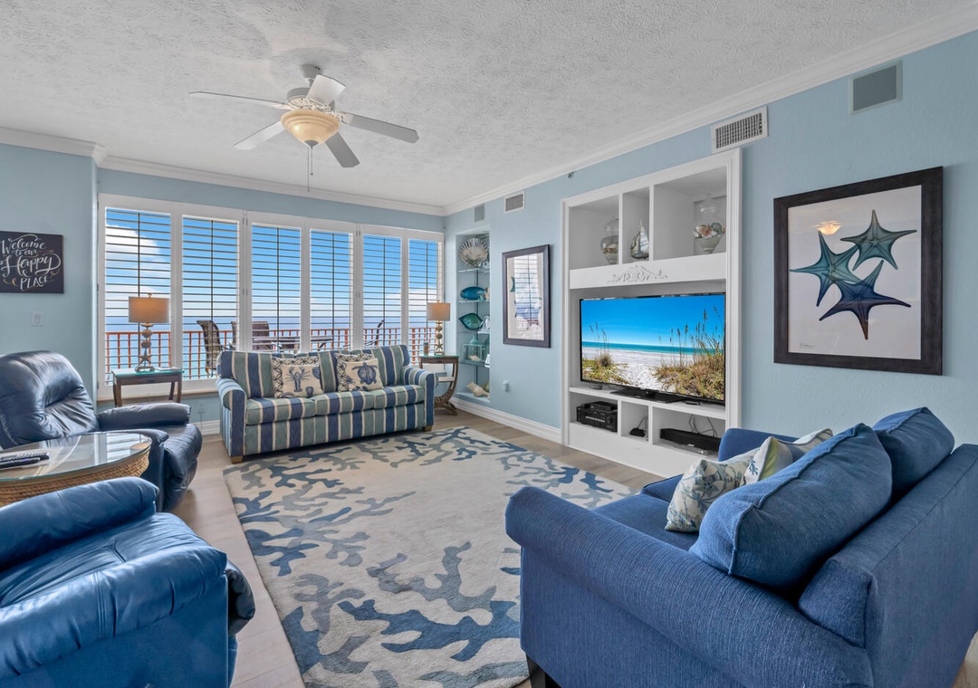 Find beachfront bliss at Hidden Dunes 1704! This spacious 3-bed, 3-bath unit has over 2300 sq ft of living space. Take in spectacular, floor-to-ceiling views of the Gulf of Mexico from the 17th-floor balcony. The master bedroom has a king-size bed and balcony access, boasting a brand new 64" smart TV. Attached to the master bedroom is a huge, beautiful bathroom with a jetted tub. In the first guest room, you will find a king-sized bed, and in the second guest room, you will find two queen beds. For an additional sleeping room, there is a sleeper sofa in the living room. This unit comfortably sleeps up to 10 people! The stocked kitchen is perfect for all the chefs in your family. Enjoy a meal and family time around the formal dining room table. All TVs in this unit have DVD players, so bring your favorite discs and enjoy a movie night after a long day on the beach. The massive balcony is a must-see! This balcony has enough seating for everyone to watch the waves crash against the white sand. Come and see this amazing unit for yourself, you will be back to Hidden Dunes 1704 again and again!