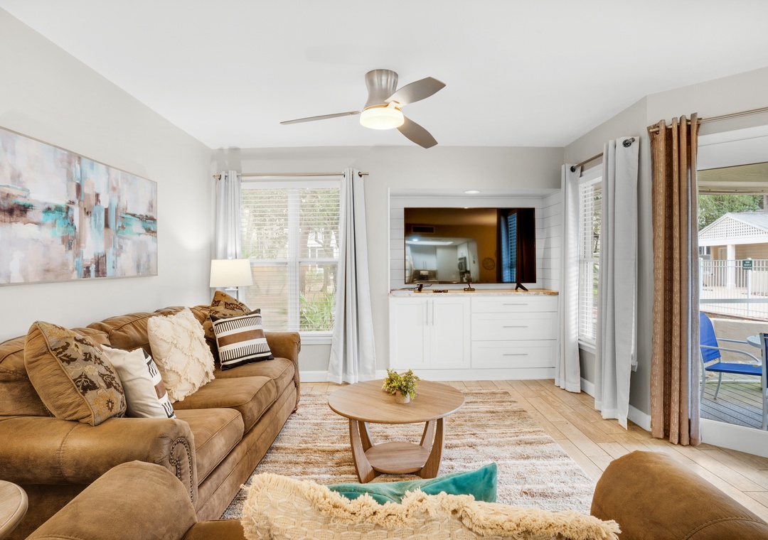 Welcome to Dune Our Thing, a serene ground floor 1BR/1.5BA beach cottage in Hidden Dunes of Miramar Beach that has it all - location, amenities, and privacy. The cottage has a particularly rare location, cornered by a glistening swimming pool on one side and a long stretch of one of Hidden Dunes' water features on the other. All the natural beauty of Hidden Dunes acreage is easy on the eyes and easy to enjoy via Cottage 208. Its bright interior boasts white cabinetry in the kitchen, bathrooms, and entertainment consoles which are nicely set off by cool tile floors and granite counters. There is a washer/dryer in the unit for your convenience. There are plenty of windows that allow in abundant natural light, and you will love the screened, furnished porch, the perfect spot for enjoying a meal or drink outdoors. The master bedroom has a king bed and an ensuite full bathroom. There is a half bath for guests and a sleeper sofa in the living room, accommodating 4 guests comfortably. Hidden Dunes offers several on-site amenities such as multiple pools, a hot tub, a lake with a fishing pier, a horseshoe pit, a basketball court, professional quality tennis courts, a playground and outdoor grills. Make Dune Our Thing your next dream vacation escape!