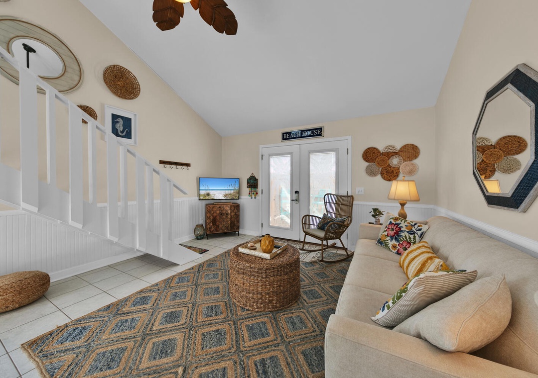 Inside, enjoy a fully equipped kitchen, a spacious living area with comfortable seating, and an outdoor patio perfect for sunset cocktails. The master bedroom features a king-sized bed for restful nights, while the guest loft offers two queen beds, comfortably accommodating up to 5 guests. A washer and dryer are included for convenience.