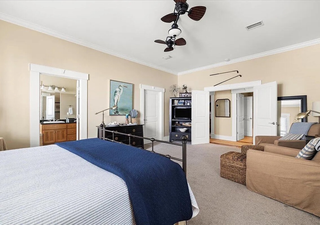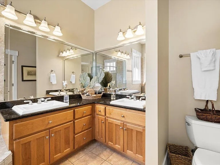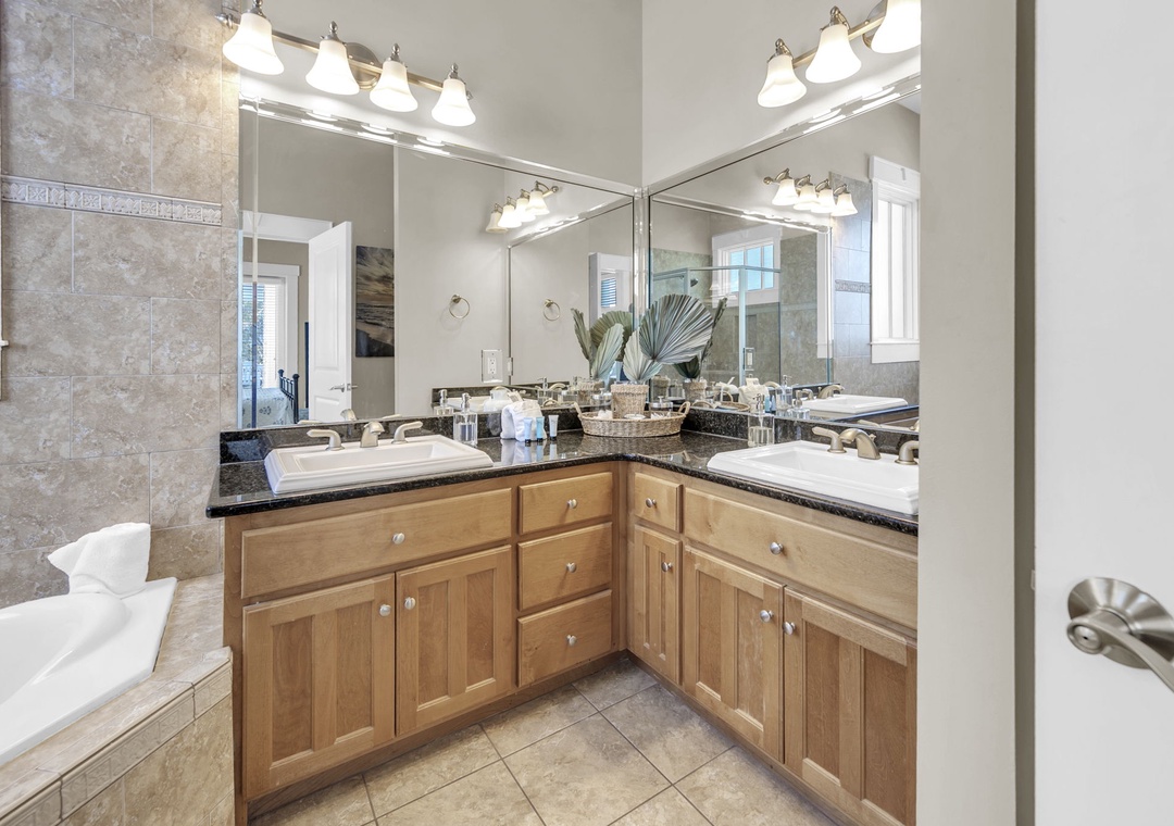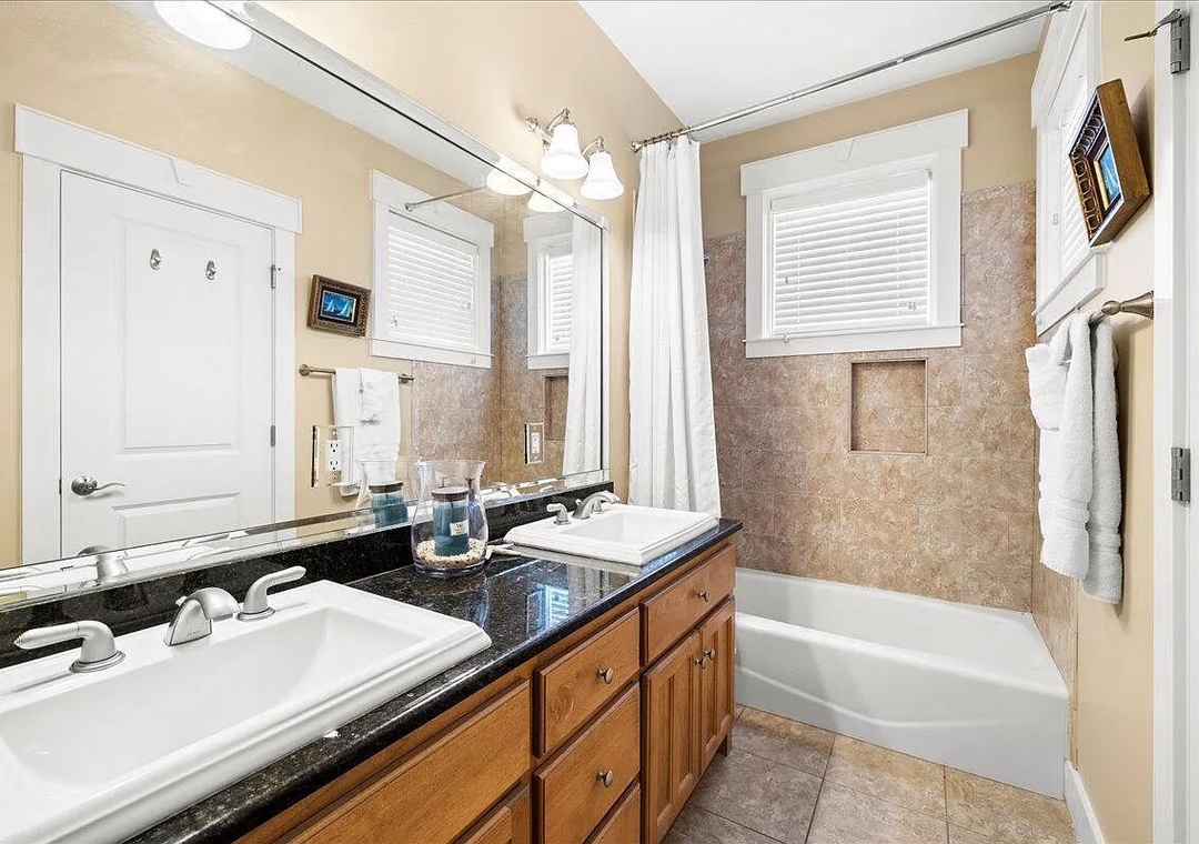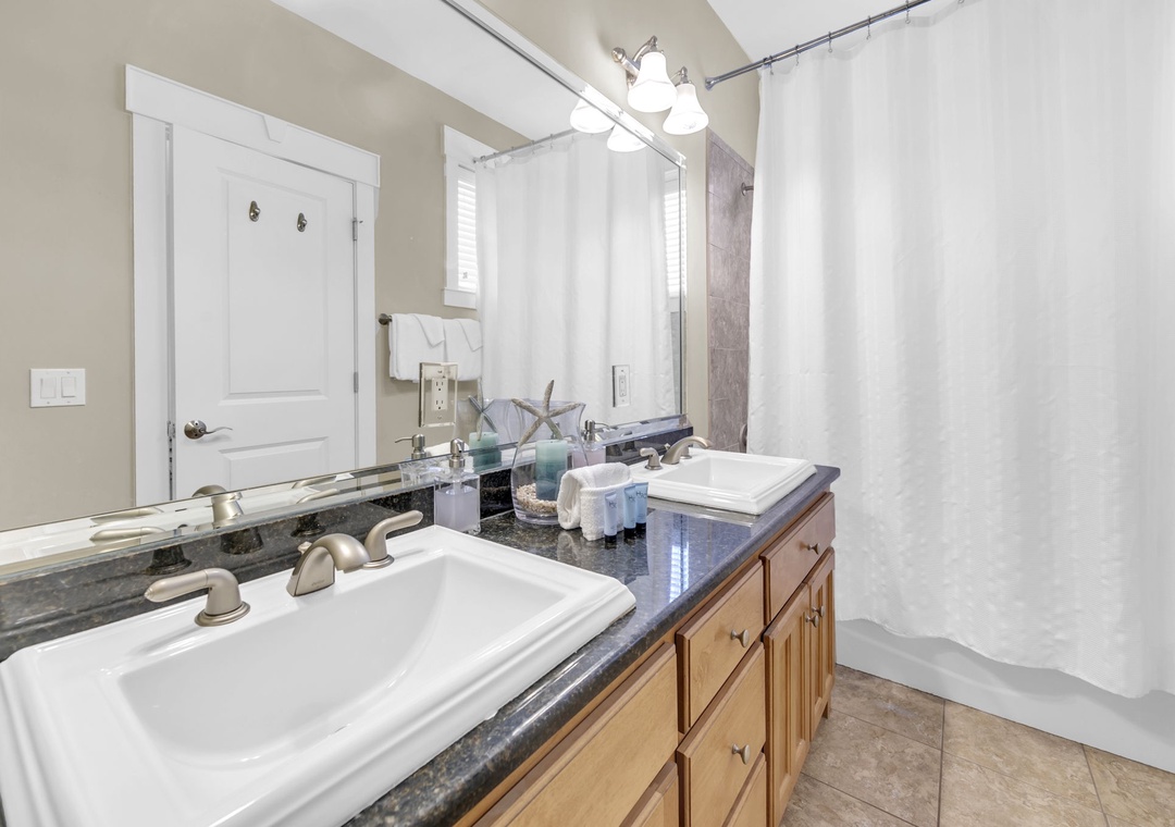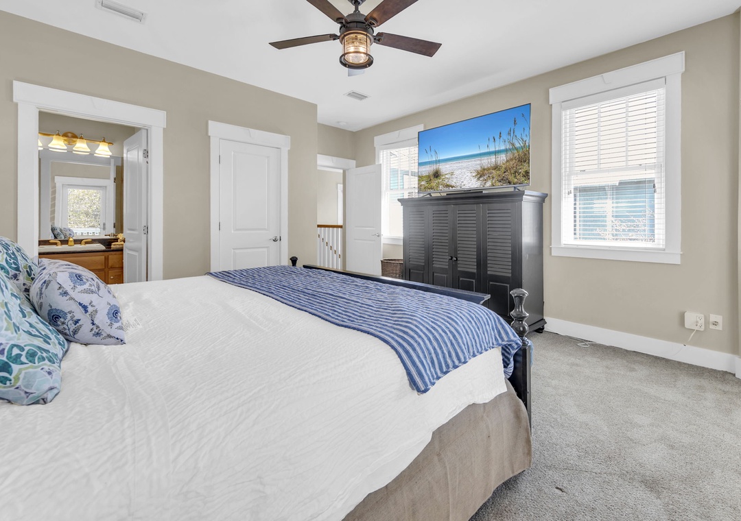 Upstairs, you’ll find an additional primary suite with a king-size bed and a private bathroom. The fourth bedroom includes two queen beds, offering plenty of space for family and friends.