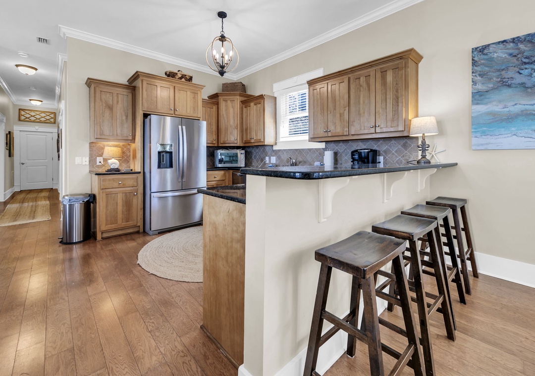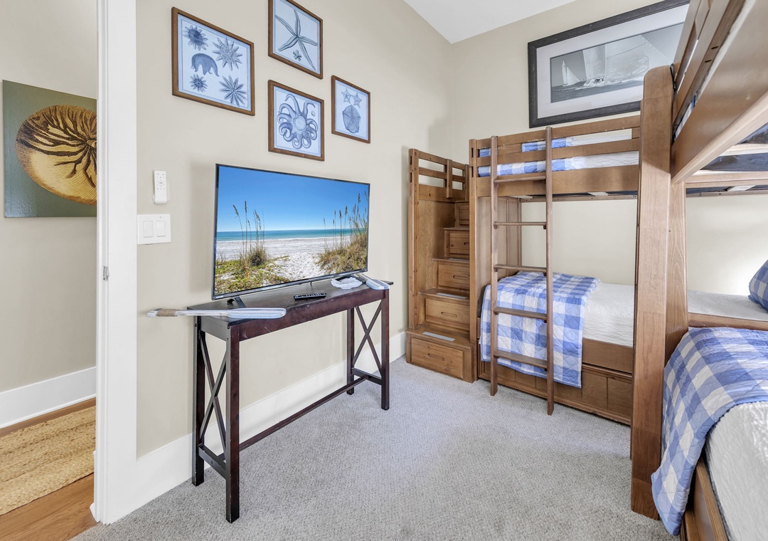 The open-concept kitchen is perfect for entertaining, with seating for six at the dining table and four additional seats at the breakfast bar. The living room includes a 65-inch Smart TV and DVD player for relaxing evenings. The primary suite on this level offers a king-size bed and a spacious private bathroom. A second bedroom features two sets of bunk beds—ideal for younger guests.