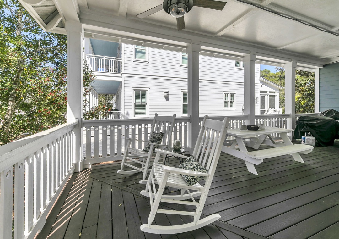 * Spacious wraparound porch on the main level with rocking chairs, plus an upstairs porch off the bedroom, also furnished with rocking chairs