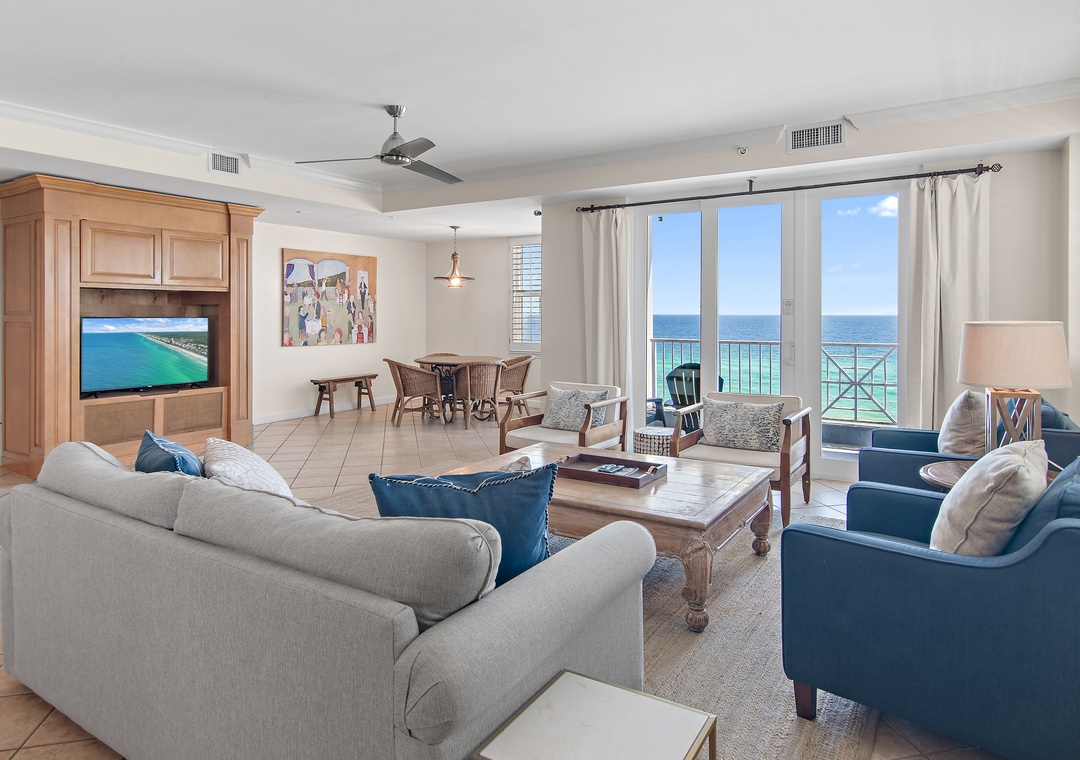 Inn at Crystal Beach 611 is a stunning two-story end-unit condo that combines abundant natural light, spacious comfort, and breathtaking views to create the perfect coastal retreat. This unique 4-bedroom, 4-bath getaway accommodates up to 11 guests and features an open-concept design that’s ideal for gathering, entertaining, and relaxing.