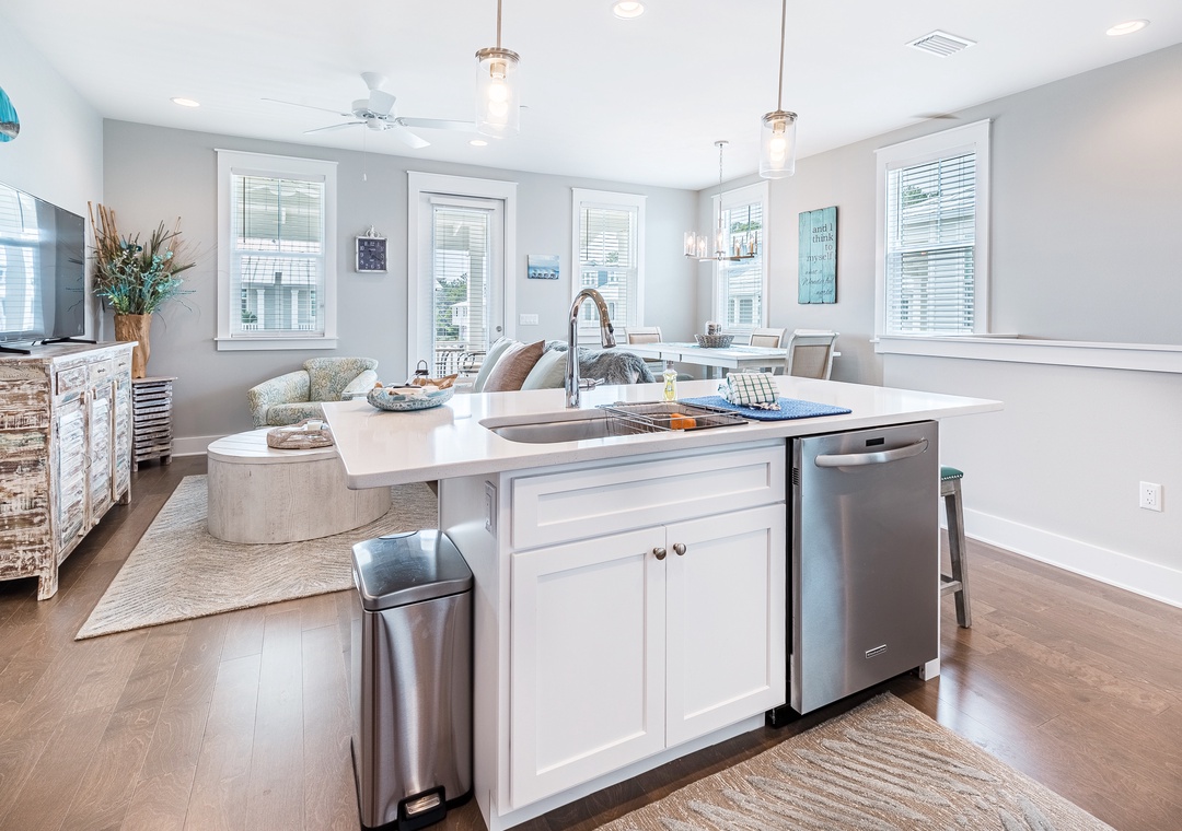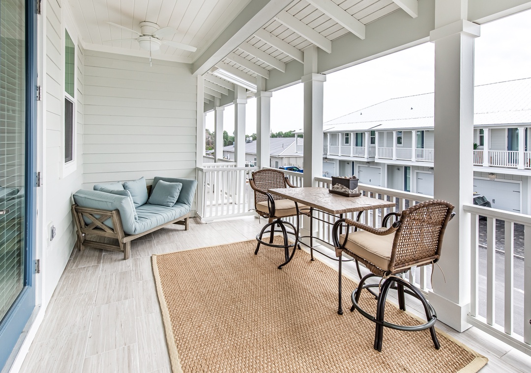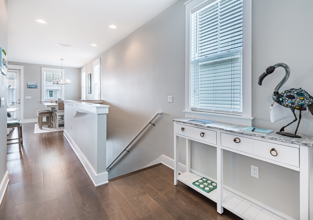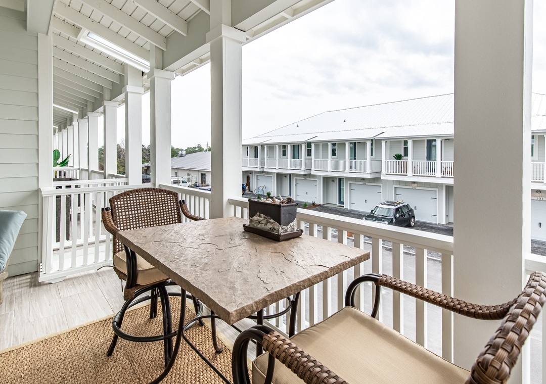 A rare find in Seagrove Beach, Inn to the Mystic is a 3 bedroom, 2.5 bath townhome about .6 miles from Beach Access on 30A. Upscale touches are found throughout such as designer lighting, crown molding, wood wainscoting, hardwood floors, and granite countertops. There are two queen bedrooms on the first floor each with access to the large back porch, and a twin bunk bed in the hallway. The second floor offers a fully equipped kitchen with an island, a spacious living and dining area, and a large covered balcony. The king master bedroom with ensuite bathroom is also on the second floor. As an added bonus, you’ll also find a ping pong table and other family fun games in the garage. When you’re not catching sun on the beach, splash around in the community pool, or take the bikes to explore Seaside Town Center only minutes to the west! Come experience Inn to the Mystic for the perfect 30A beach vacation!