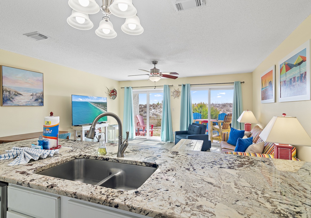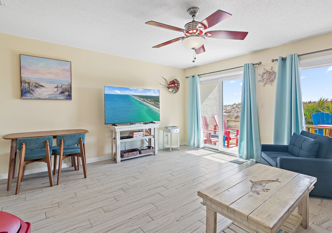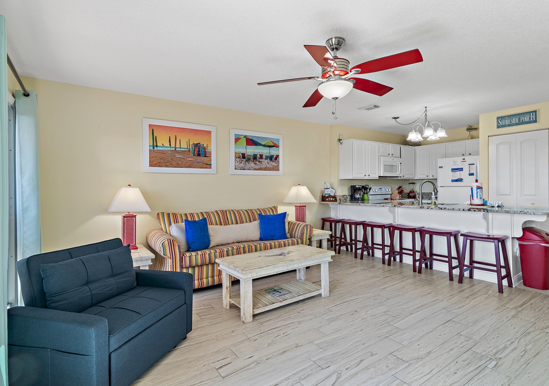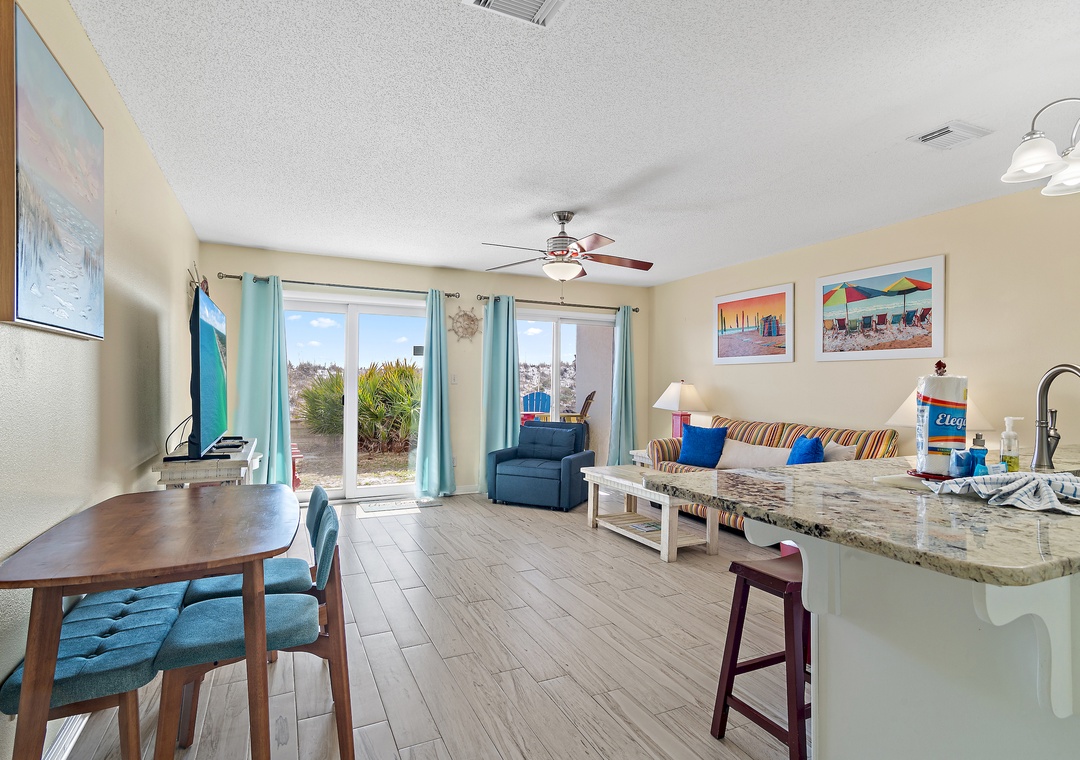 Welcome to Island Sands 102 – your perfect beachside retreat on beautiful Okaloosa Island, just minutes from Destin, Florida. This charming gulf-front complex features 1 bedroom, 1.5 bathrooms, and comfortably sleeps up to 5 guests with a king-size bed in the bedroom and a queen sleeper sofa and twin pullout arm chair in the living room, perfect for a small family or group of friends. Step out onto your patio to the peace and serenity of your outdoor space where the dunes shield you from people on the beach. Enjoy your morning coffee or evening wine as the gulf breezes make the dune grasses sway. A few steps to the private boardwalk and over the dunes brings you to the beautiful beaches of the Emerald Coast. After a day soaking up the sun and the playing in the crystal clear waters, fire up the grill in the shared outdoor area or on your private patio and cook up the day's fresh catch. Dine al fresco or enjoy a cozy meal inside at the spacious kitchen bar or dining table. For added convenience, the unit includes a washer and dryer. Island Sands 102 is where relaxation meets fun – come experience it for yourself!