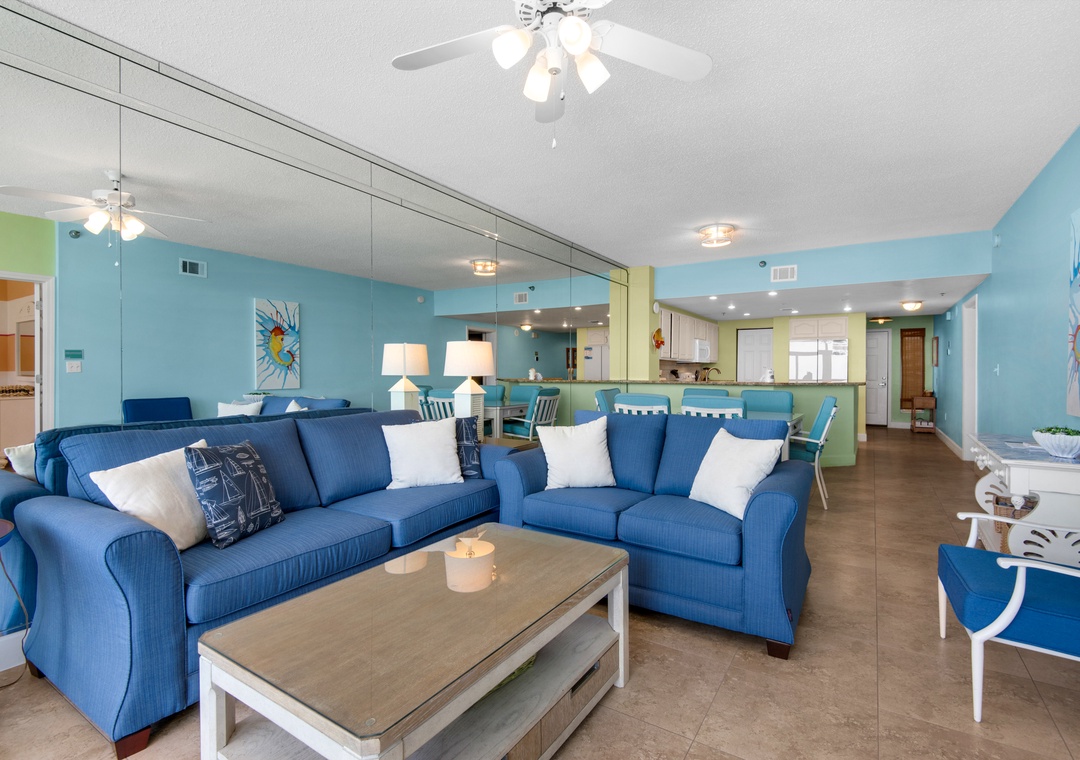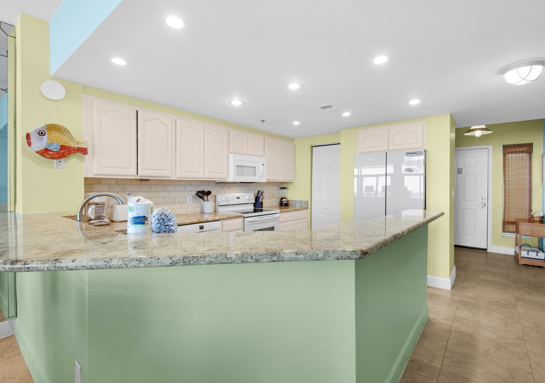Jade East 1730 is a gorgeous 2 bedroom, 2 bath condo with incredible views of the emerald coastline and conveniently located next to shopping and nightlife! This lovely condo features bright beachy décor, a 43-inch flat screen TV in the living room, and a spacious fully equipped kitchen with granite countertops and updated appliances. Wake up to ocean views from the master bedroom which boasts a king size bed, remodeled ensuite bathroom, flat screen TV, and balcony access. There are also two full beds in the guest bedroom and a NEW cozy mattress sleeper sofa and love seat in the living room, sleeping up to 8 guests comfortably! Both bedrooms have NEW mattresses as well as feature 30-inch flat screen TV 's. The fabulous amenities at Jade East Resort include a tropically landscaped, freestyle Gulf Front pool with a waterfall, a fitness center, hot tub, lighted tennis courts, a picnic area with grills, and a seasonal beach service vendor. Come see why families stay at Jade East 1730!