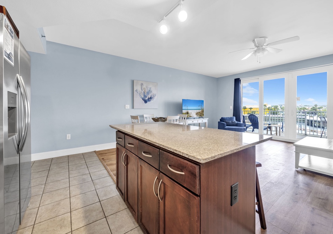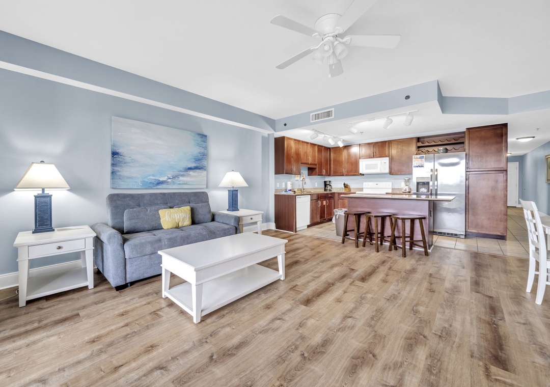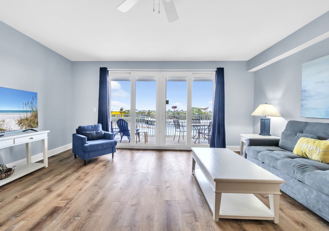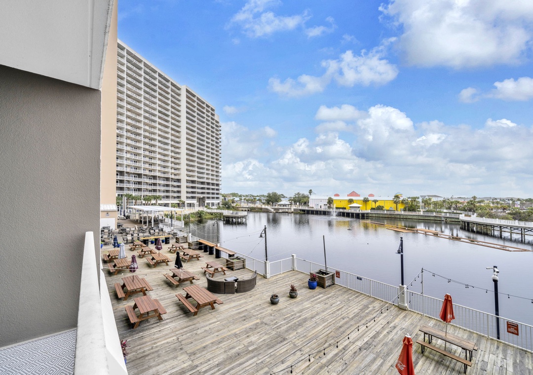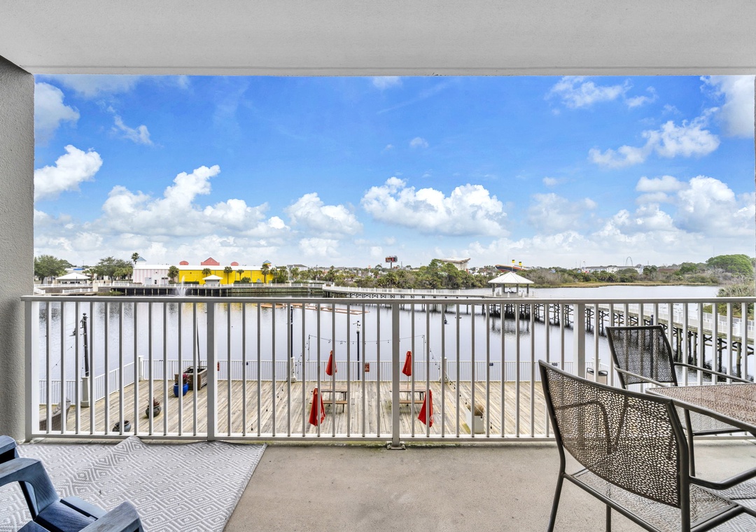 Enjoy spectacular Lake Views at Laketown Wharf 116. This beautiful 2nd floor condo offers 1BR+Bunks/2BA with a king bed in the master bedroom, twin bunks in the hallway and a sleeper sofa in the living room, allowing up to 6 guests to sleep comfortably. Your chef will have all the counter space they need while preparing a delicious meal in the beautiful kitchen. The dining table seats up to 4 guests with additional seating for 3 at the bar. The open concept makes it easy to enjoy your favorite meal all while taking in the amazing lake views. When you’re done with a long beach day, the flat screen TV and comfortable living room furniture will make for the perfect movie night. Or you can lounge on the spacious deck overlooking the boardwalk and enjoy evening light shows over the water. Laketown Wharf 116 is perfect for your entire family and will have you coming back year after year!