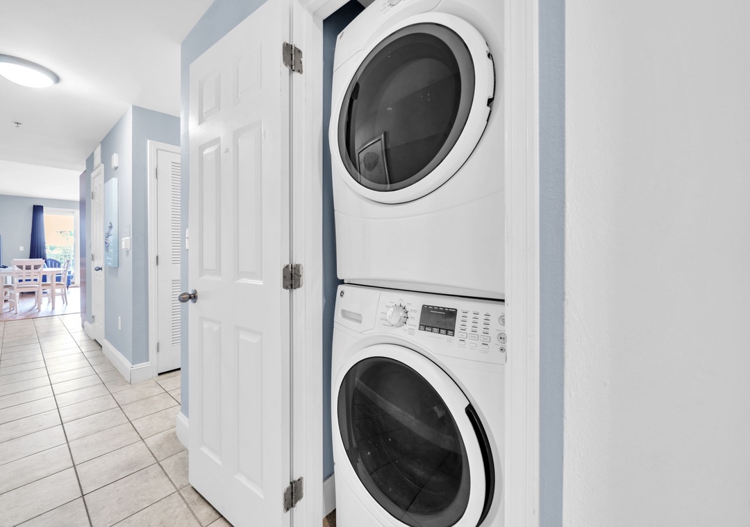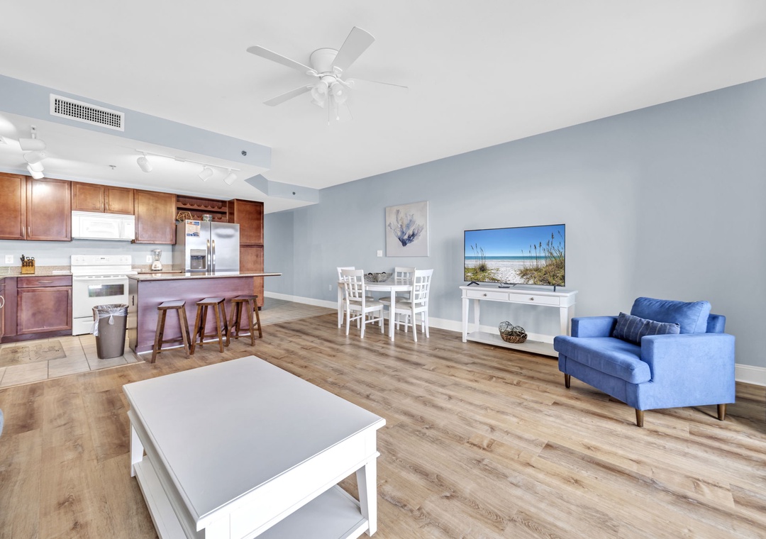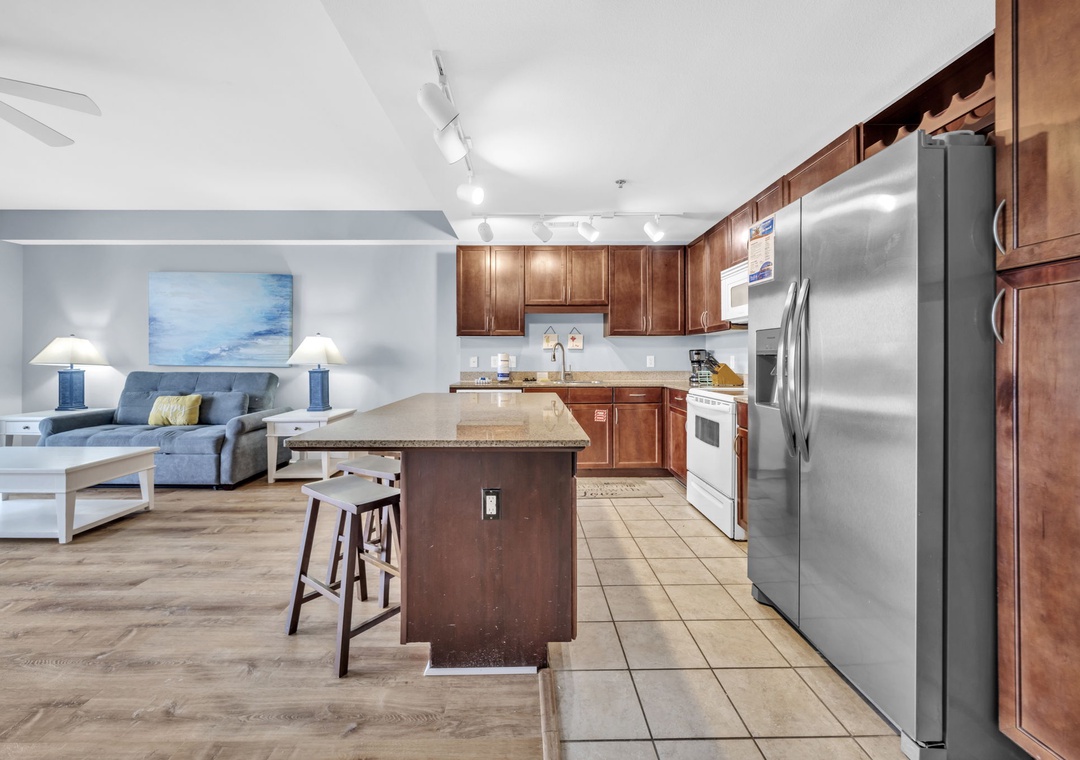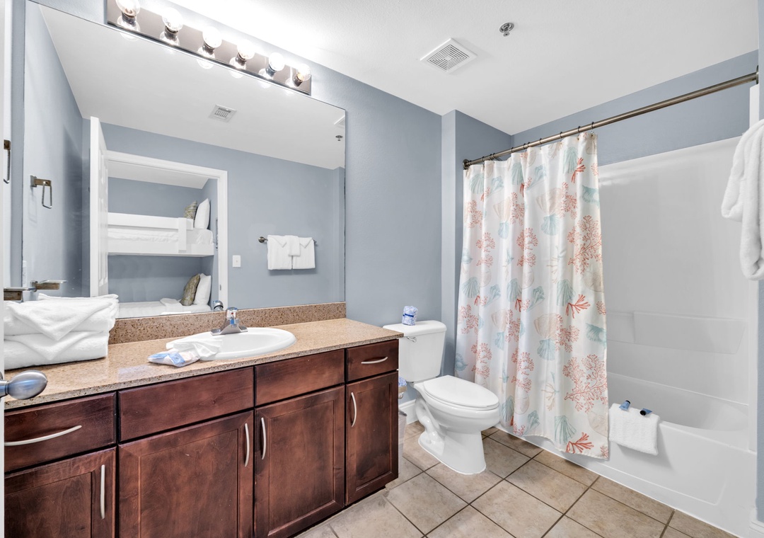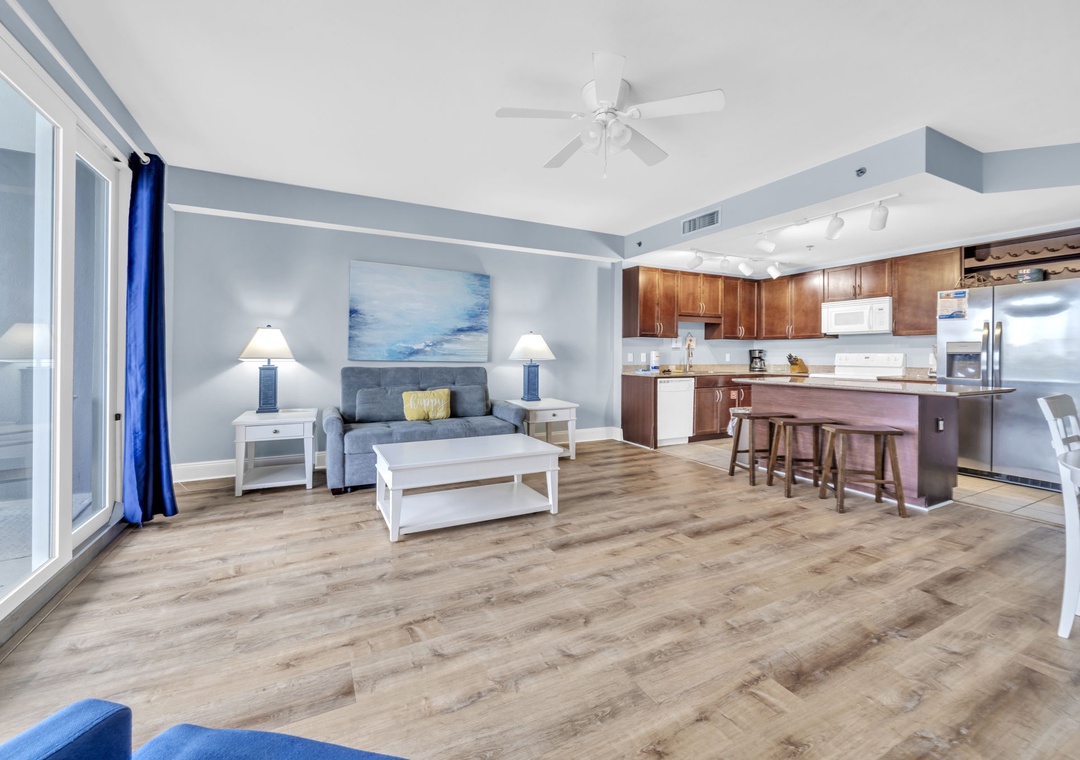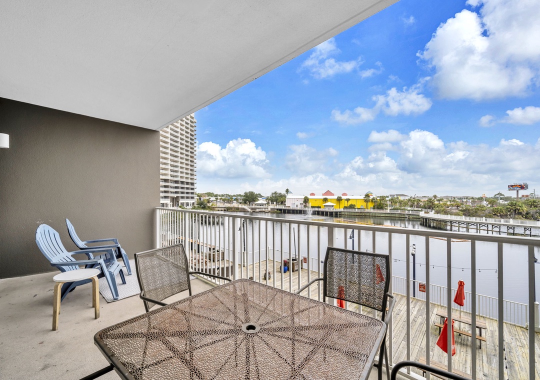 Enjoy spectacular Lake Views at Laketown Wharf 116. This beautiful 2nd floor condo offers 1BR+Bunks/2BA with a king bed in the master bedroom, twin bunks in the hallway and a sleeper sofa in the living room, allowing up to 6 guests to sleep comfortably. Your chef will have all the counter space they need while preparing a delicious meal in the beautiful kitchen. The dining table seats up to 4 guests with additional seating for 3 at the bar. The open concept makes it easy to enjoy your favorite meal all while taking in the amazing lake views. When you’re done with a long beach day, the flat screen TV and comfortable living room furniture will make for the perfect movie night. Or you can lounge on the spacious deck overlooking the boardwalk and enjoy evening light shows over the water. Laketown Wharf 116 is perfect for your entire family and will have you coming back year after year!