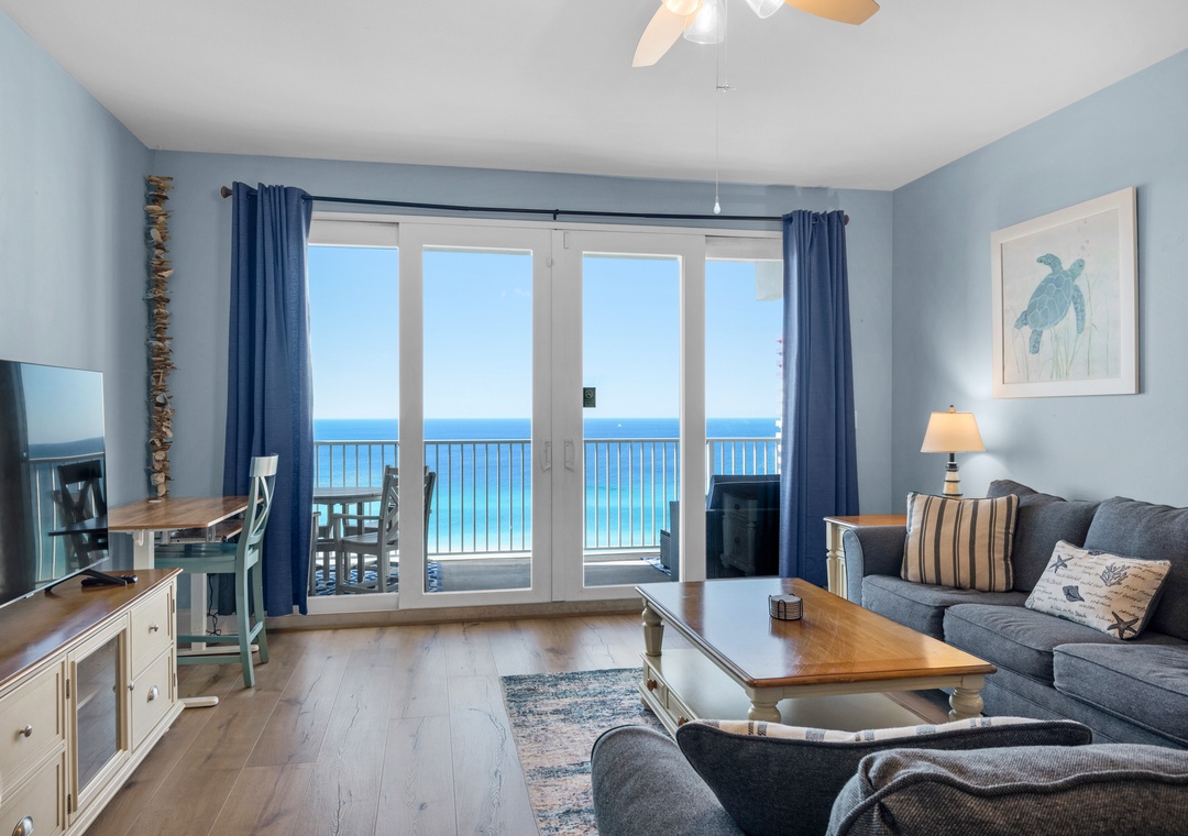 Enjoy spectacular views and easy beach access at Laketown Wharf 1626 - Happy Hours. This spacious 2 bed 2 bath condo comfortably sleeps up to 8 guests. Relax in the master bedroom with a king bed, balcony access, and en suite. Guests will find comfort with a queen in the guest room, twin over twin bunk in the hallway, and a sleeper sofa in the living room. The fully equipped kitchen features a new range, dishwasher, breathtaking views all while the chef in the group prepares a delectable meal. An open living room offers plenty of space to unwind and enjoy your favorite movie. Smart TVs equipped with YouTube TV are available in the living room and both bedrooms. A washer and dryer complete this beautiful condo. Come see why Laketown Wharf 1626 - Happy Hours is perfect for your next family beach vacation!