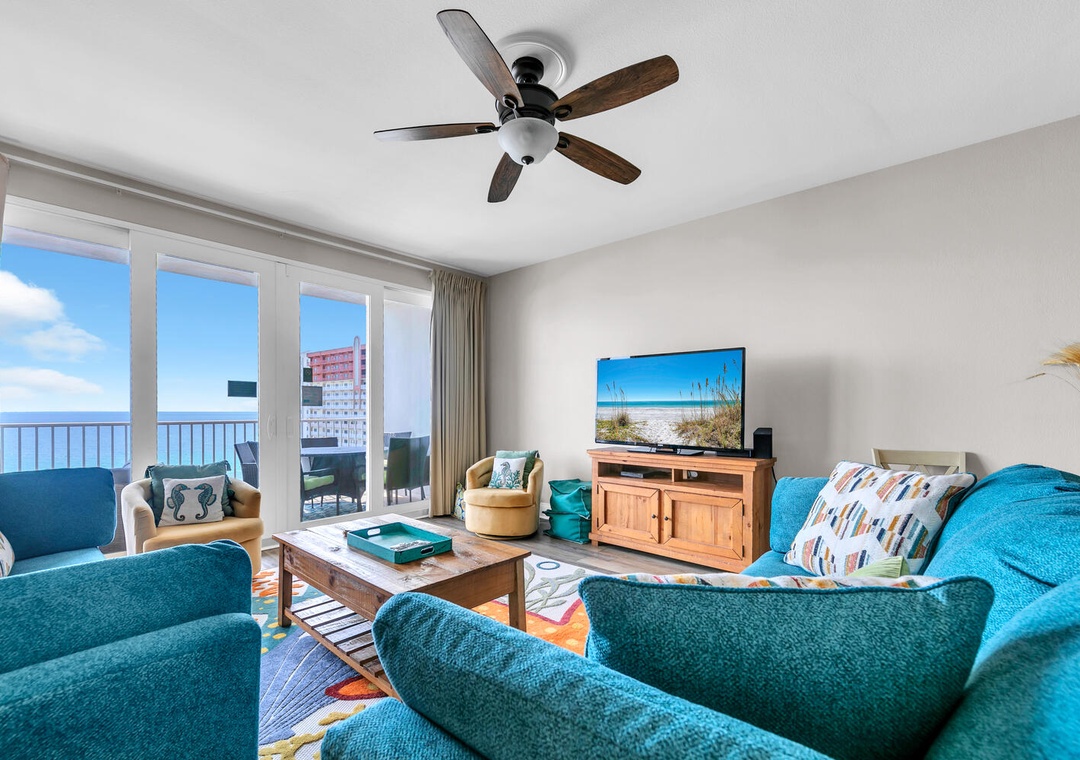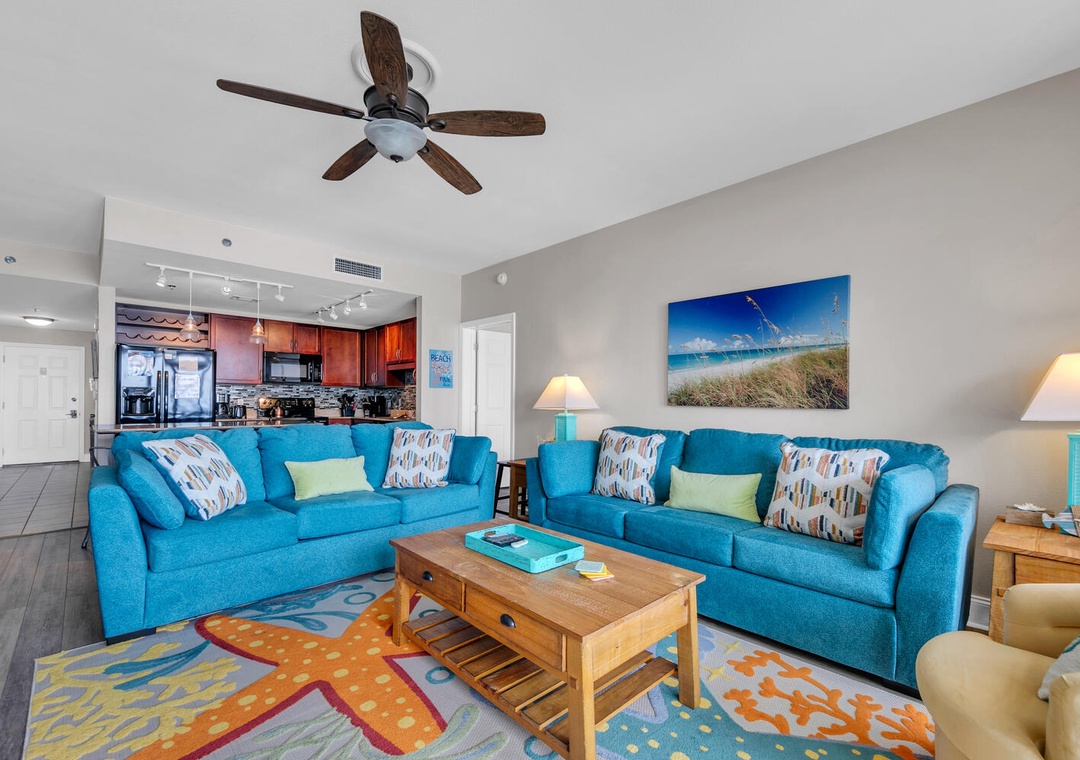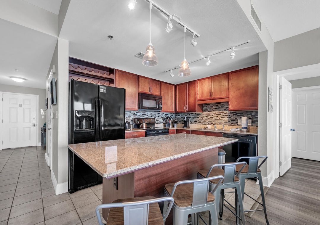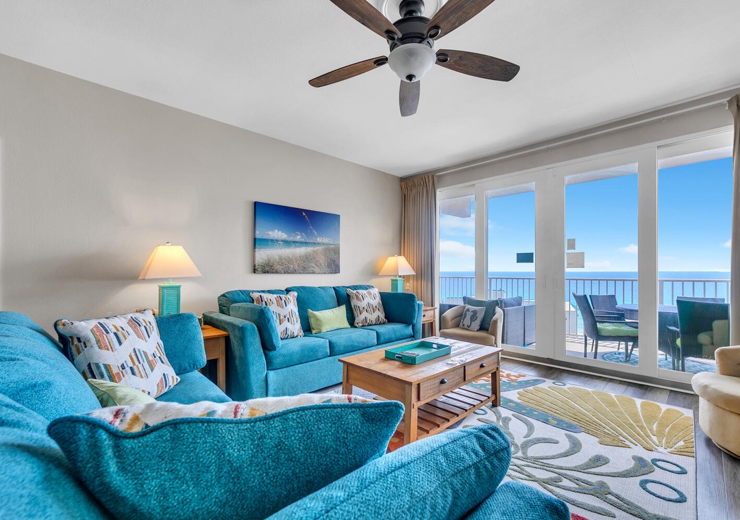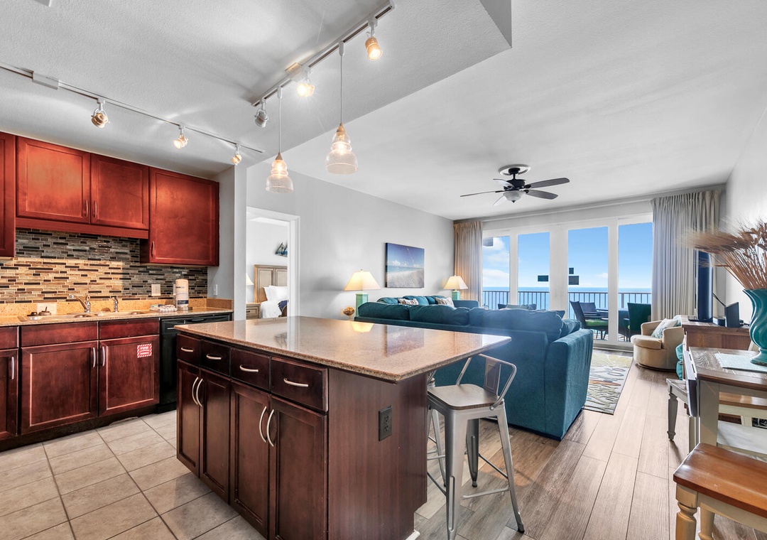 Enjoy spectacular views and easy beach access at Laketown Wharf 1627 - "resting BEACH face" in Panama City Beach! Laketown Wharf is an incredible destination with abundant amenities that appeal to all ages. This spacious 2BR/2BA condo has a king bed in the master bedroom, king bed in the guest room, the area room with a barn door for privacy has a full bed and a sleeper sofa in the living room, sleeping up to 8 guests. The kitchen has breathtaking views all while preparing your favorite meal. The kitchen island offers 3 additional bar seats. The open living room has plenty of space to unwind and enjoy your favorite movie on the flat screen TV. Relax on the large balcony and take in amazing gulf views. For added convenience a washer and dryer is located within the condo. Come see why Laketown Wharf 1627 is perfect for your next family beach vacation!