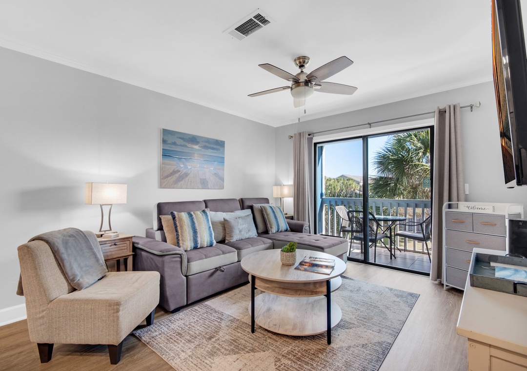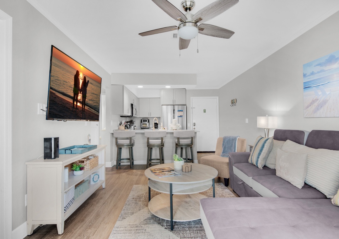 Place was spotless and the TVs were set to welcoming jazz music which was a nice touch. Comfortable living room furniture and plenty of linens and board games. The shower curtain was a few inches shorter than the shower lip which cause water to leak on the floor anytime the shower was on. We had to use most of our towels to create a barrier and to mop up the water after each use. If this continues, the owners may be looking at some serious water damage. We also purchased a broom to help keep the sand up since the condo only had a vacuum and swiffer. The beach access was directly across from the condo and stores are conveniently located to condo as well. Appliances up to date and plenty of ice. Everything except beach towels are provided - even a few toiletries and dish soap to get you started with your stay. We would definitely stay at this place again. Five stars for cleanliness and beach access!- Reviewed On: 4/10/2021