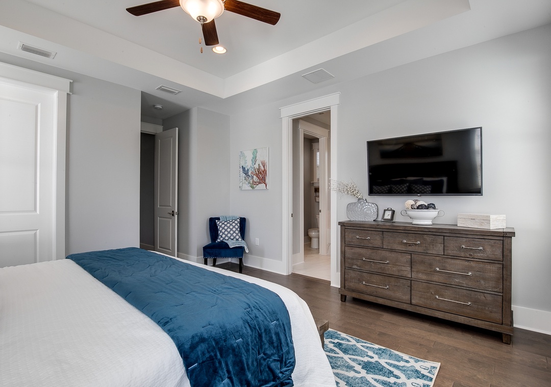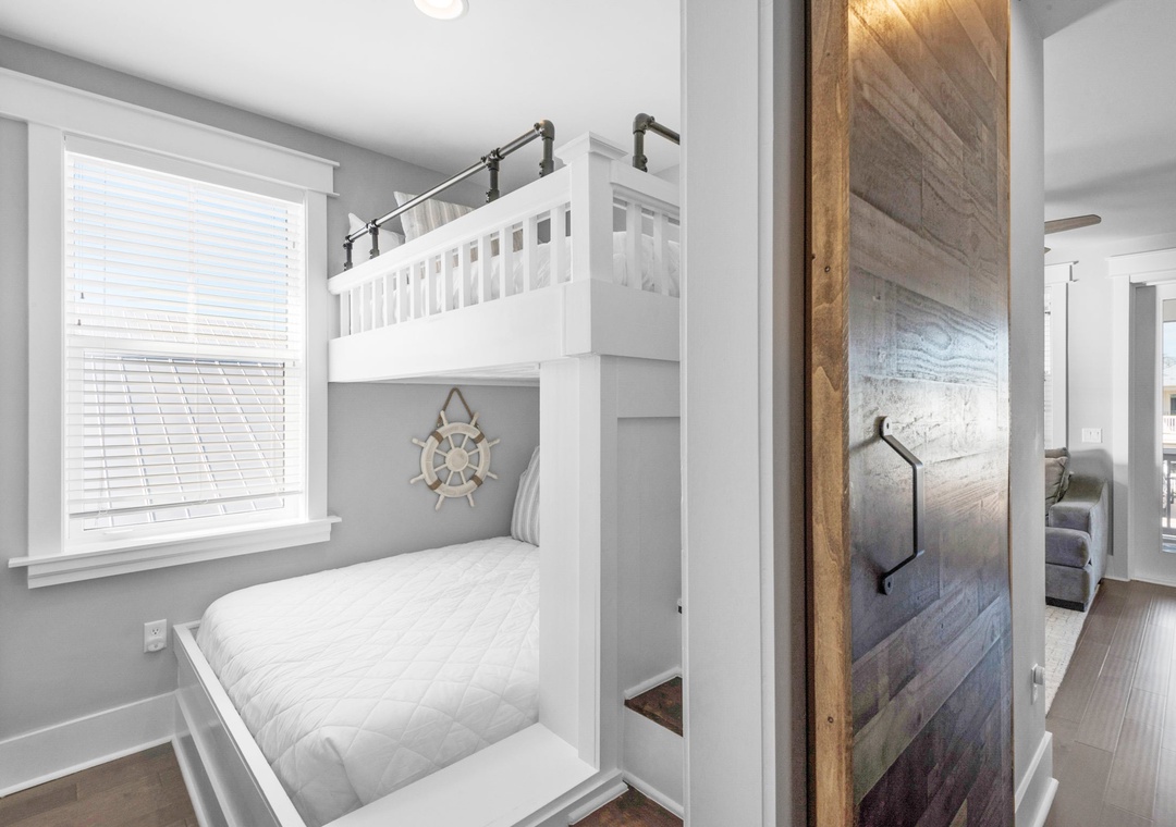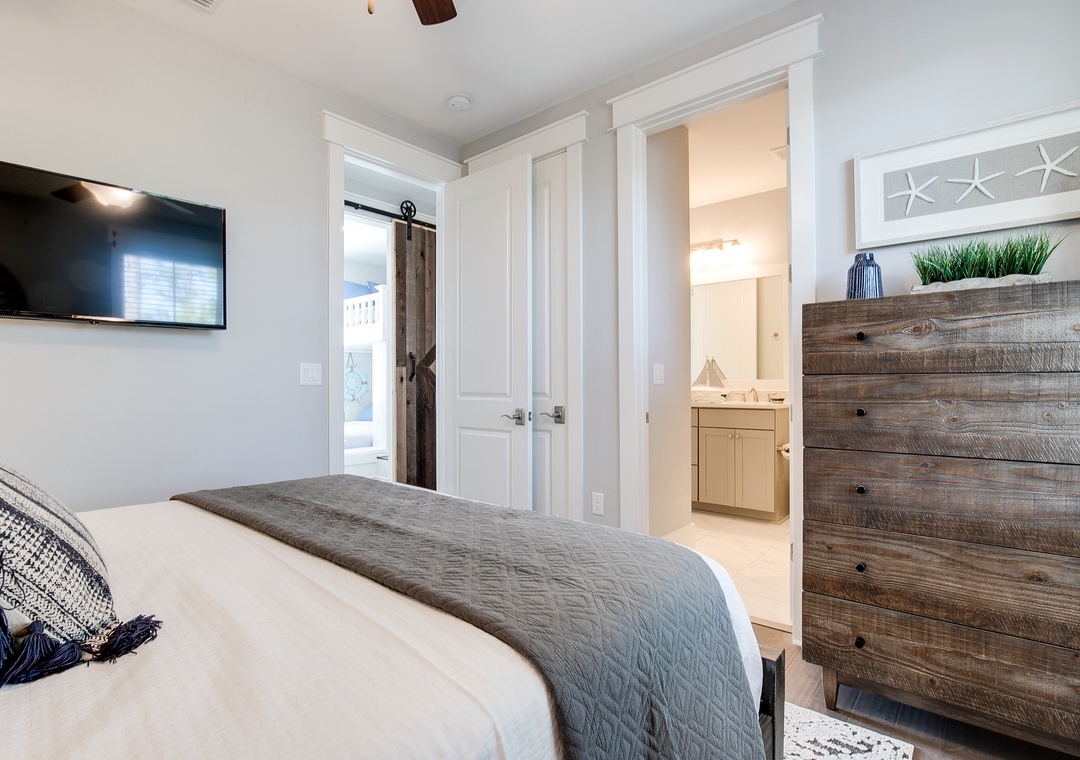 Welcome to Last Call at NatureWalk 30A, the perfect 30A vacation destination! This beautiful home, located inside the quiet NatureWalk 30A Resort Community, offers 4 bedrooms, 3.5 bathrooms, and will sleep up to 10 guests comfortably. Step through the doors to find oak wood floors, custom cabinetry, premium furnishings, and vaulted ceilings to enhance your stay! The first floor offers an open living room with a flat-screen television, a dining area that seats 8, and a fully equipped kitchen with stainless steel appliances, marble countertops, and bar seating for 4. Additionally, on the first floor, you will find a Master suite with a King bed and an ensuite bathroom. The second floor offers a second Master suite with a King bed, a guest bedroom with a Queen bed, and a bunk room with a Full-over-Queen custom bunk bed. You will also find many child-friendly bonuses within the home that include two highchairs, two pack’n’plays, beach toys, and optional baby gates. Adults in the group will love the 12 beach chairs, 4 beach umbrellas, 6 bikes, and a 6-seater golf cart that are all included with the home! An additional 6-seater golf cart is also available for an extra fee. Last Call at NatureWalk 30A is perfect for all with a short distance away to neighborhood pools, a golf cart ride away from the beach, serene walking and biking trails, a private lawn area with Adirondack chairs – this list goes on! Come and see why families return year after year for memorable vacations!