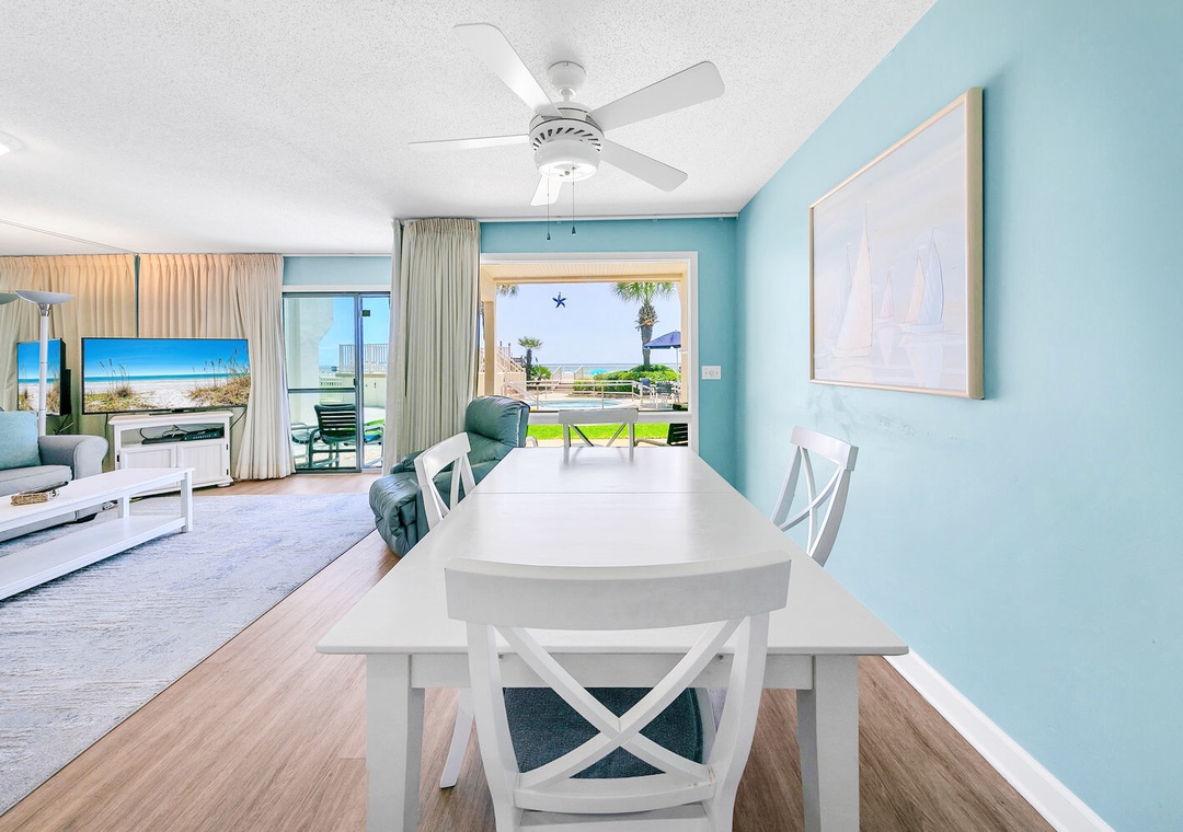 Welcome to your next vacation spot, Latitude 29 #13 .This unit is ground floor; so a short walk out the back door and you are on the sugar white beach of the Gulf of Mexico. With a king bed in the bedroom, bunks in the hall and two queen sleeper sofas, this condo comfortably sleeps up to 6 people. The fully remodeled kitchen, with stainless appliances, offers everything you need to cook breakfast, lunch, or dinner for the whole group. The living room has flat screen TV, DVD player and a second bathroom. Come visit the “Best backyard on the Beach” at Latitude 29 #13.