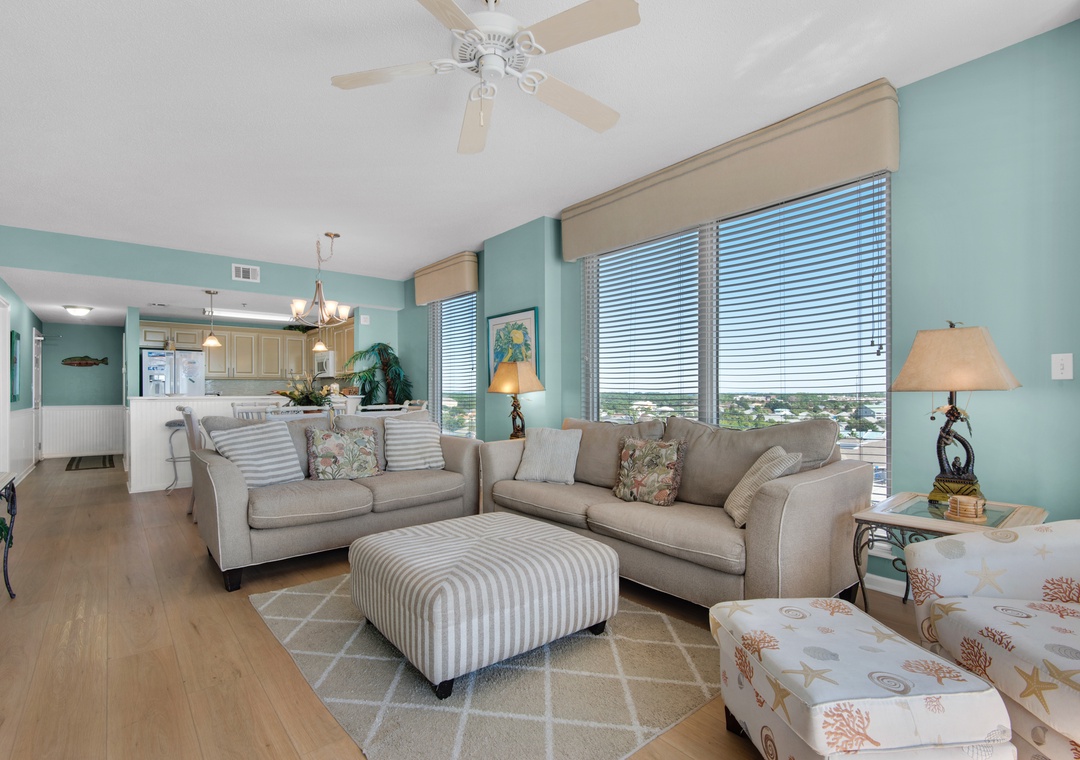 Getaway to Leeward Key 806, a luxury 2-bedroom, 2-bath condo offering breathtaking views from its large corner balcony. Whether you’re sipping coffee at sunrise or catching vibrant Gulf sunsets, this private balcony gives you a panoramic experience. Inside, an open layout with floor-to-ceiling windows fills the space with natural light. The living area flows into a fully equipped kitchen with granite countertops and stainless-steel appliances. With a King master suite, a Queen guest bedroom, and a Queen sleeper sofa in the living room, this retreat comfortably sleeps 6 guests.