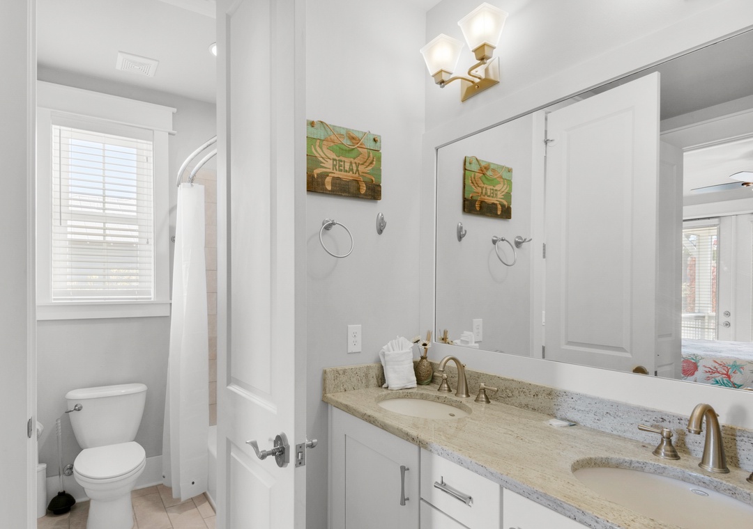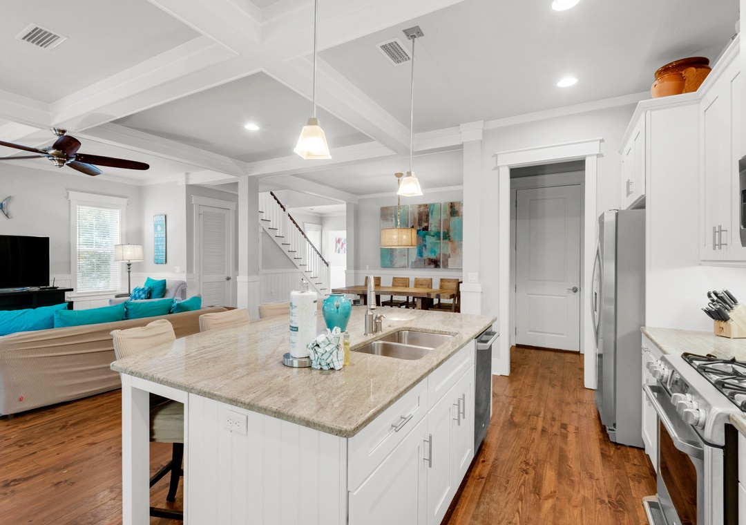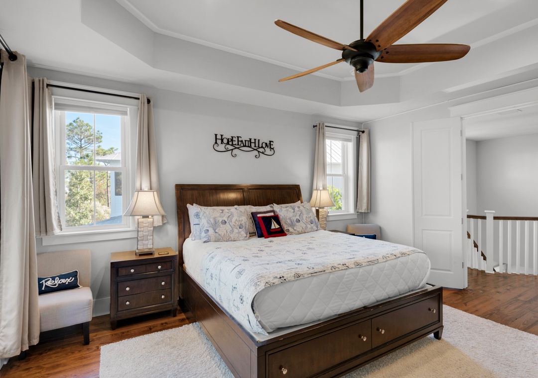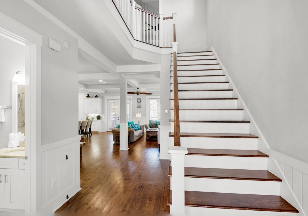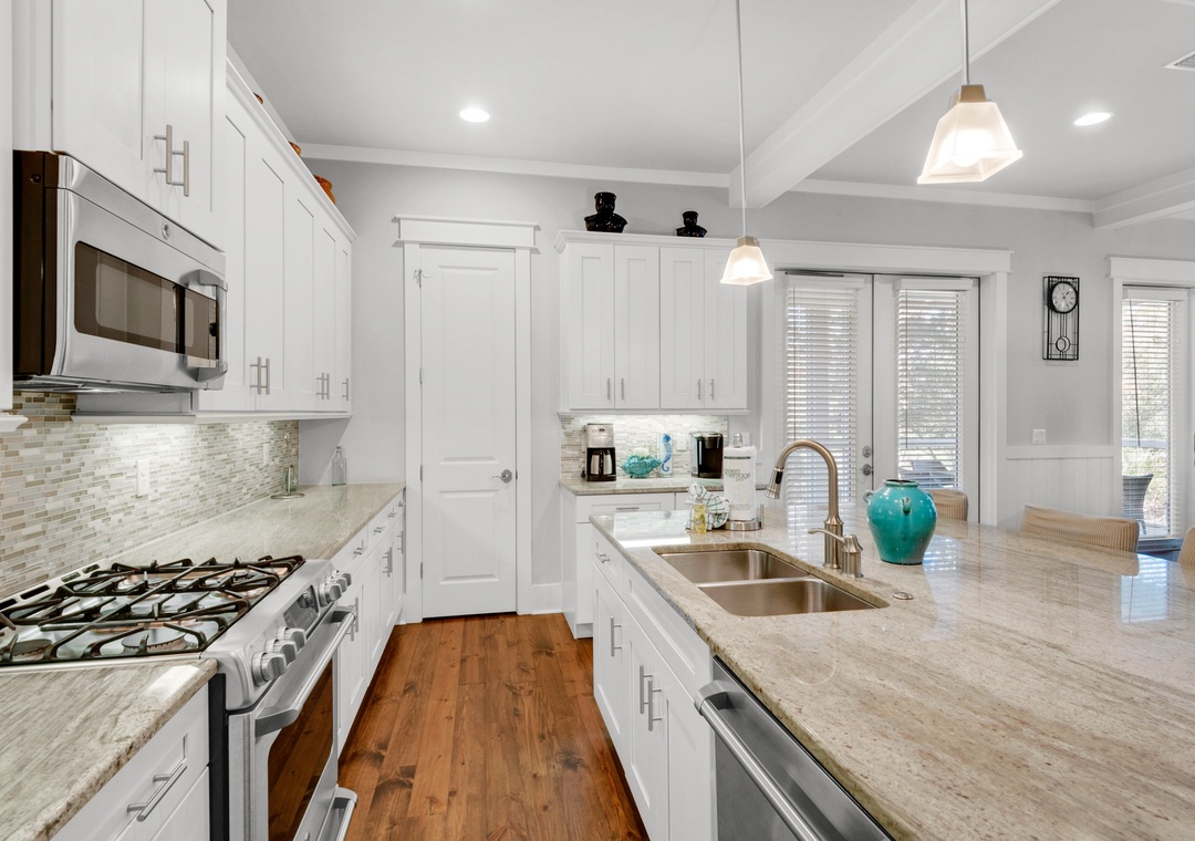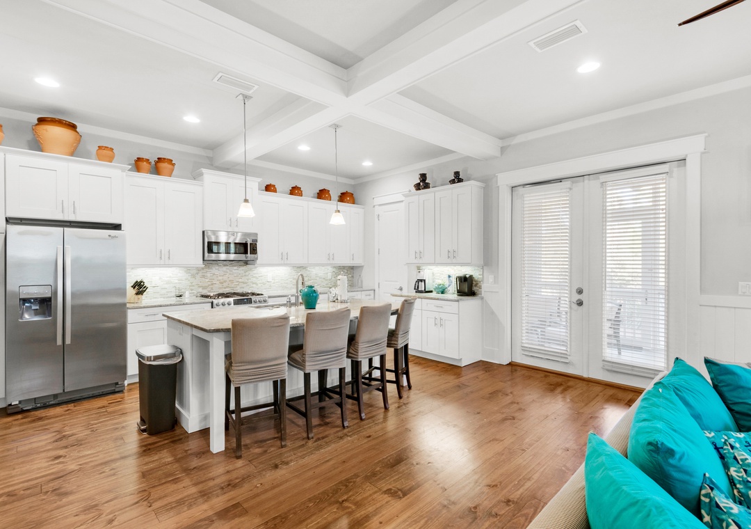 Come have the vacation of a lifetime at Little Bear's Haven in the NatureWalk 30A Community! This quiet neighborhood is surrounded by scenic bike and walking trails, offering a peaceful retreat with breathtaking Florida sunsets. Explore the community with ease using the complimentary golf cart or the four available bikes. Little Bear's Haven is a spacious 4-bedroom, 3-bath home with an additional bunk nook, designed for ultimate relaxation and family fun. The bright, white kitchen is a chef’s dream, featuring granite countertops, a tiled backsplash, a large island, and stainless steel appliances. With three king master bedrooms—each with balcony access—a queen bedroom, and a cozy nook with two twin-over-full bunk beds, this home comfortably accommodates up to 14 guests.