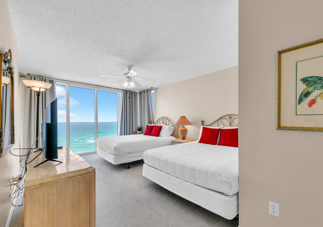 Welcome to your getaway at Long Beach Resort 2-1206. The spectacular 12th-floor views with floor-to-ceiling windows allow you to enjoy the Gulf views while relaxing in the living room or the kitchen. Step onto this beautiful, private balcony and listen to the waves crash against the shoreline! Prepare anything from your morning coffee to your four-course dinner in your well-equipped kitchen. The master has a king bed and a private balcony, an attached bathroom, and a wet bar, guest bedroom 1 has 2 queen beds, an attached bathroom, and balcony access, and guest bedroom 2 has a king bed, an attached bathroom, and balcony access, and queen sleeper sofa in the living room making this condo sleep 1 comfortably. Long Beach Resort 2-1206 is a great choice for a Panama City Beach getaway or a fun family vacation on the Gulf Coast.