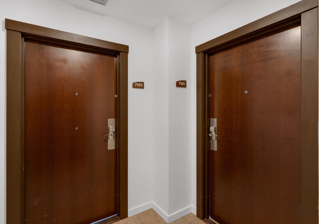 The elevator was efficient and rarely a wait. Pleased with location and gated felt secure. Parking garage and parking lot, tight spaces especially for a larger vehicle.