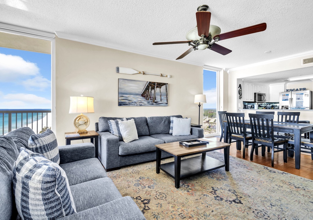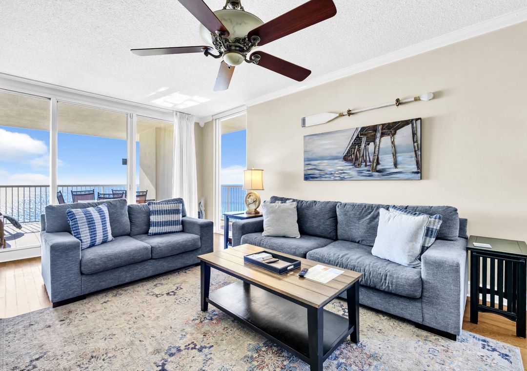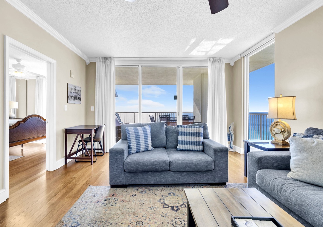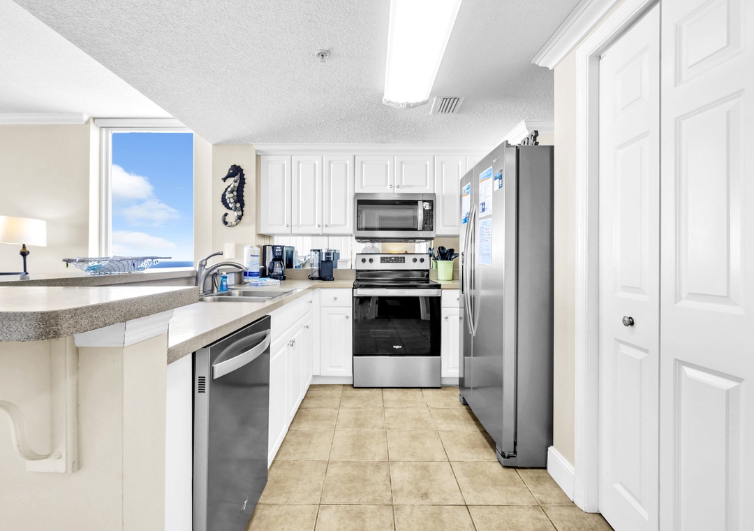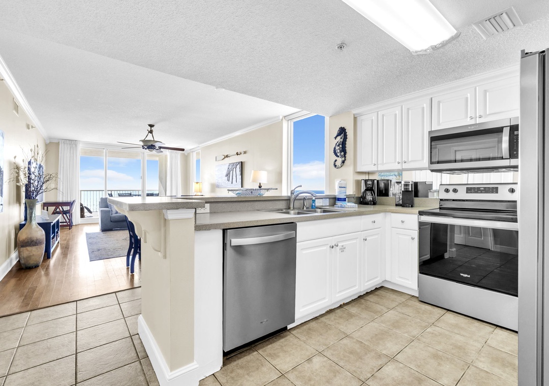 Majestic Towers 1-1701 is a stunning 4 bedroom, 3 bath GULF FRONT corner condo located on the 17th floor. An open floor plan promotes togetherness and the floor to ceiling windows help to fully unwind with some of the best sunset views. Create a scrumptious meal in the fully equipped kitchen with new stainless steel appliances, then gather around the dining table that seats 6 with additional seating at the bar. Unwind after a day at the beach with a movie night in the living room on the flat screen tv or with your favorite libation on the balcony breathing in the salt air. The master suite features balcony access, a king bed, flat screen tv, and en suite with a garden tub and walk-in shower. The first guest room features a king with its own private balcony, the second guest room also features a king bed with an en suite. Children will enjoy the third guest room which has a twin over full bunk, 9 guests. There is also a washer/dryer for your convenience inside the condo. Majestic Beach Resort has five pools, three hot tubs, a movie theater with stadium seating, tennis courts plus a deli market with a Starbucks! Come see why Majestic Towers 1-1701 is a favorite for all!