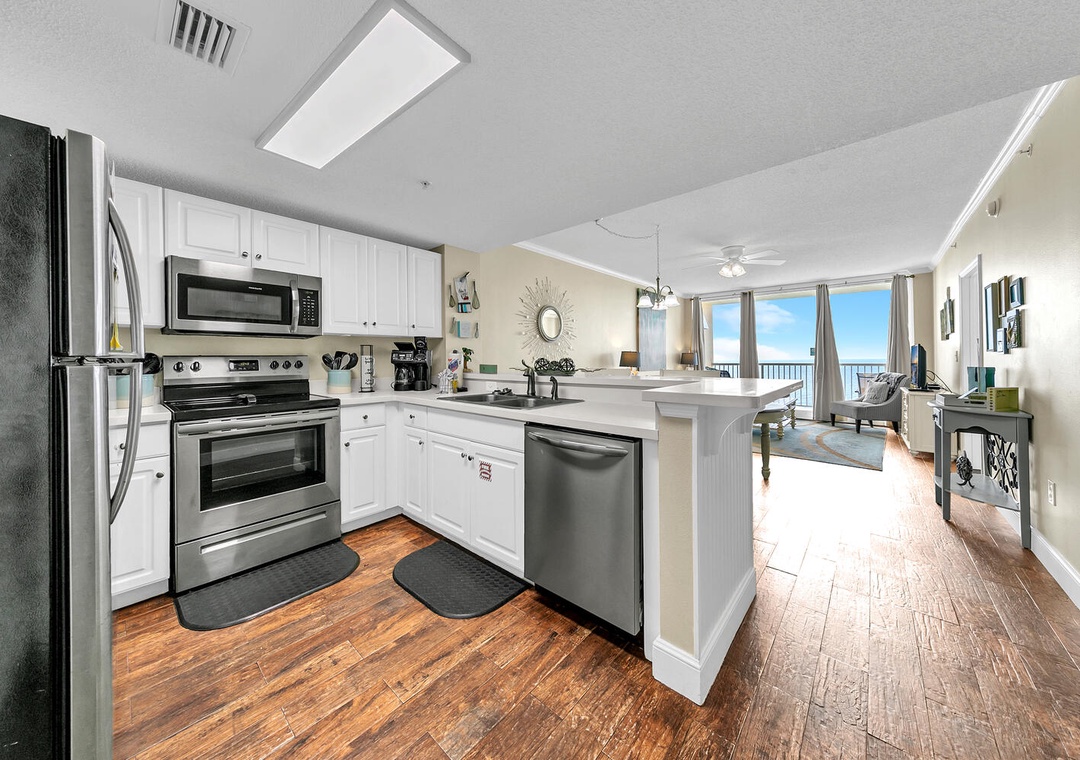 Terra, we are very happy to know that this spacious three-bed, two-bath Gulf-front condo met your expectations and you enjoyed the great huge balcony, amazing ocean views, and the fully stocked kitchen. Thank you for choosing RealJoy. Please visit again soon.Real Joy staff