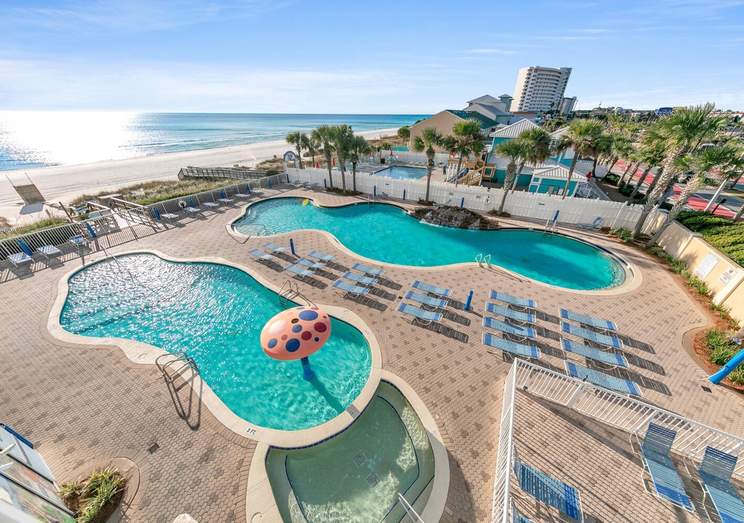 This condo is in a great location in the complex. Same floor as parking garage bridge, right next to the pool and the stairs are right outside for quick access to ground floor. The pools were great for the days where the red flag days. The balcony facing the Gulf is huge since this is the last unit on the floor. The condo was very clean and spacious with lots of room for our 10 guests. They provided a few beach chairs and toys which was great since we flew there. There is a bar across the street that had music one night but I don't believe it disturbed anyone in our party. We had zero issues the entire time of our stay. I happily would recommend this condo to anyone.- Reviewed On: 7/9/2019
