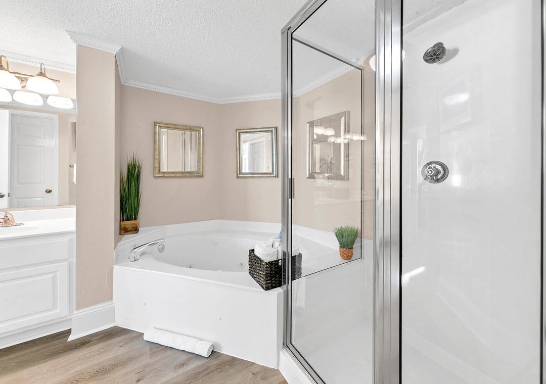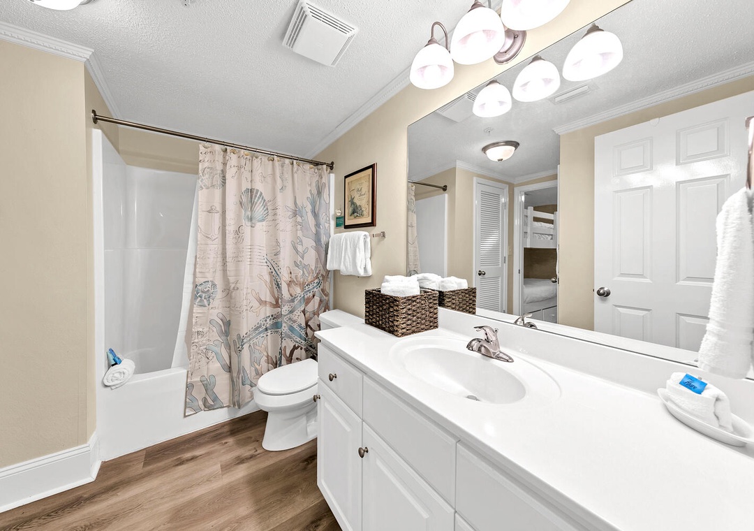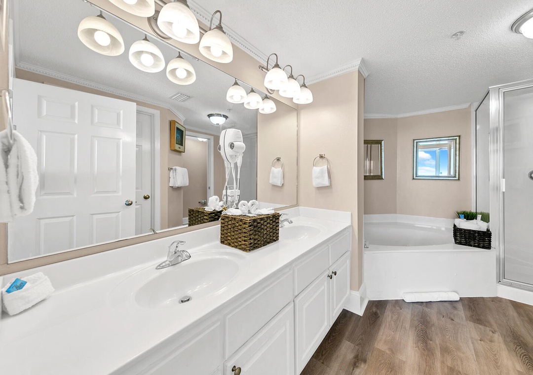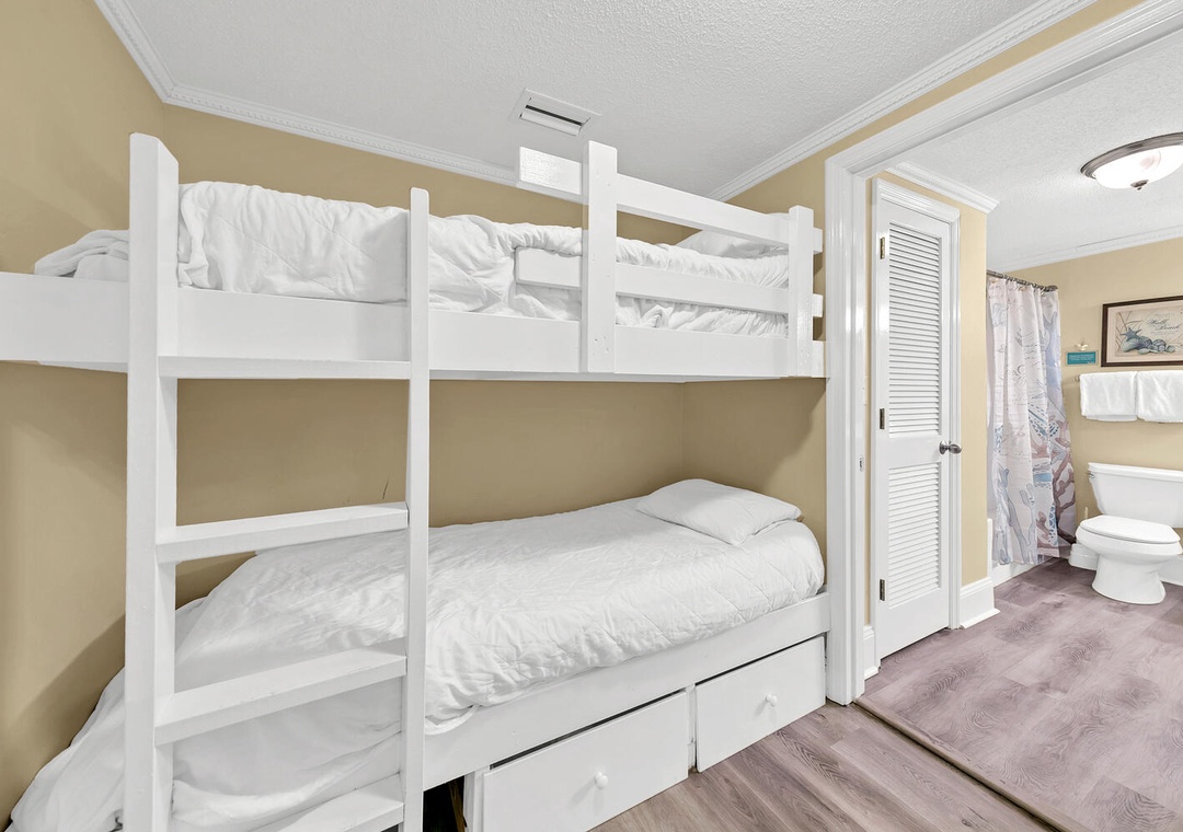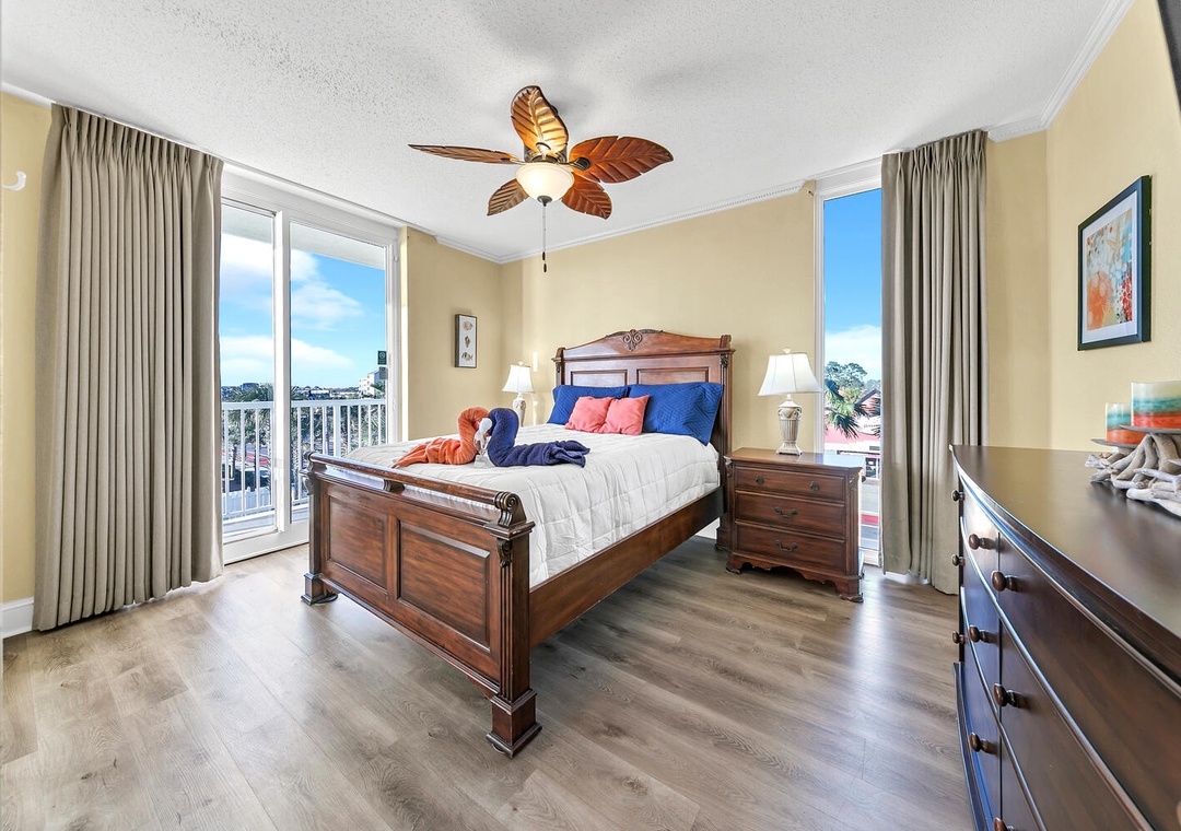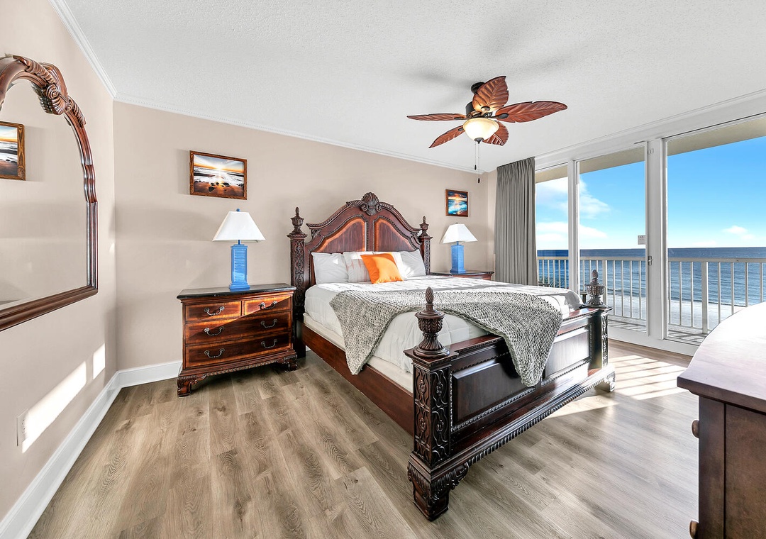 Majestic Beach Towers 1-301 is a stunning 4BR/3BA GULF FRONT condo that offers breathtaking views of the emerald waters and sugar white sand beaches. Wake up to watch the dolphins in the early morning waters and end the day with gorgeous sunsets. This corner unit features a king bed in the Gulf Front master suite, a king bed in the second bedroom, a queen bed in the third bedroom, a twin over twin bunk room, and a sleeper sofa in the living room, comfortably accommodating 10 guests. There is BRAND NEW flooring in all bedrooms. With a fully equipped kitchen, a spacious living room layout, and TWO balconies including a 390 sqft wrap-around balcony and a private balcony w/ pool views off the guest room, you 'll never want to leave! Majestic Beach Resort has five pools, three hot tubs, a movie theater with stadium seating, tennis courts, spa and health club, deli market with a Starbucks. Come see why Majestic Towers 1-301 is a Panama City Beach favorite!