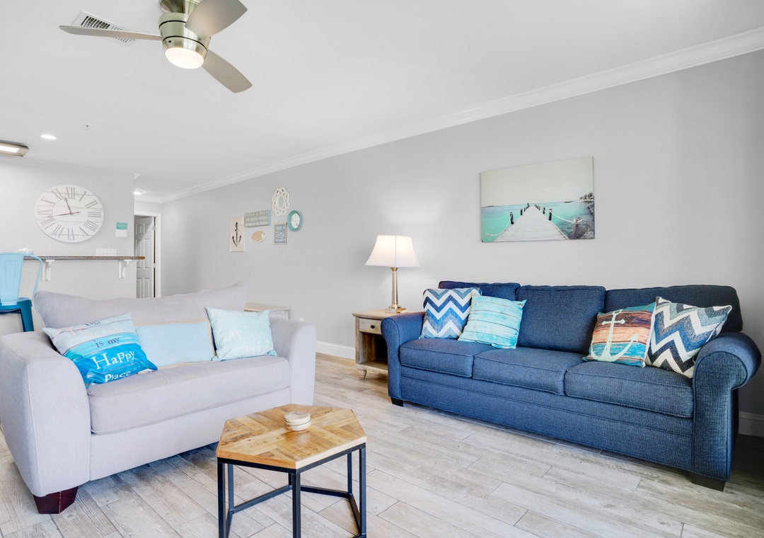 Maravilla 2112 is a beautiful 1BR/2BA condo just a short walk from gorgeous Miramar Beach! Maravilla is located in a gated resort with two pools, a hot tub, tennis courts, basketball half-court, fitness room, clubhouse, covered parking, bike racks, and shuffleboard. This condo includes a king bed in the master bedroom with a TV, and an ensuite bathroom with a tub/shower combination. There is a twin over twin bunk nook, and a full sleeper sofa in the living room, sleeping a total of 6 guests comfortably. The guest bathroom has a walk-in shower. This first-floor unit features a balcony overlooking the pool and has seating for four on the back patio. Enjoy the added benefit of a washer/dryer in the condo. With Private Beach access just across the street and TWO on-site pools to choose from, come see why Maravilla 2112 will be your family’s favorite for years to come!