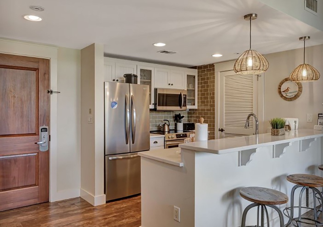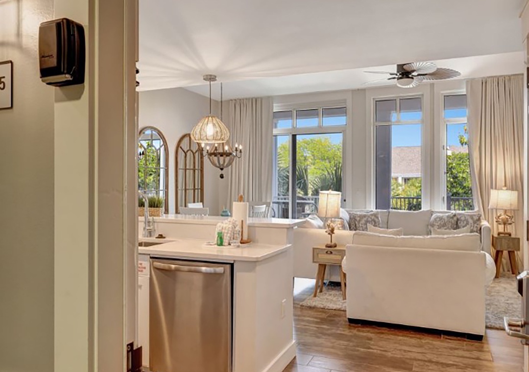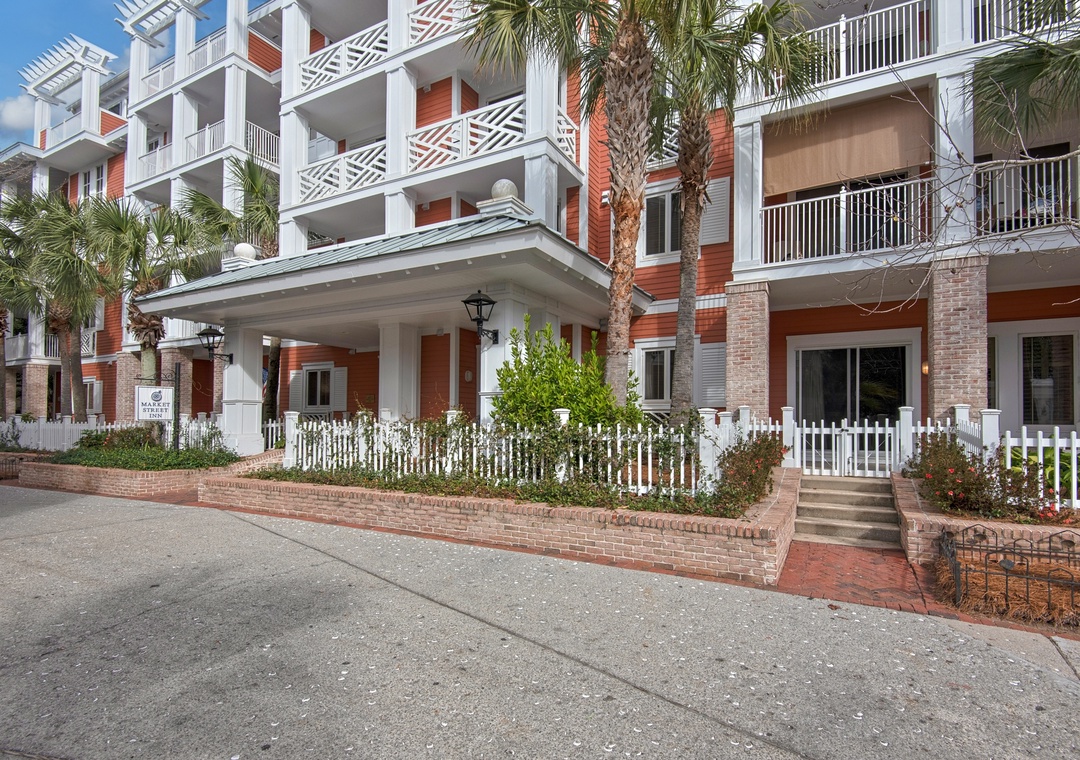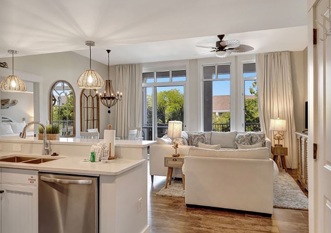 Market Street Inn 545 is a charming 1-bedroom, 1-bathroom top-floor condo nestled in the heart of Baytowne Wharf. Relax on the covered, shaded balcony and listen to the gentle rustle of palm trees while taking in the peaceful view of the village pool. The recently renovated kitchen features sleek modern sinks and faucets, complemented by a stylish tile backsplash that evokes coastal charm. Gleaming stainless steel appliances and quartz countertops shine in the natural light pouring through the 10-ft ceilings. The master suite boasts a king bed and an en-suite bathroom. A twin sleeper chair in the living room provides extra sleeping space, accommodating 3 guests comfortably. Create unforgettable vacation memories at Market Street Inn 545!