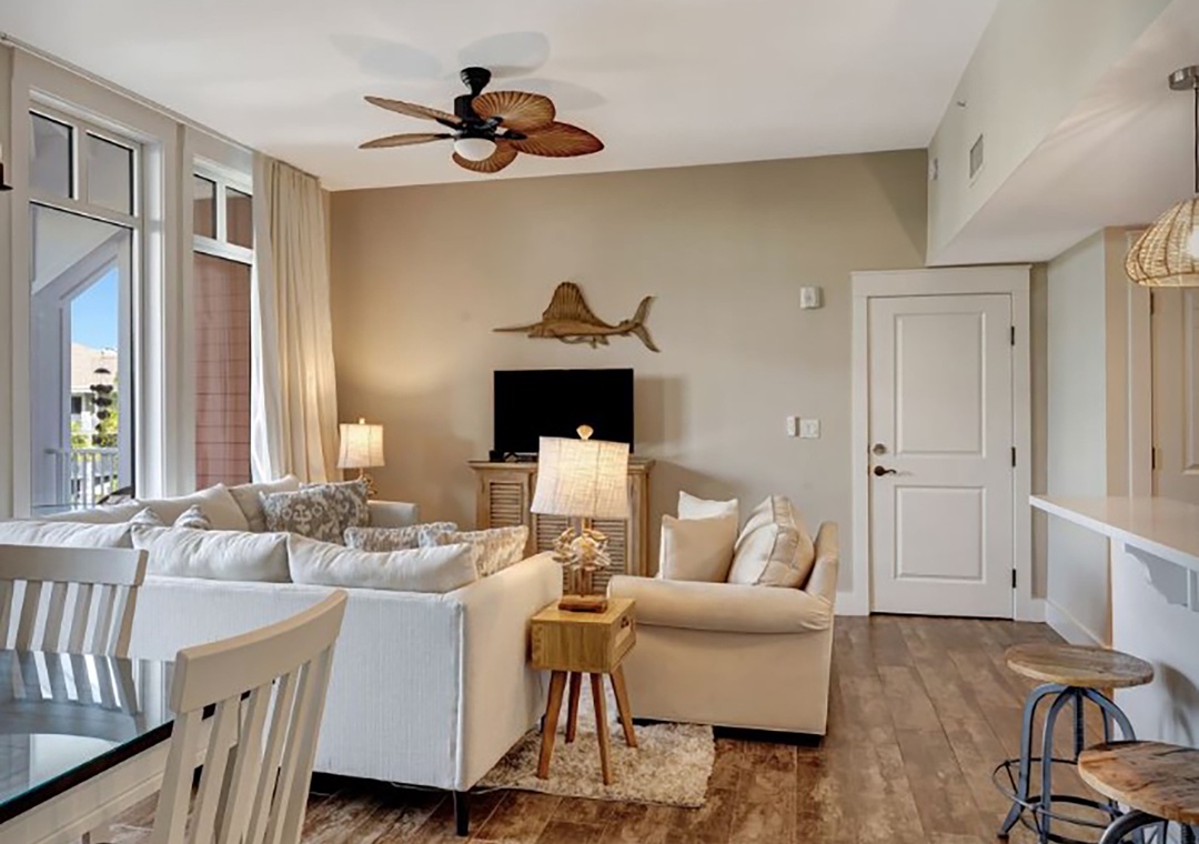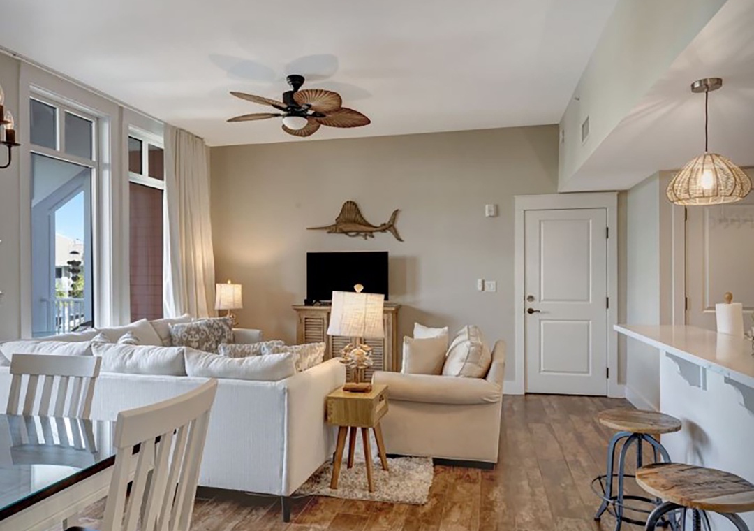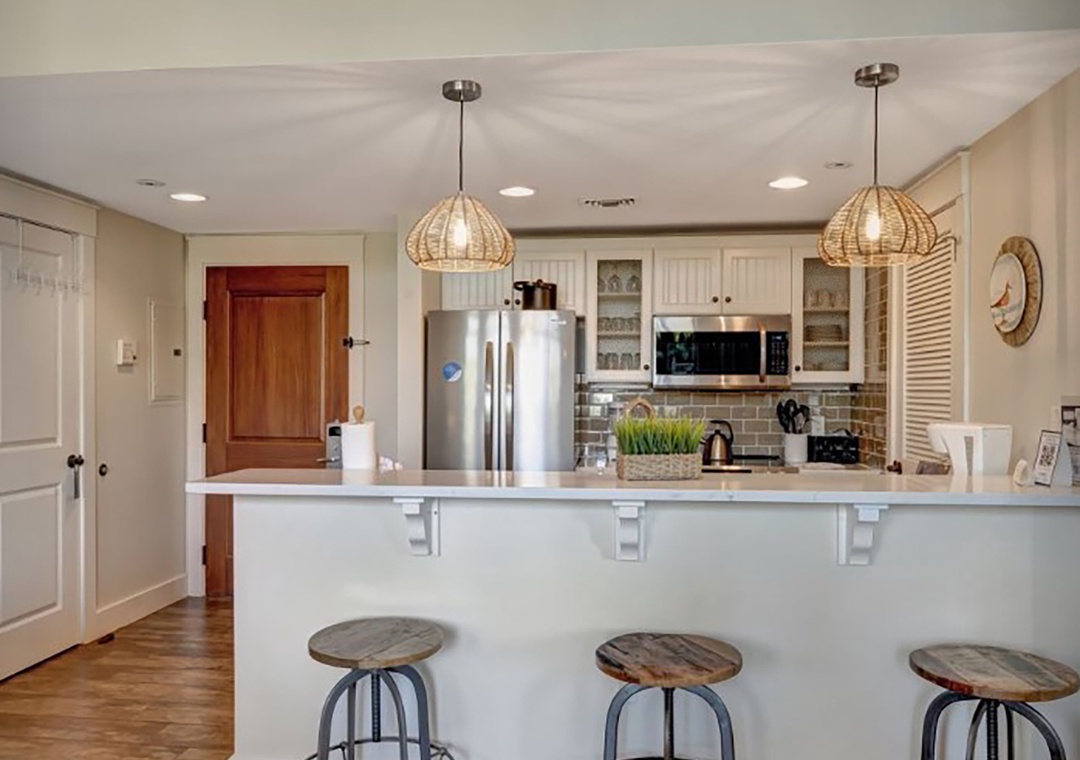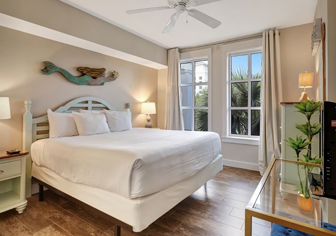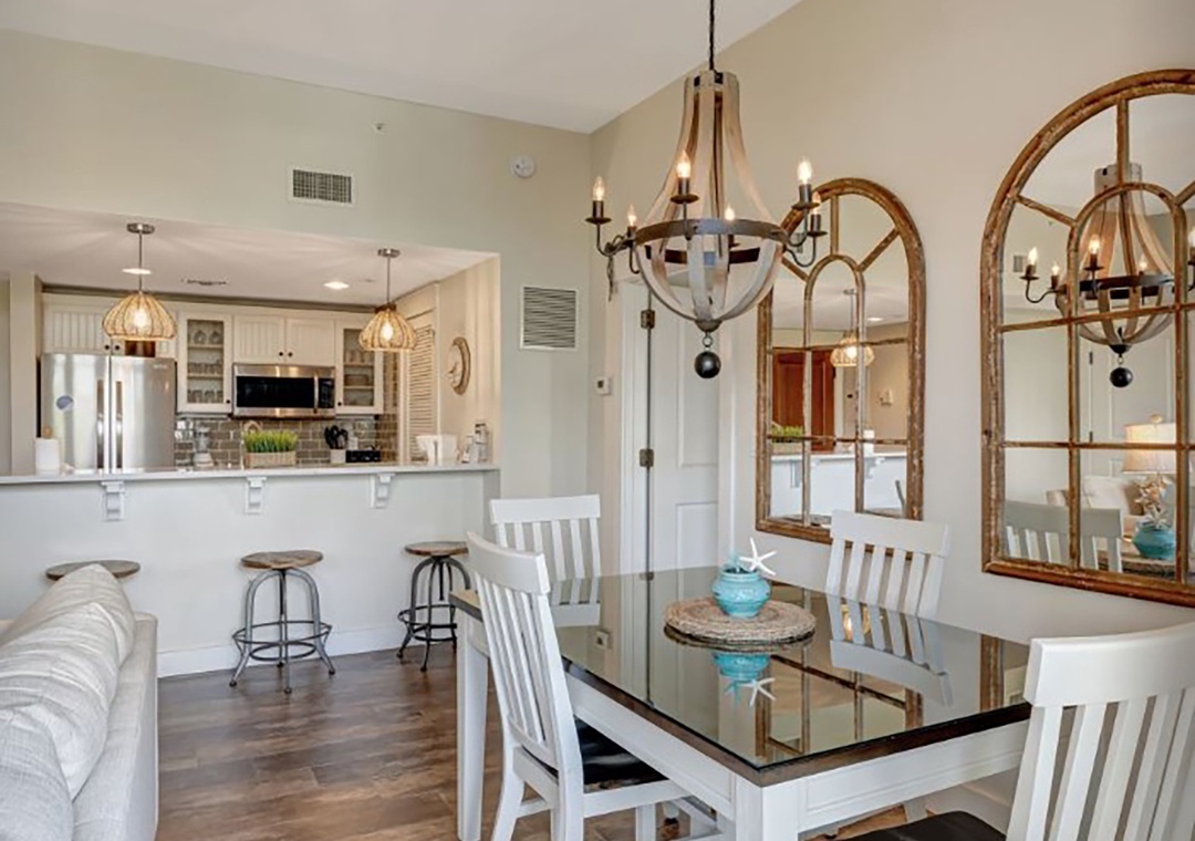 Market Street Inn 545 is a charming 1-bedroom, 1-bathroom top-floor condo nestled in the heart of Baytowne Wharf. Relax on the covered, shaded balcony and listen to the gentle rustle of palm trees while taking in the peaceful view of the village pool. The recently renovated kitchen features sleek modern sinks and faucets, complemented by a stylish tile backsplash that evokes coastal charm. Gleaming stainless steel appliances and quartz countertops shine in the natural light pouring through the 10-ft ceilings. The master suite boasts a king bed and an en-suite bathroom. A twin sleeper chair in the living room provides extra sleeping space, accommodating 3 guests comfortably. Create unforgettable vacation memories at Market Street Inn 545!