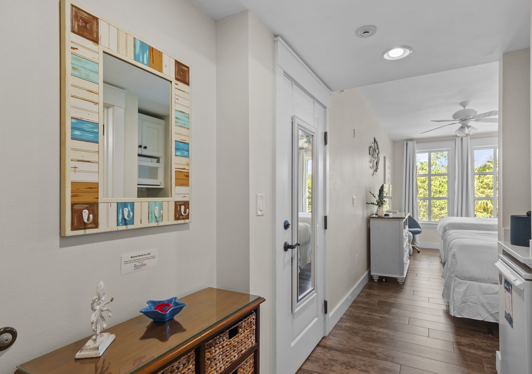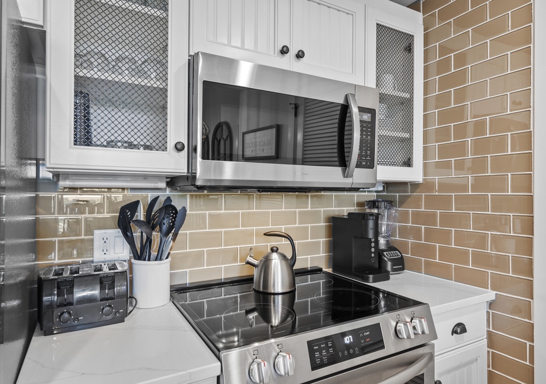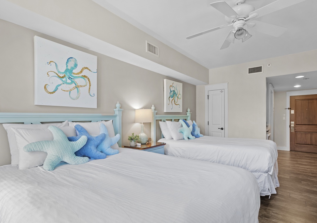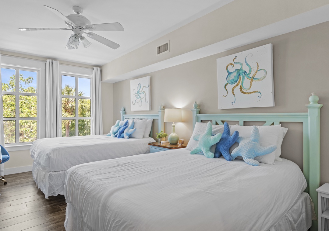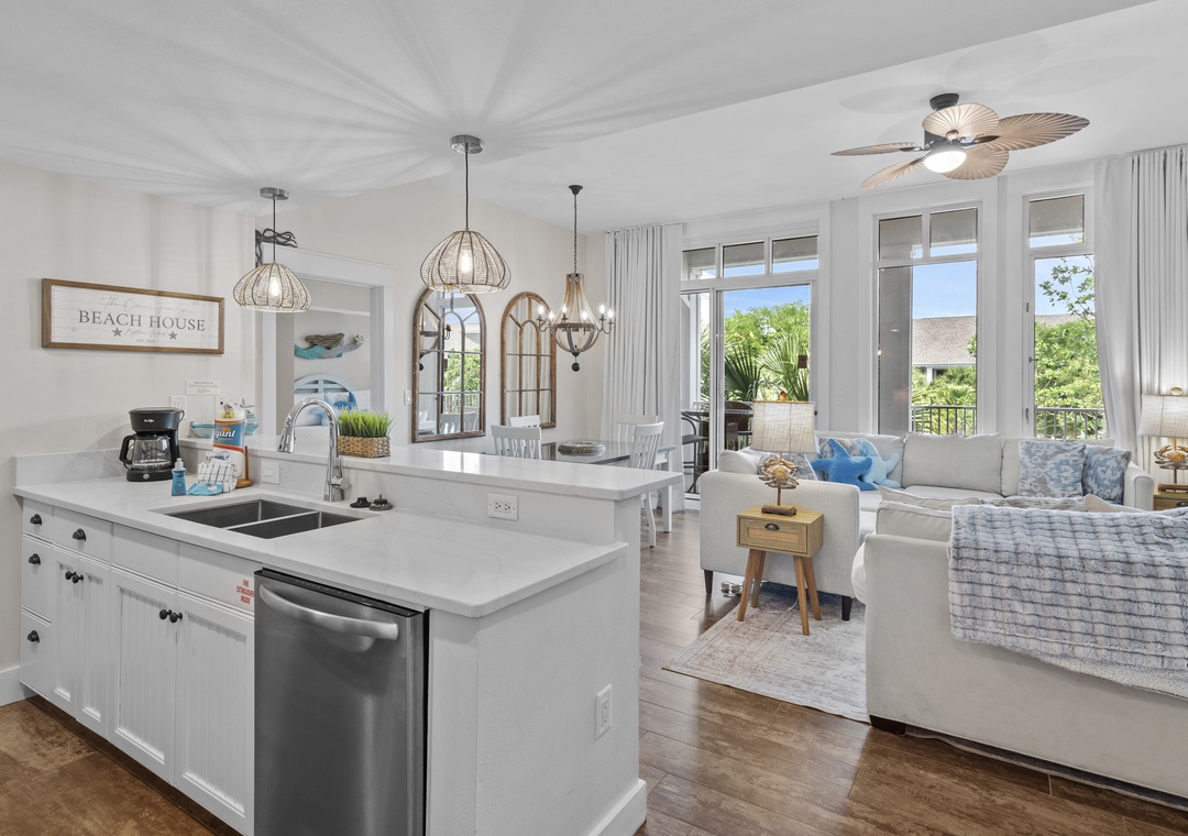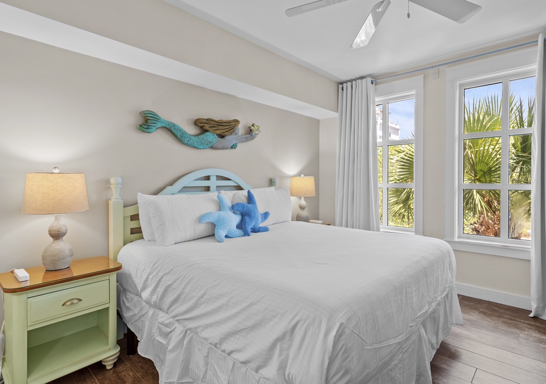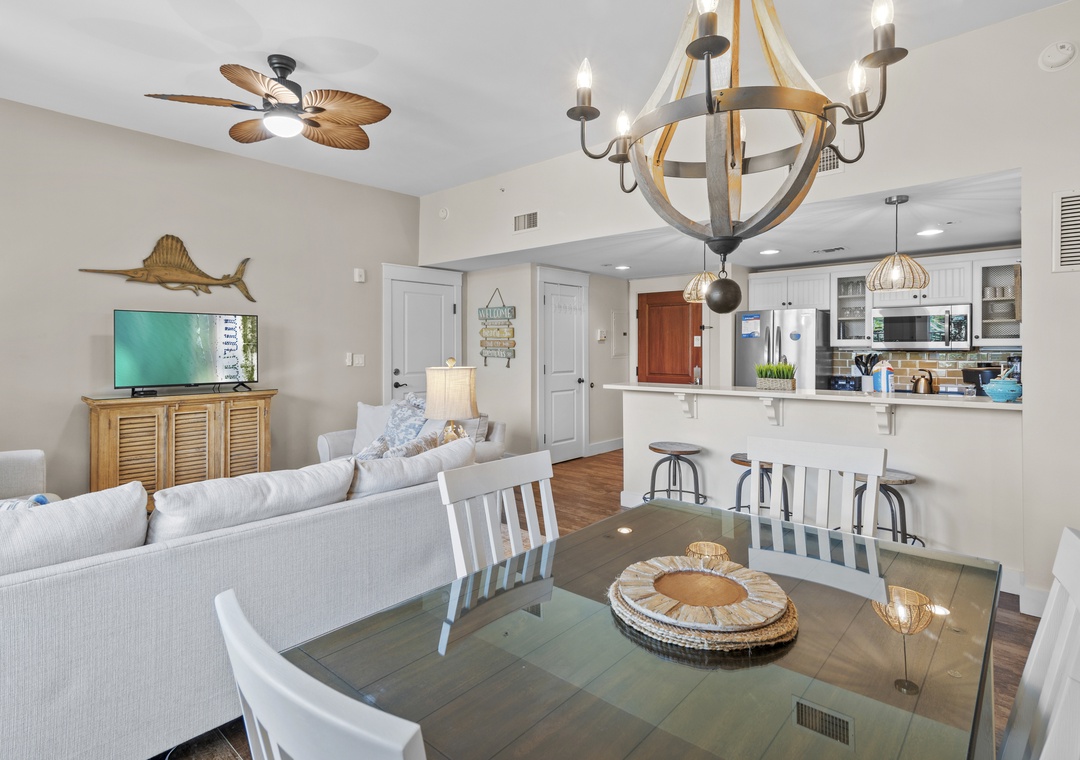 Market Street Inn 545/547 is a charming 2-bedroom, 2-bathroom top-floor condo nestled in the heart of Baytowne Wharf. Relax on the covered, shaded balcony and listen to the gentle rustle of palm trees while taking in the peaceful view of the village pool. The recently renovated kitchen features sleek modern sinks and faucets, complemented by a stylish tile backsplash that evokes coastal charm. Gleaming stainless steel appliances and quartz countertops shine in the natural light pouring through the 10-ft ceilings. The master suite boasts a king bed and an en-suite bathroom. The guest bedroom has 2 queen beds, a kitchenette, and a private entrance. and a shower/tub combo bathroom. A twin sleeper chair in the living room provides extra sleeping space, accommodating up to 7 guests comfortably. Create unforgettable vacation memories at Market Street Inn 545/547!