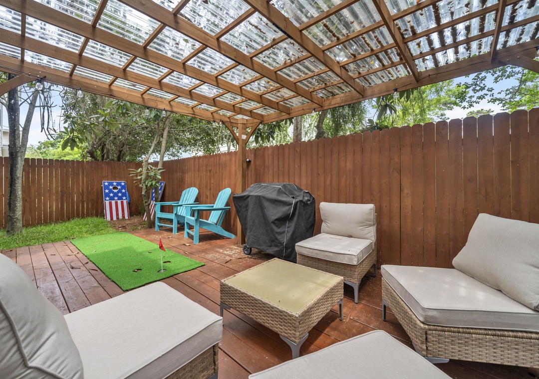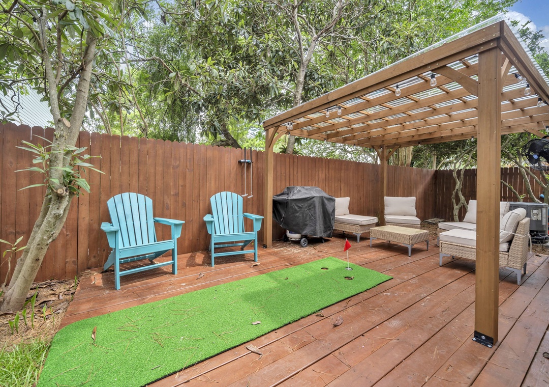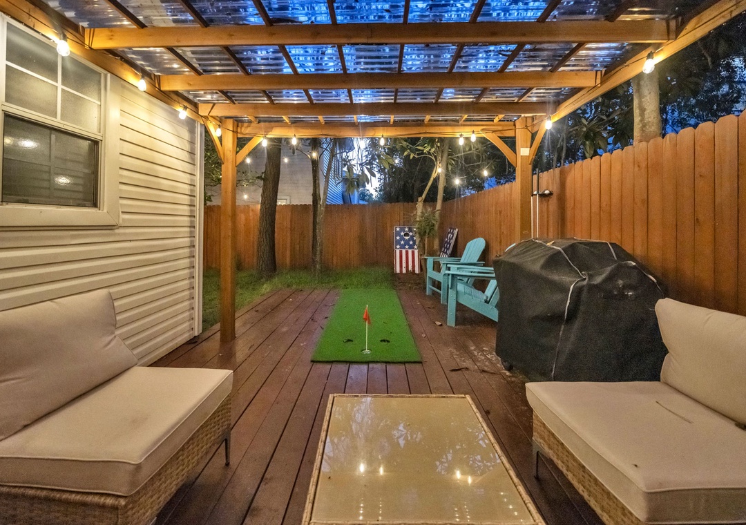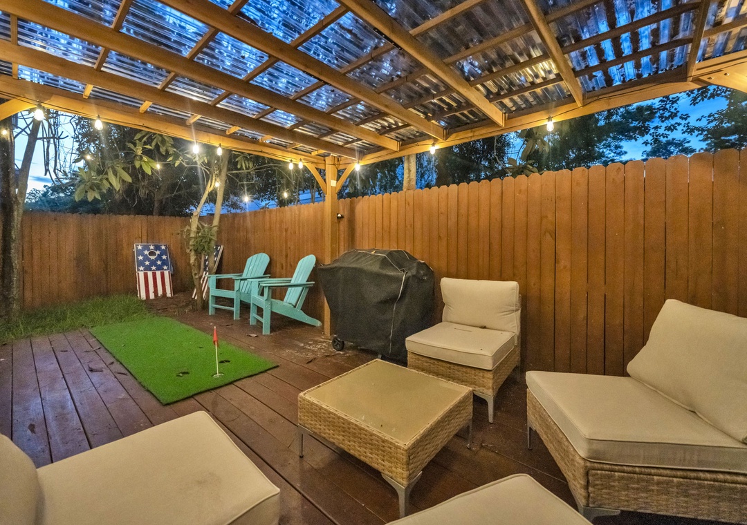 Outdoors, the fully fenced backyard is a haven for relaxation and fun. Amenities include a dedicated dog potty station with a whimsical light-up fire hydrant, a covered pergola with ample seating, a putting green, and a brand-new gas grill. String lights create a charming evening atmosphere beneath the canopy of mature Florida trees.