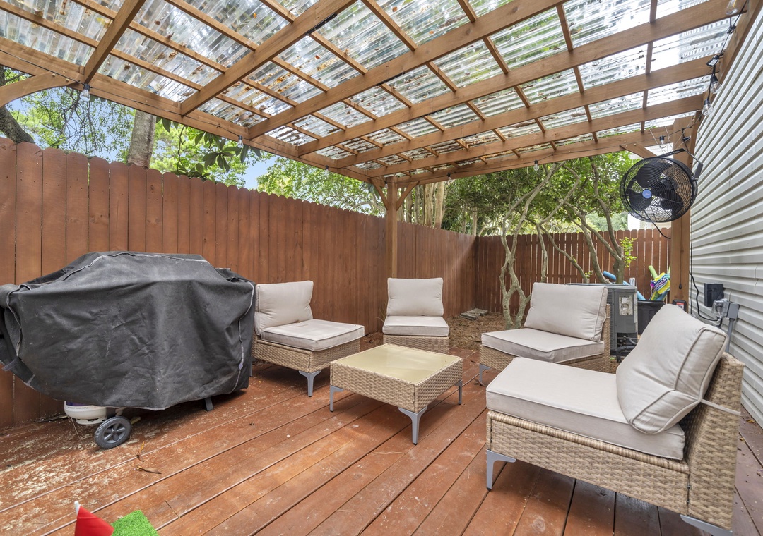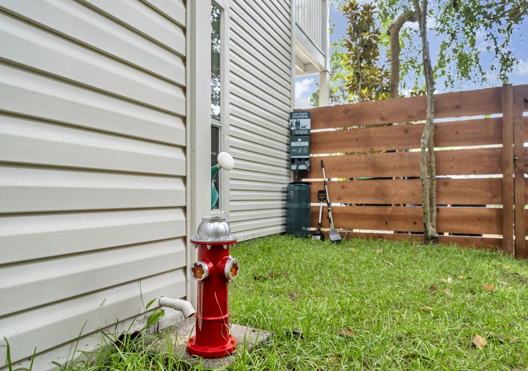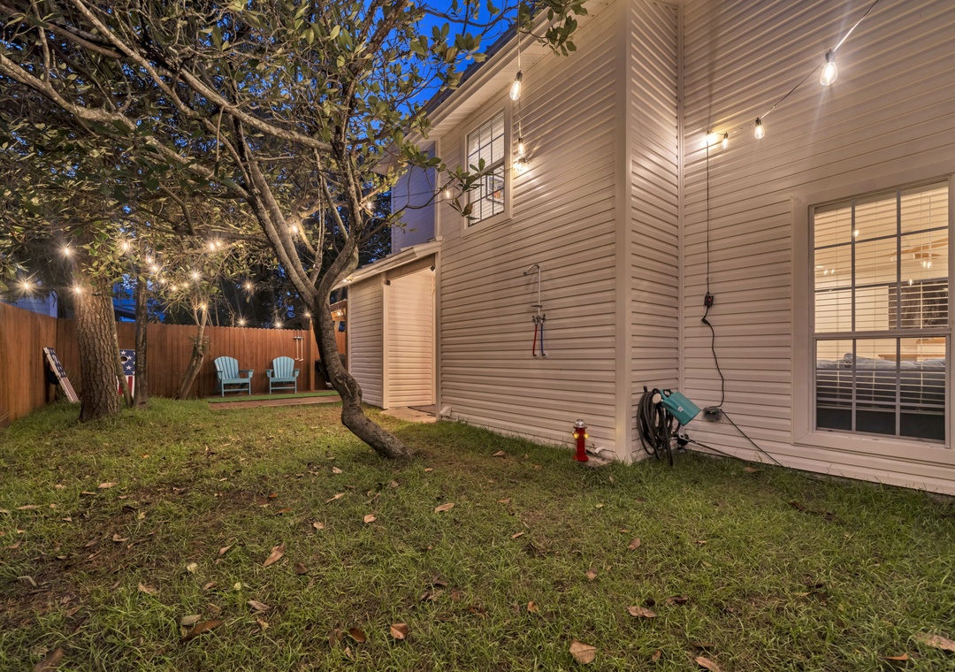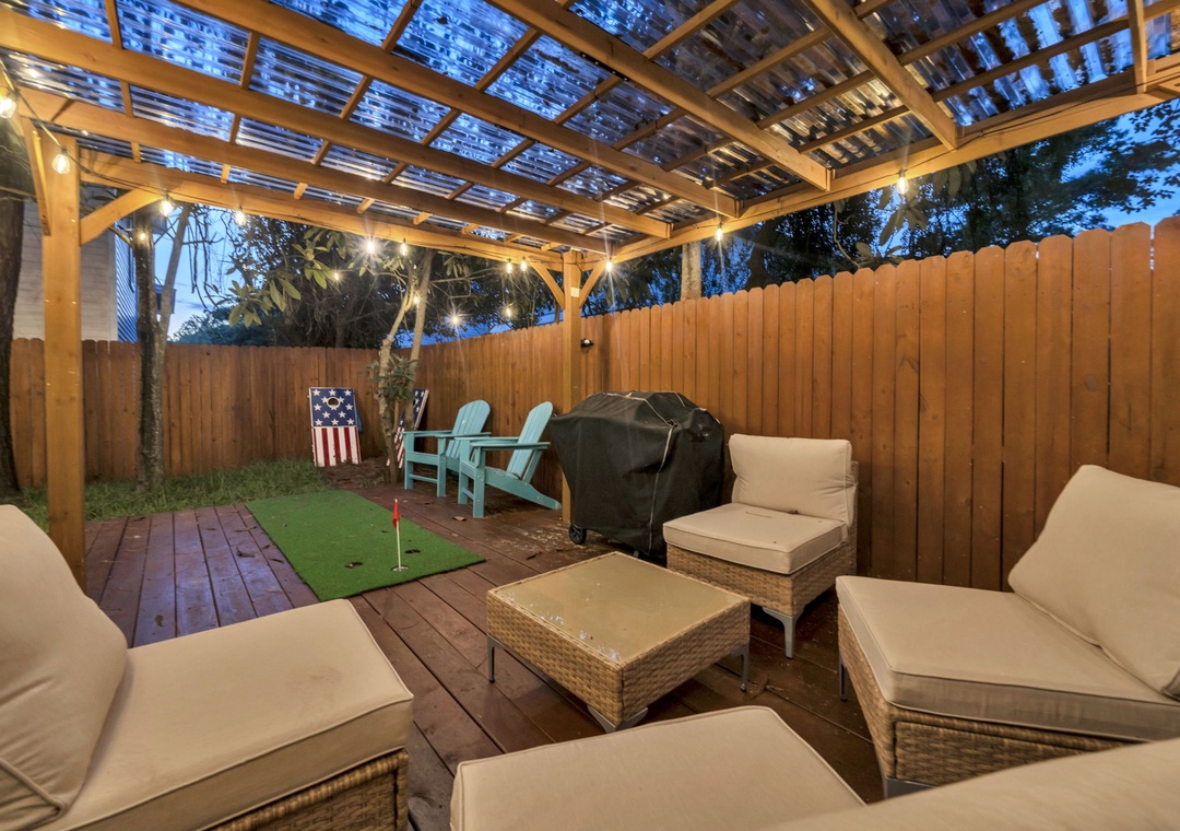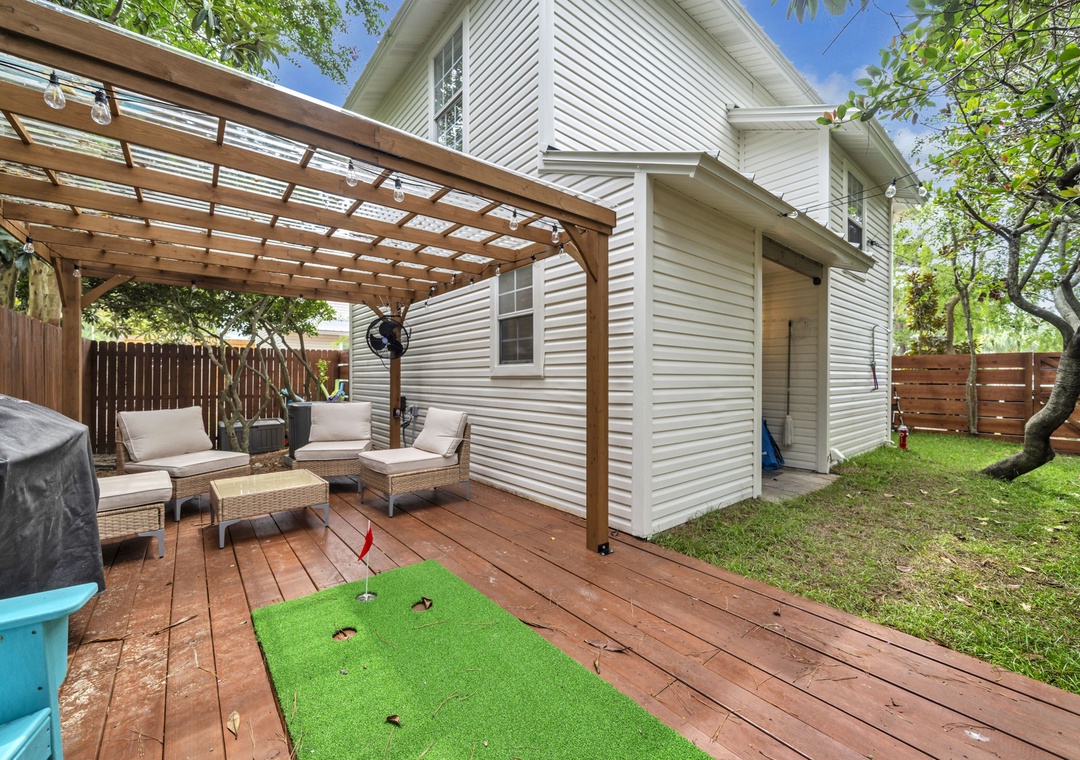 Outdoors, the fully fenced backyard is a haven for relaxation and fun. Amenities include a dedicated dog potty station with a whimsical light-up fire hydrant, a covered pergola with ample seating, a putting green, and a brand-new gas grill. String lights create a charming evening atmosphere beneath the canopy of mature Florida trees.