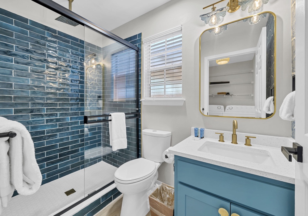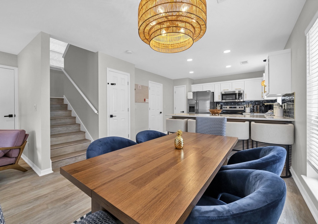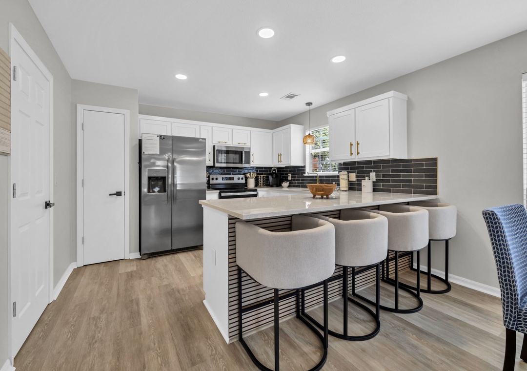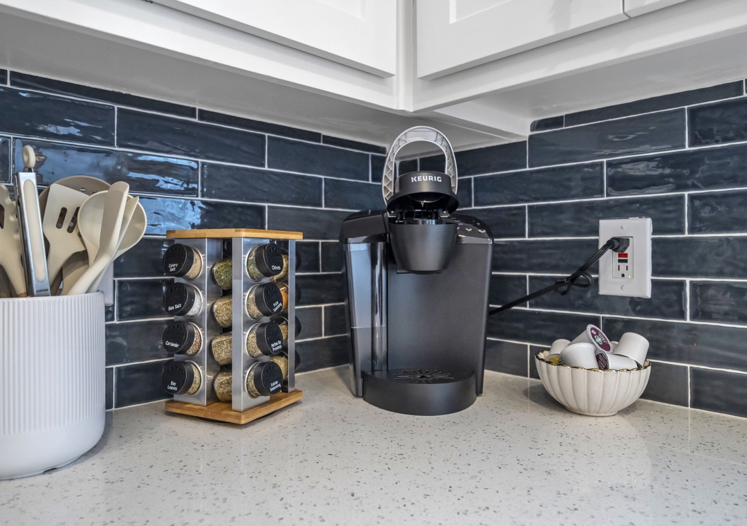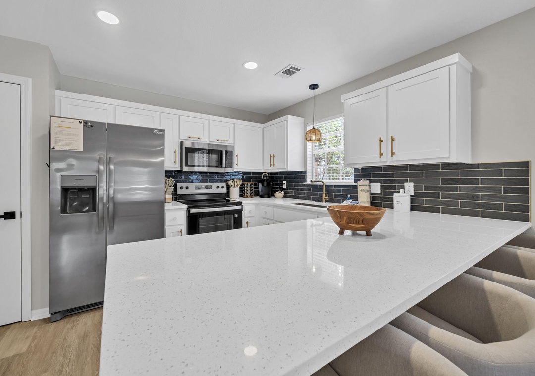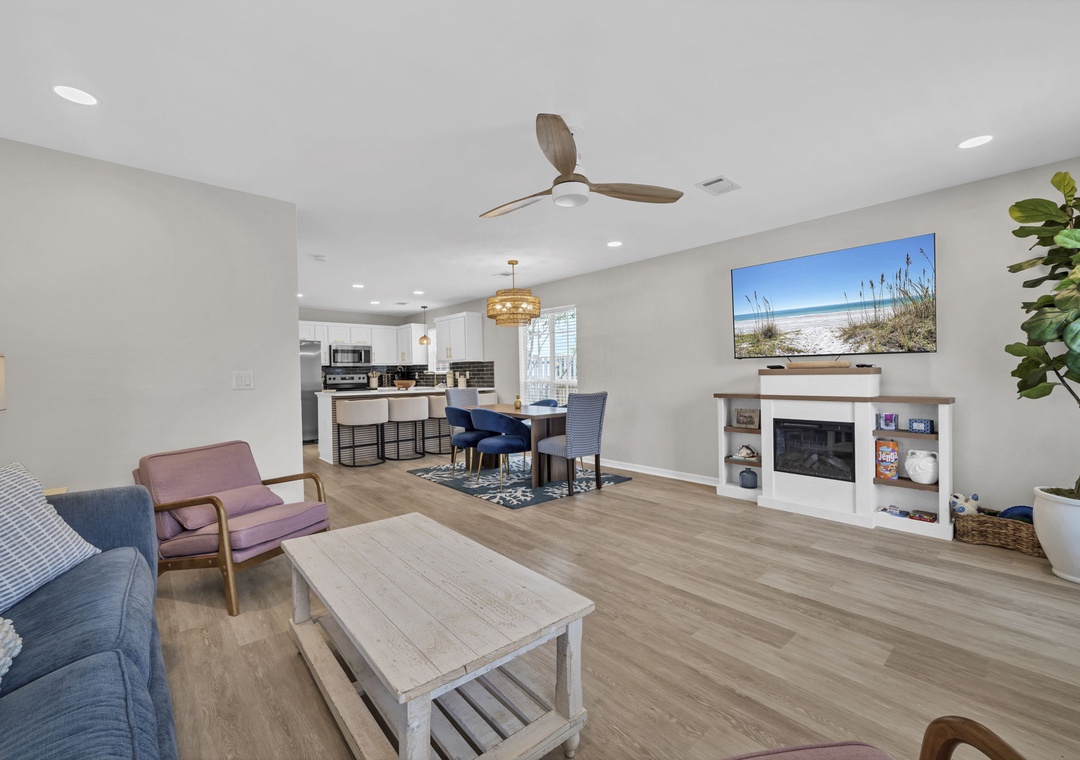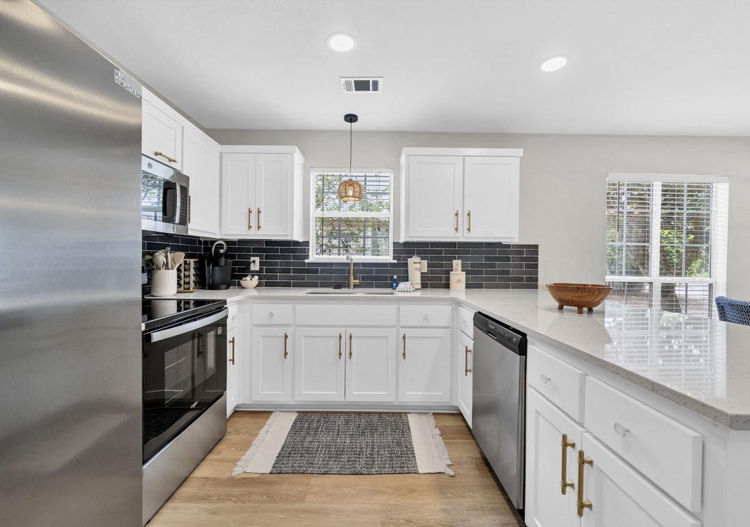 The inviting living room features a plush sleeper sofa (accommodating two guests), a large flat-screen TV, a faux fireplace, and a selection of games for rainy afternoons. The fully equipped kitchen boasts brand-new stainless steel appliances, along with every cooking essential imaginable, including a blender, toaster, and Keurig coffee maker.