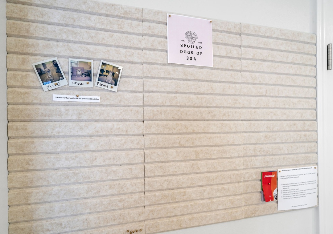 Special touches for pets include complimentary treats, a basket of toys, food and water bowls for all sizes, and a “dog photo wall” where guests can add a Polaroid of their pup to commemorate their stay (and take home a copy). A Roomba is provided for easy cleanup after sandy beach days.