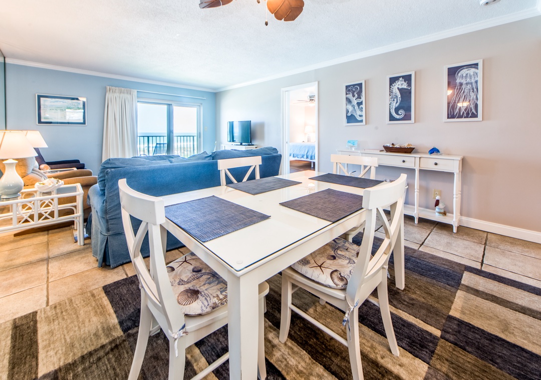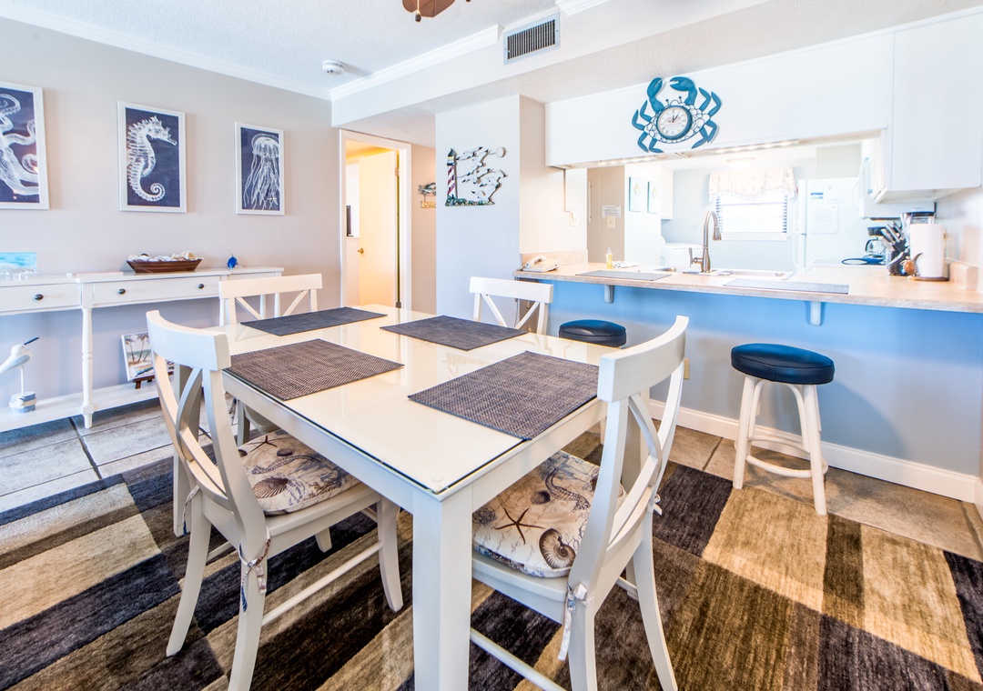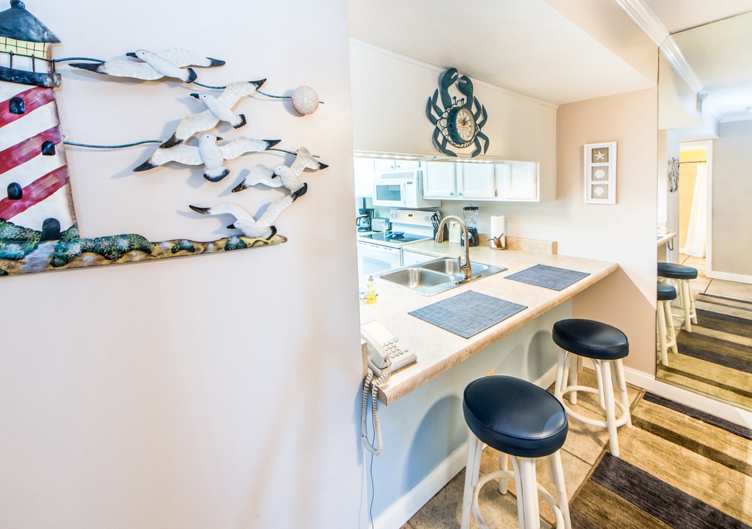 Welcome to Moonspinner 211B. This cheery 2-bed, 2 bath condo features relaxing beachy décor throughout. Stunning views throughout and the spacious balcony will be your introduction to a wonderful vacation! Escape to the master bedroom to find a king bed, en suite, and balcony access. Guests will find 2 double beds in the guest bedroom, allowing the condo to sleep up to 6 comfortably. The kitchen’s open layout will delight your chef! After a day on the beach, unwind in the living room with your favorite people and a great movie. Come make lasting memories at Moonspinner 211B!