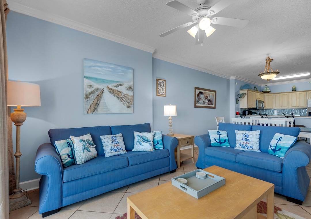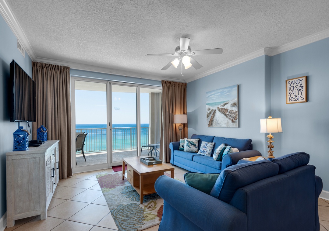 Welcome to Ocean Villa 1101! This beautifully decorated 2BR/2BA condo is located Gulf Front in Panama City Beach. This exclusive complex has high-speed elevators and only 125 total properties. If you did the math, that come out to only 6 units per floor! Enjoy spectacular Gulf views from the balcony, living room, and master bedroom. Relax and enjoy your favorite beverage on your large corner balcony as you take in the view of the white sand beach and watch the waves crash against the shore. This unit has tile flooring throughout, stainless steel appliances, and granite counters in the kitchen. With a king bed in the master, two queen beds in the guest room, and a sleeper sofa in the living room, this spacious unit sleeps up to 8 guests comfortably. As an extra feature, this unit includes Seasonal Beach Chair Service for the guests. With resort amenities and stunning beachfront views, Ocean Villa 1101 is sure to be your favorite Panama City Beach vacation spot!