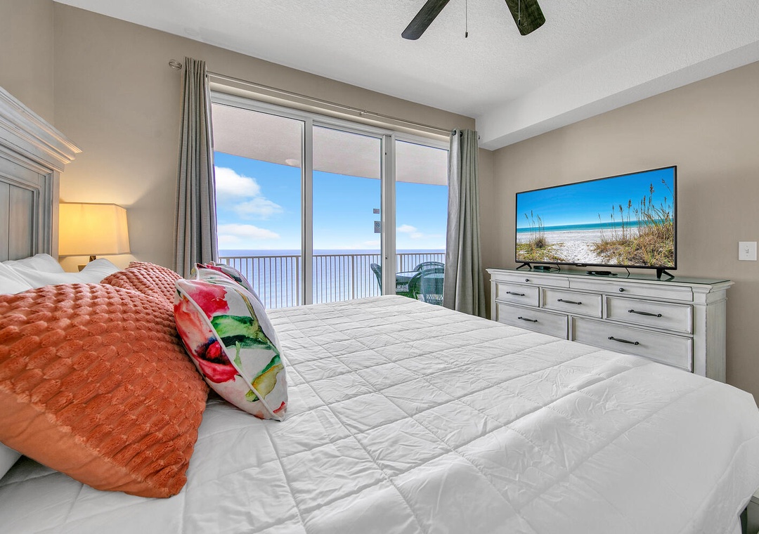 Welcome to your getaway at Ocean Villa 1803! This 2BR/2BA condo sits right on the Gulf, this ocean retreat offers breathtaking vistas from the balcony, living room, and master bedroom. Unwind and savor your go-to drink on your very own private balcony, soaking in the panoramic scene of the white sands and the rhythmic dance of the waves. Drift off in the master bedroom's king bed, and the guest room a queen bed. Plus, the living room hosts a queen sleeper sofa, comfortably accommodating up to 6 beach-loving guests. With resort-style perks and awe-inspiring beachfront panoramas. Prepare a delicious meal in the well-equipped kitchen. If you want to keep your fitness routine, the on-site gym will have everything you need. Connect to the magic of the gulf and fulfill your beachfront vacation dreams at Ocean Villa 1803!