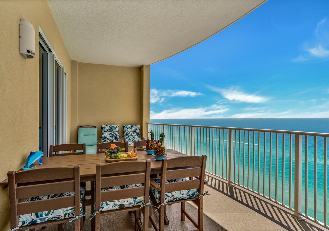Welcome to Ocean Villa 2303! This is a Top Floor Penthouse with 10-foot ceilings, crown molding, and a huge balcony where you can enjoy spectacular views The Penthouse is a 2-bedroom 2-bath condo that features a spectacular 180-degree panoramic Gulf view from the balcony, living room, and master bedroom. This condo offers two master bedrooms. The first master has a King-size bed with balcony access. The second master has a Queen-size bed and there is a queen sleeper sofa in the living room. This condo can comfortably sleep up to 6 guests. Whip up a delicious meal in the fully equipped kitchen that features stainless steel appliances and granite countertops. The inviting living room is the perfect spot to enjoy a movie and some popcorn. Relax and enjoy your favorite beverage on your large private balcony as you view the white sand beach and watch the waves crash against the shore. For added convenience, a washer and dryer are available within the condo. With resort amenities and stunning beachfront views, Ocean views, Ocean Villa 2303 is sure to be your favorite Panama City Beach vacation spot!