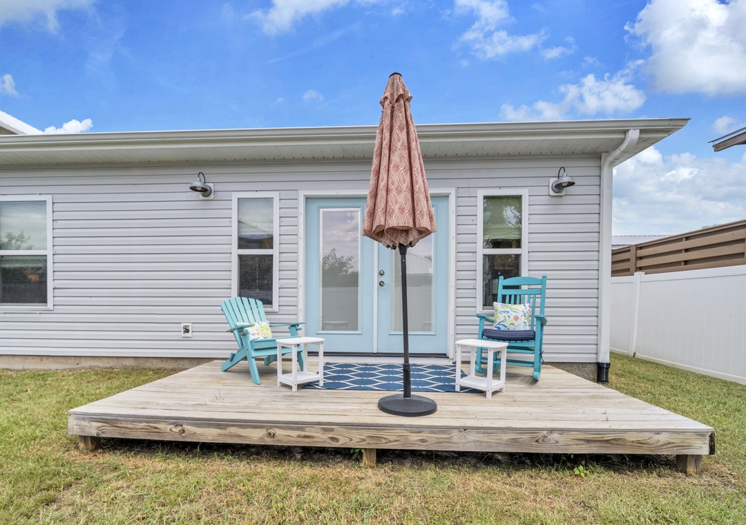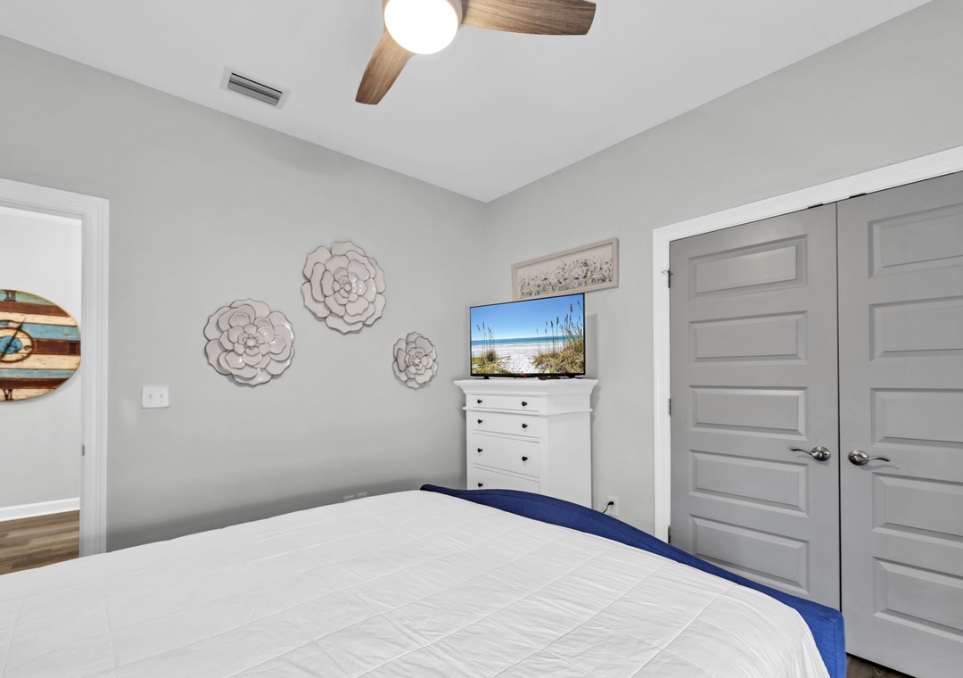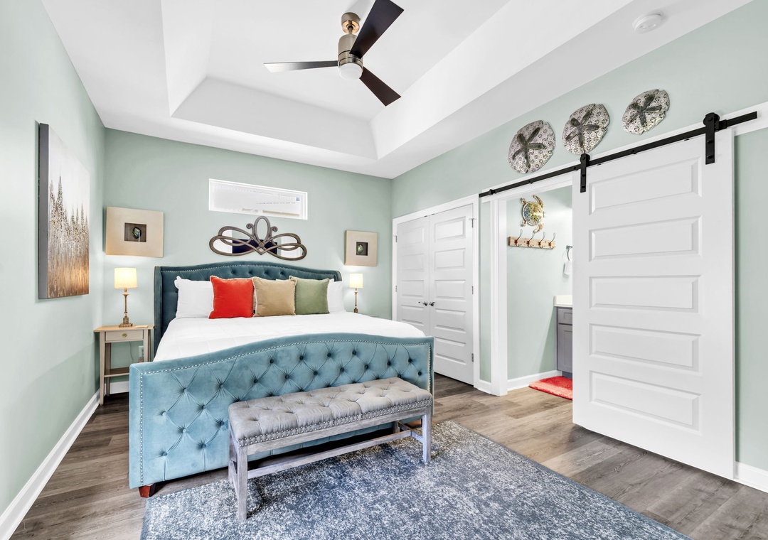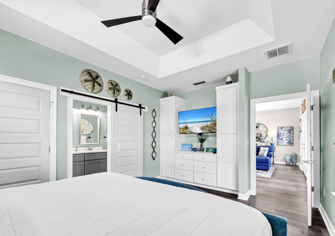The king master suite offers a private retreat with a stylish sliding barn door, double vanity, and tiled walk-in shower, plus built-in storage and a wall-mounted TV. Two additional bedrooms, both with king beds, share a full bathroom with a shower/tub combo. Out back, a fully enclosed yard provides a safe space for kids and pets, while a raised wooden deck invites adults to relax outdoors. With its modern comforts, coastal charm, and unbeatable location, Palms Beach Oasis is the ideal getaway for your next beach vacation.